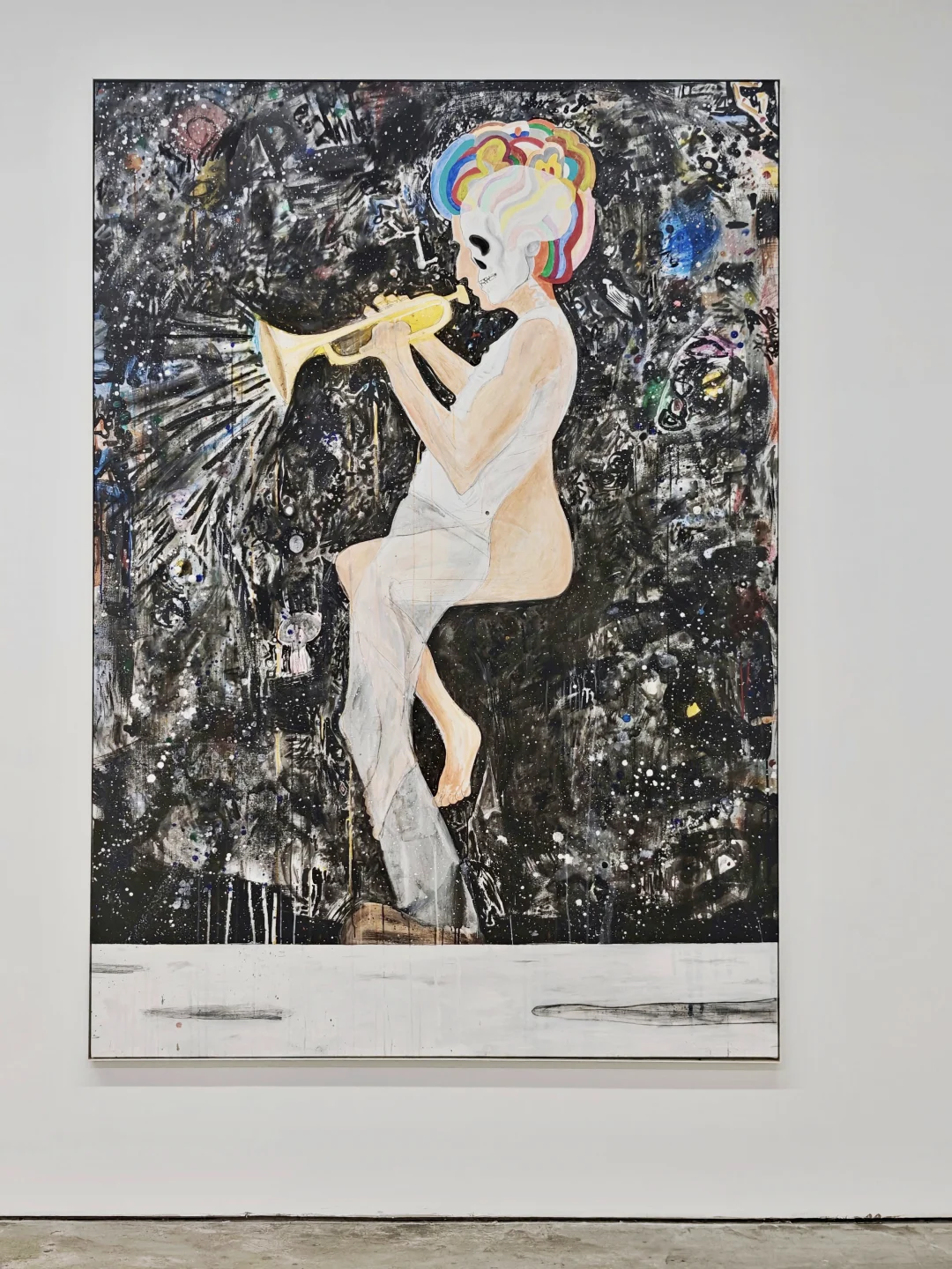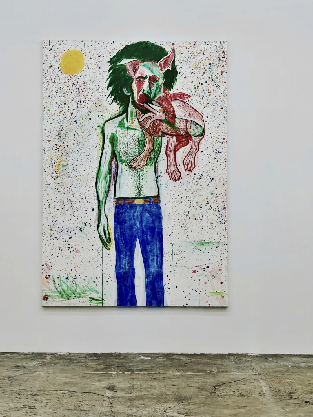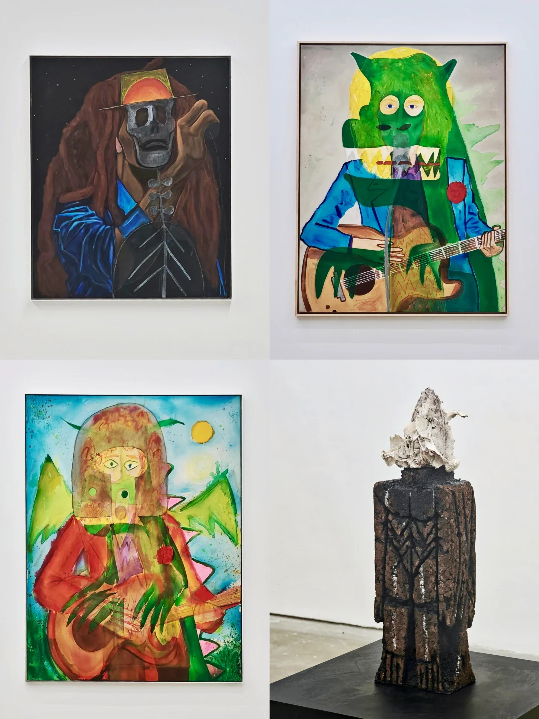艺术家的绘画像是一个“视觉狂欢剧场”,高饱和色彩叠加皮影般半透明形象,既有Bob Marley、George Harrison等公共符号,也有私人宠物形象,打破肖像完整性,借破碎符号隐喻当代人身份困惑,从互联网图像和艺术史碰撞中,塑造诡谲反英雄。