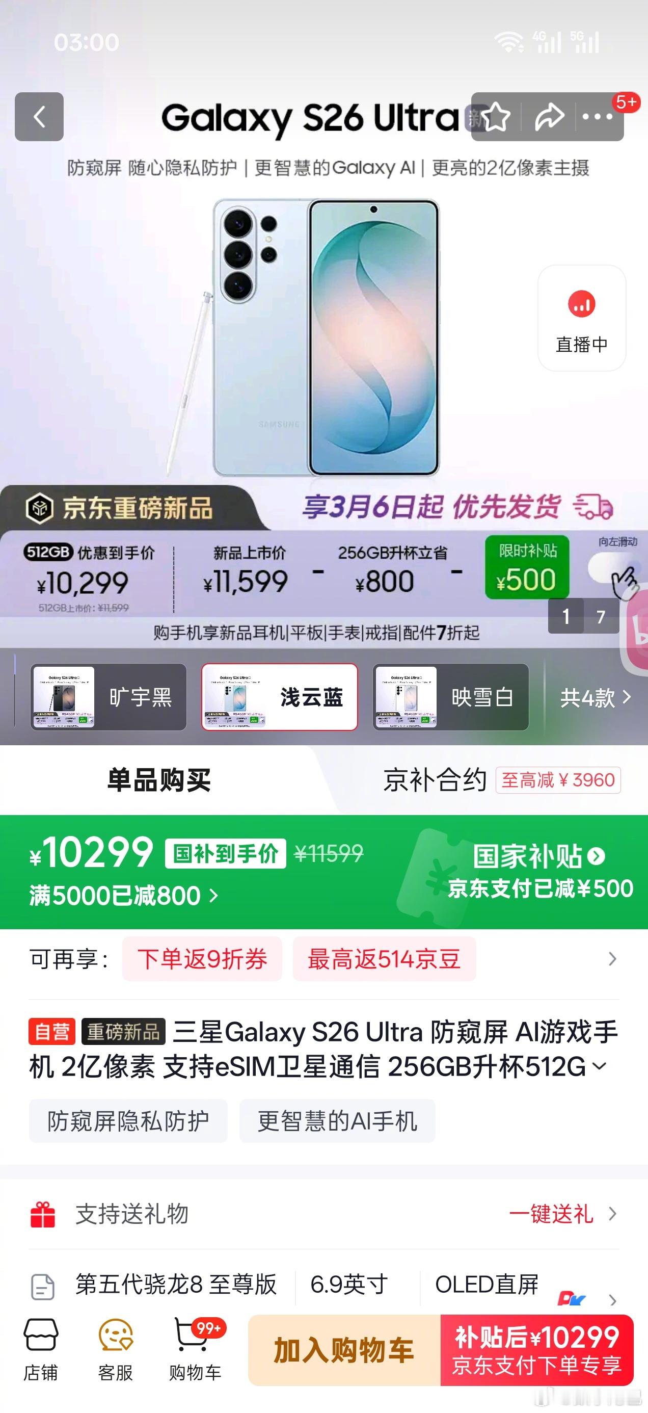 S26 Ultra12+256 9999 官网暂未开售12+512 11599国补+预售优惠到手 1029916+1T 13999国补+预售优惠到手 12699