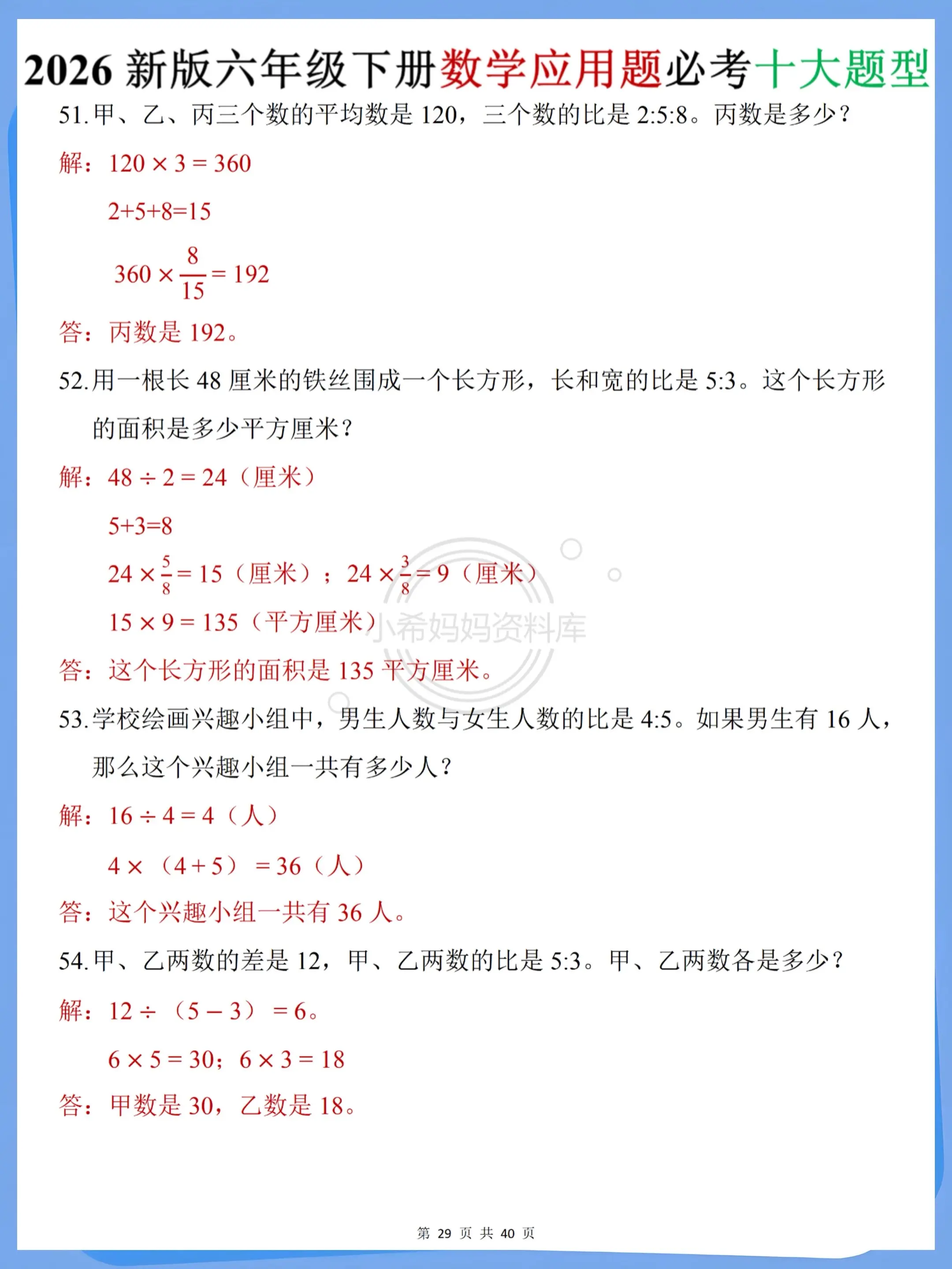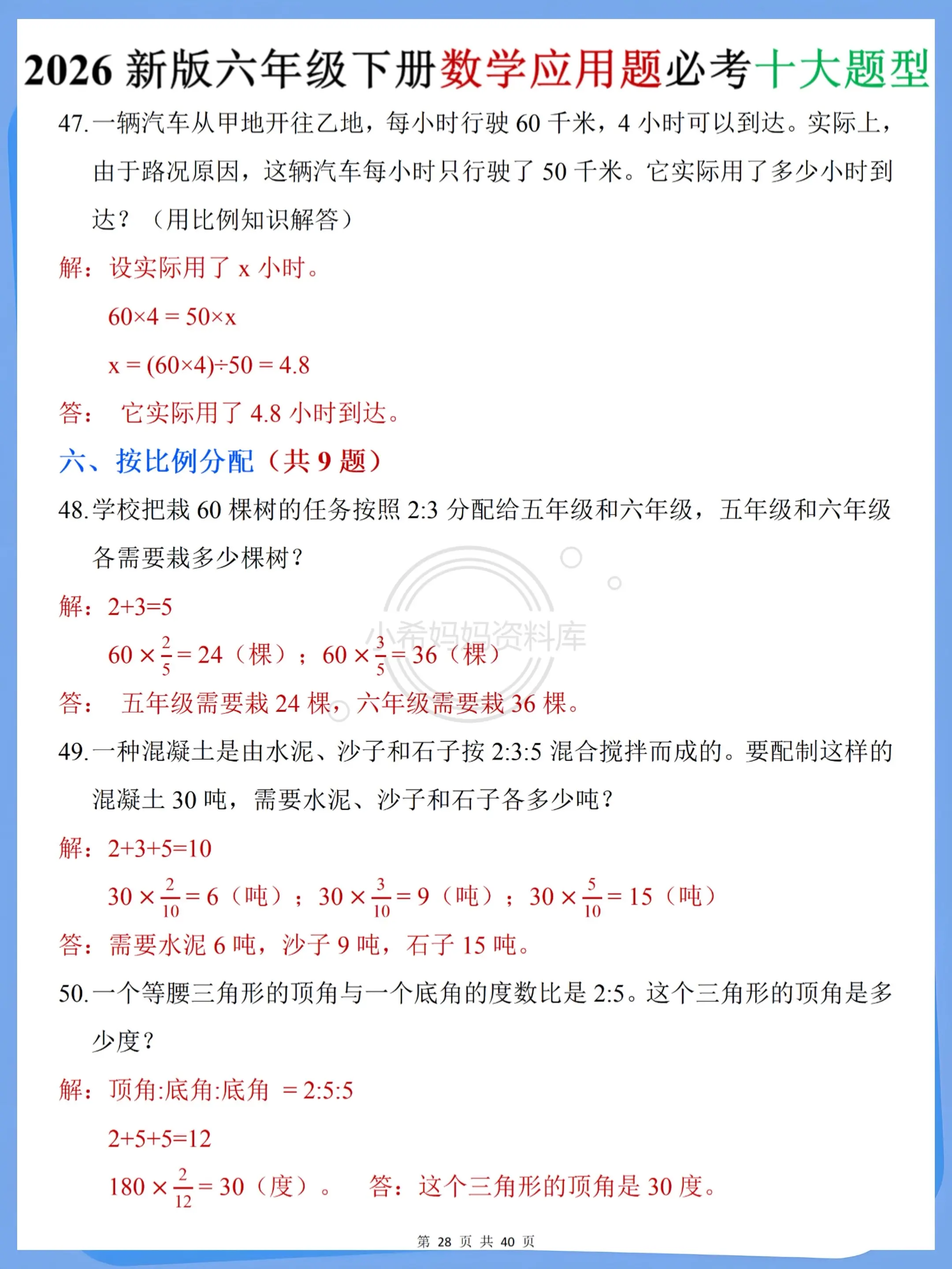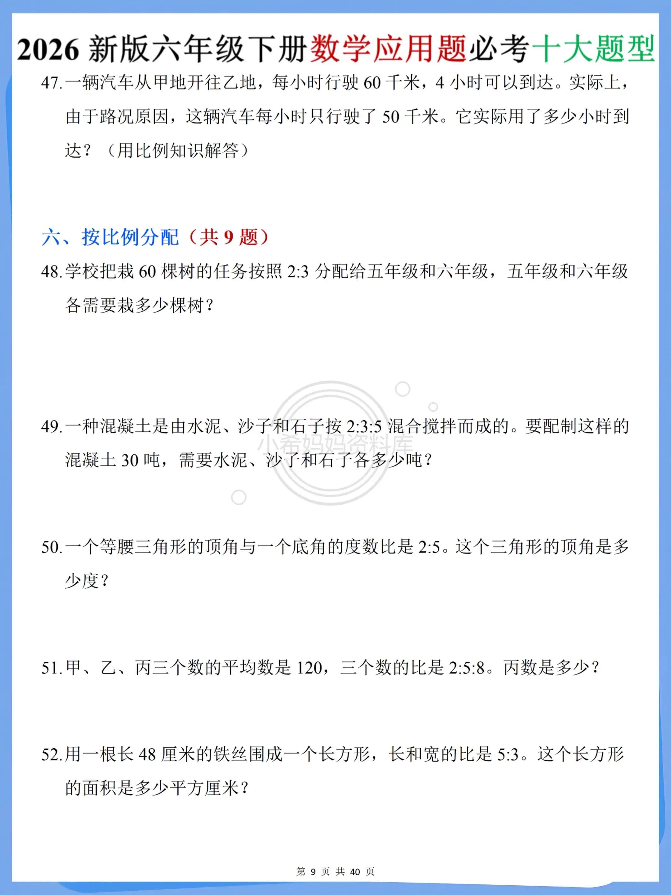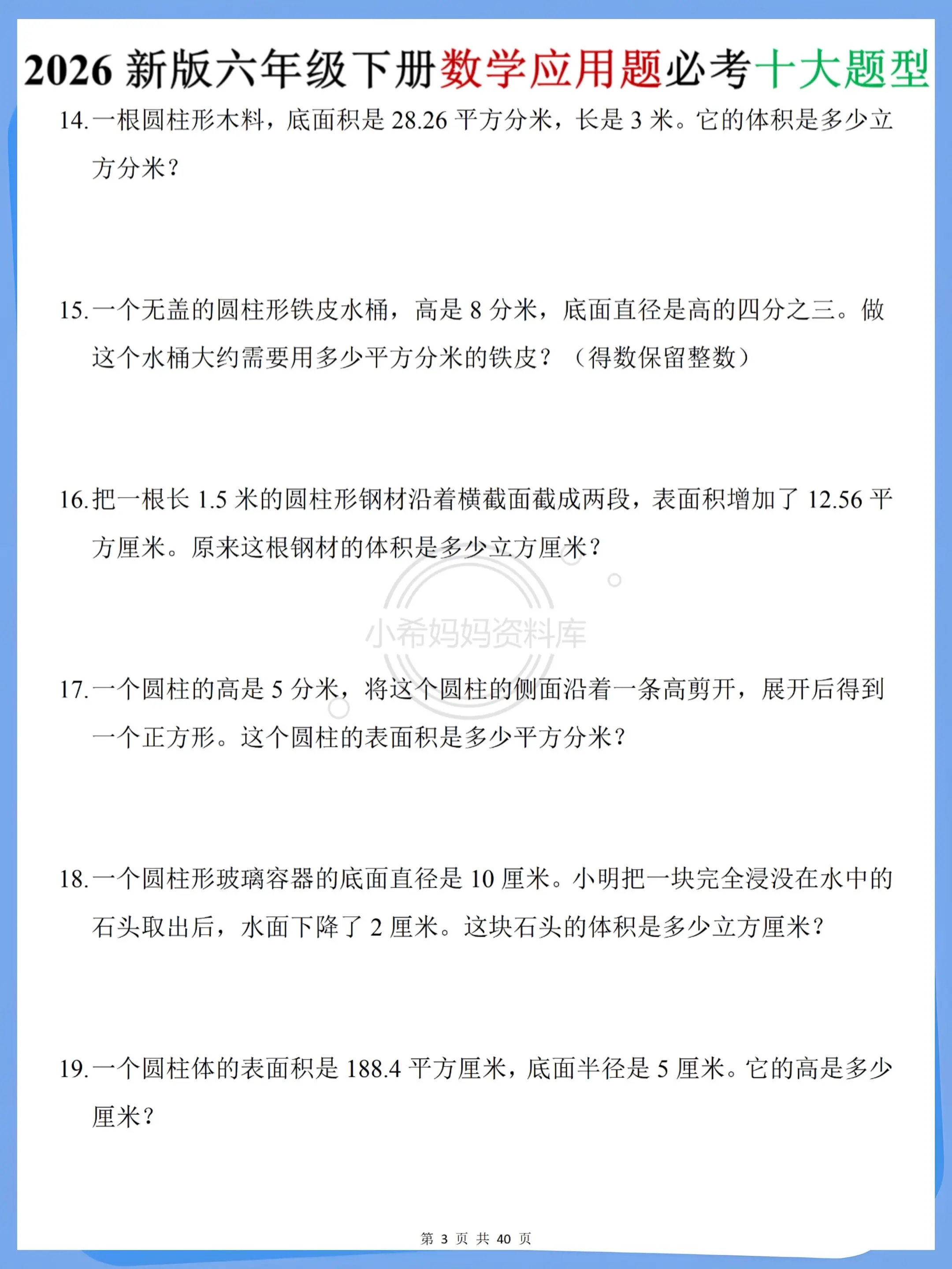 2026新版六下数学10大必考应用题。2026新学期开学冲刺📚六年级下册数学别盲目刷题 这份十大常考必练题型,精准对标校内重难点,全覆盖百分数、圆柱圆锥、比例尺、正反比例、鸽巢问题核心考点,基础→中等→提高分层练,适配单元测、期中期末与小升初衔接✅ 题型经典不偏怪,解题思路一步到位,计算、应用题双突破,孩子练完做题不卡壳,开学稳拿好成绩,家长快给孩子打印练起来~