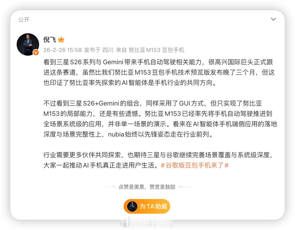 从一问一答的AI互动再到手机的自动驾驶,努比亚总裁倪飞回应谷歌版豆包手机 毕竟先有努比亚豆包,再有三星Gemini。(慢了3个月)
