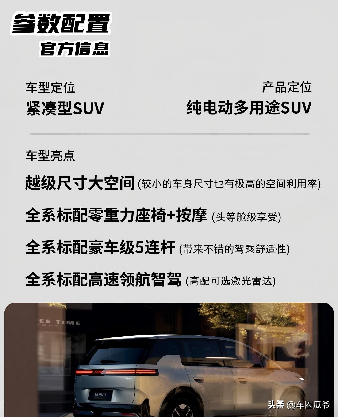 针对底盘颠簸问题,埃安 N60 还直接配备豪车级后五连杆独立悬架,滤震性和操控稳定性拉满,过减速带、坑洼路面时,车身颠簸频率远离大脑前庭敏感区,不会因持续共振引发头晕,这是普通 10 万级SUV难以企及的配置。