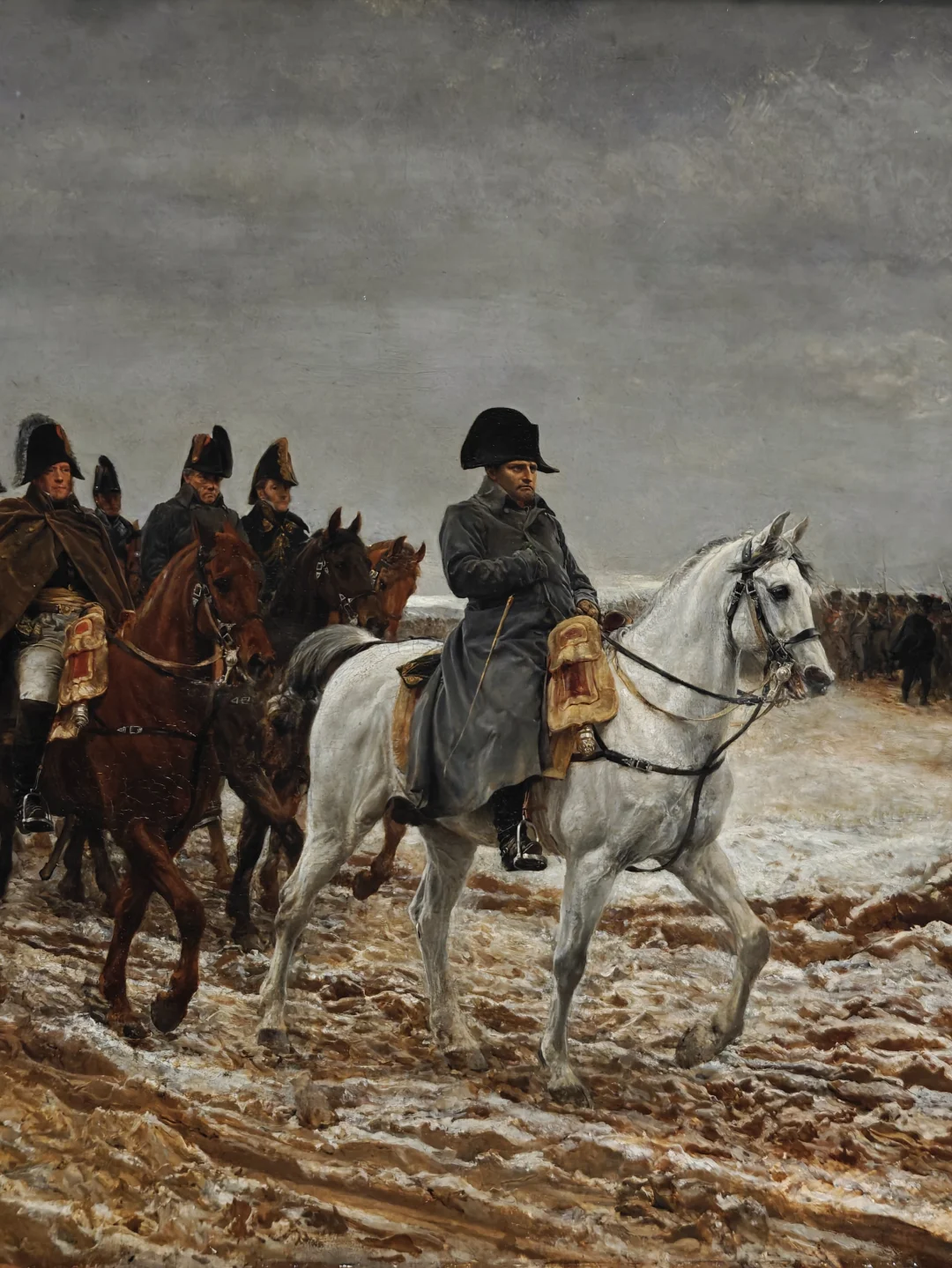 和大众印象中大卫那幅副本无数的拿破仑的意气风发相比,他这幅代表作中的拿破仑和军队在冰高雪冻的荒原中艰难行进的场景显得凄苦。拿破仑看起来十分疲惫,但眼神依旧坚定,坐骑白马刻画写实。另一幅幅尺寸大约不过A4的作品充满细节。