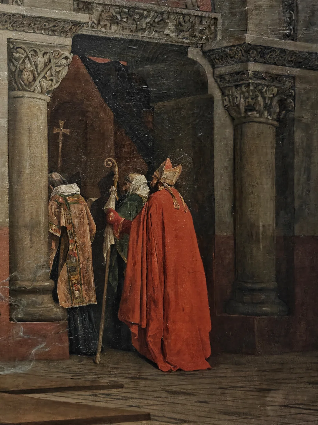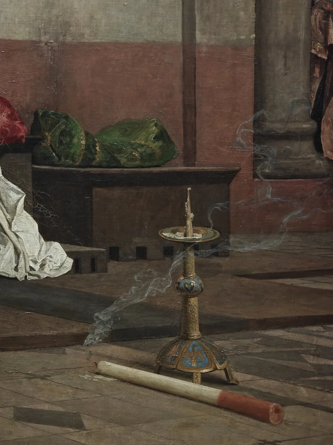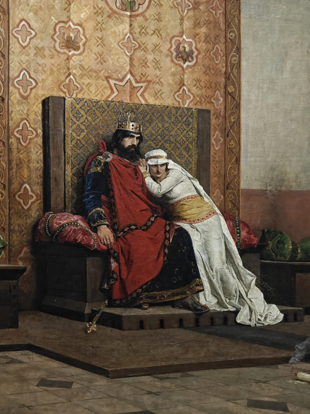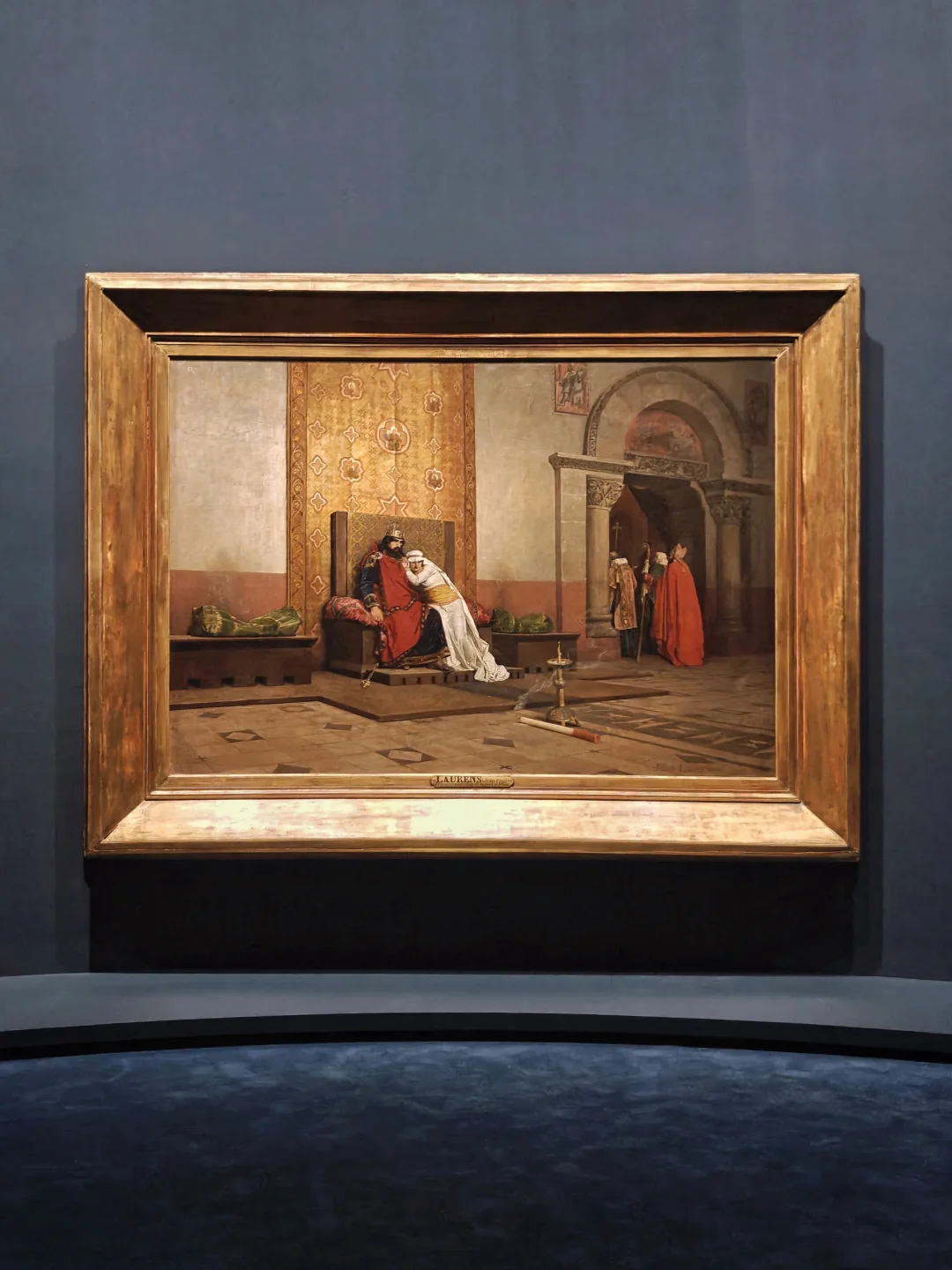 劳伦斯是著名的反教权主义艺术家,常以中世纪宗教斗争为主题揭露教权压迫。这幅巨作描绘法国国王罗伯特二世因娶表妹而被教皇逐出教会,宣判后神父们离去,留下虚脱的君主和沮丧的妻子。通过自然主义手法和戏剧性光影对比,聚焦坠落的权杖与倾倒在地的宗教仪式大蜡烛等细节,打破了新古典主义舞台化叙事的传统。