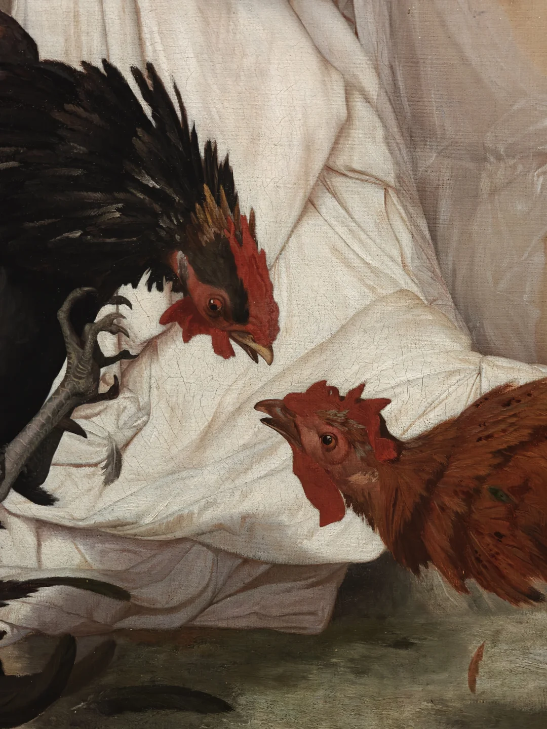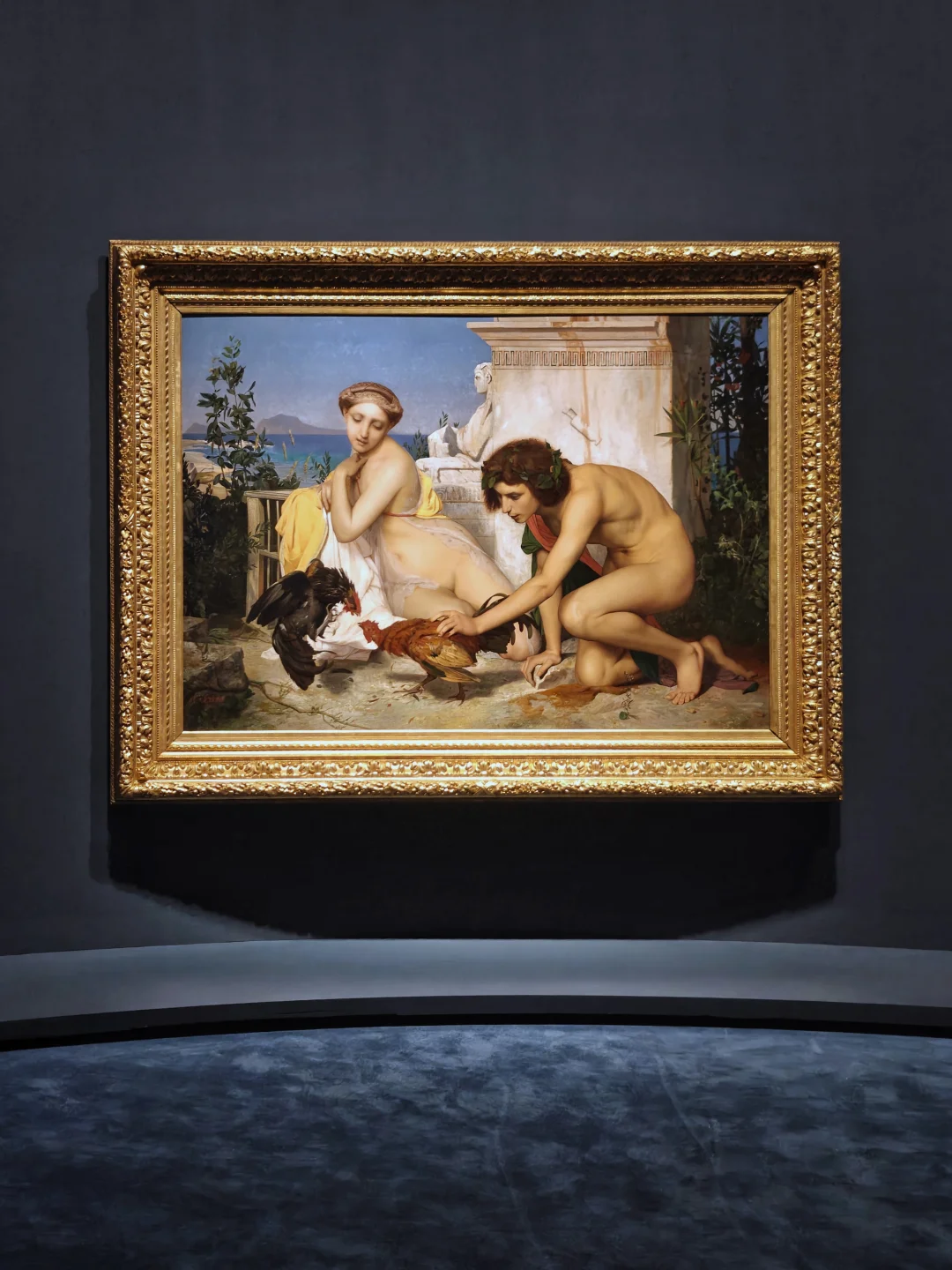 热罗姆是学院派著名画家和雕塑家,深受拿破仑三世赏识。他表面上是新古典主义的继承者,实际上是浪漫主义的热衷者,在严谨的构图、色彩中表现出强烈的中东情调。他凭此作赢得了当年巴黎沙龙展三等奖,法国邮政发行纪念他逝世100周年时使用的就是这幅画。和刻画传神的斗鸡相比,人物倒是有些逊色了。大理石和薄纱的质感表现非常细致。