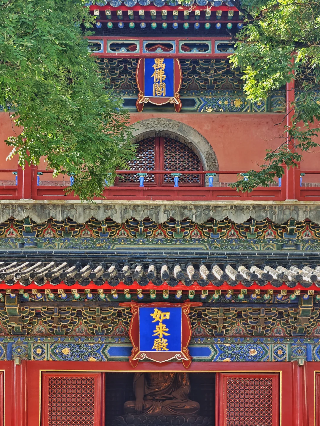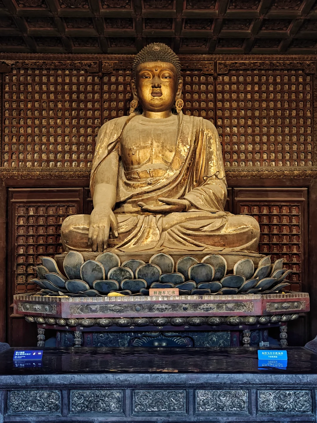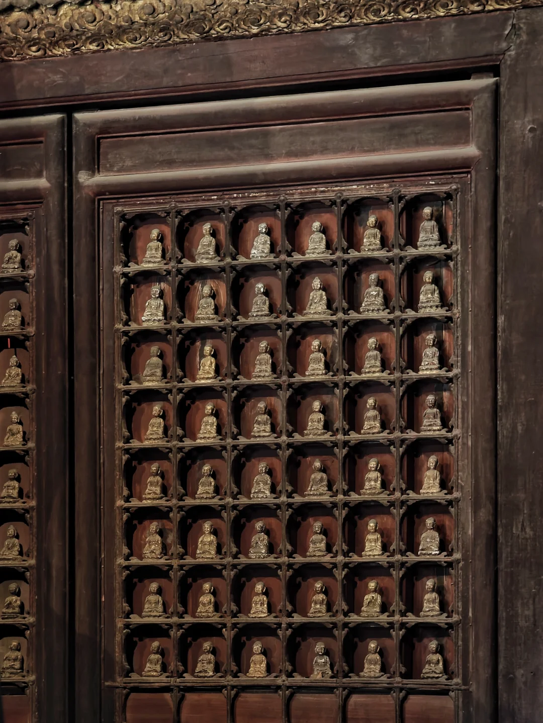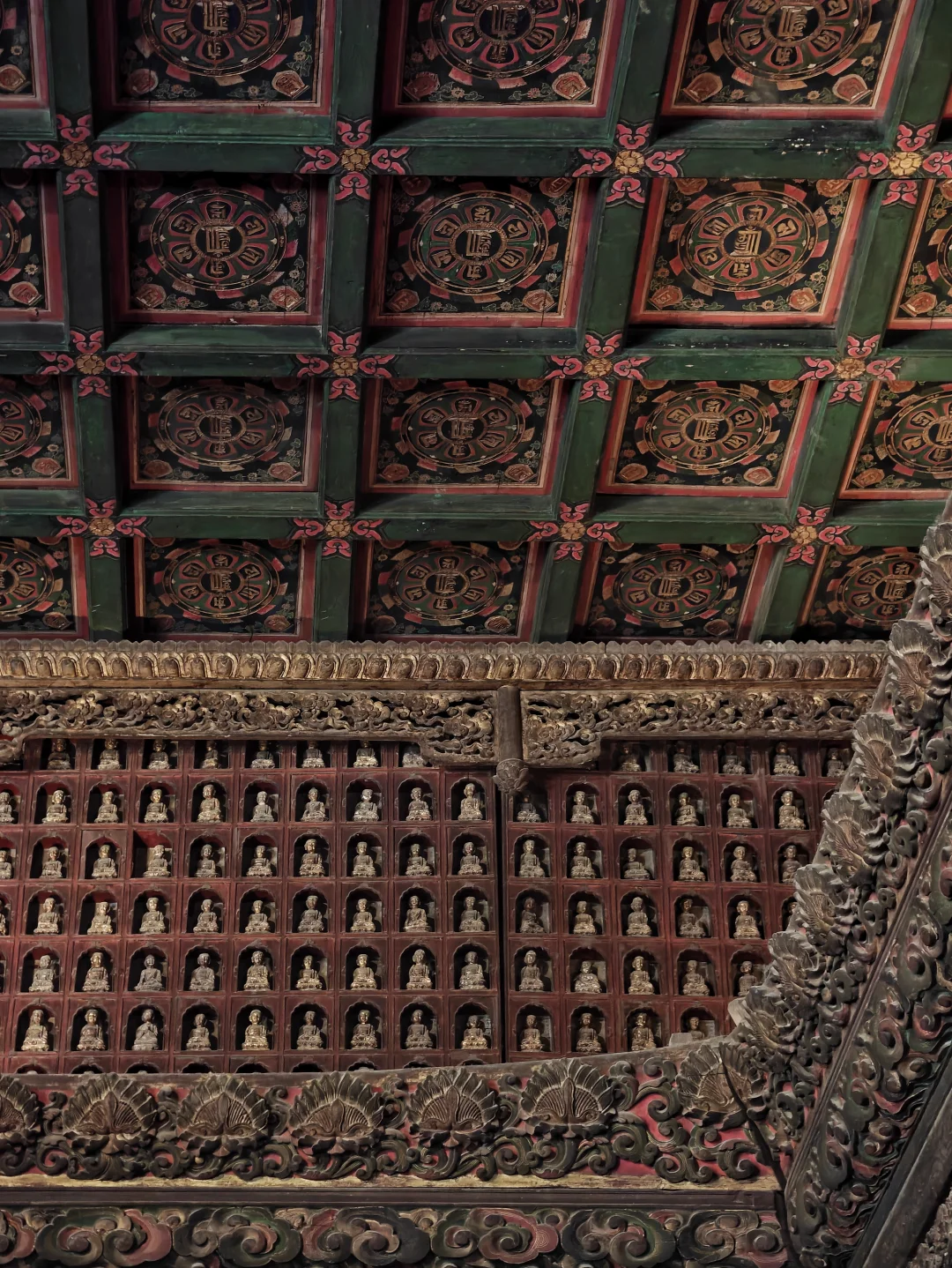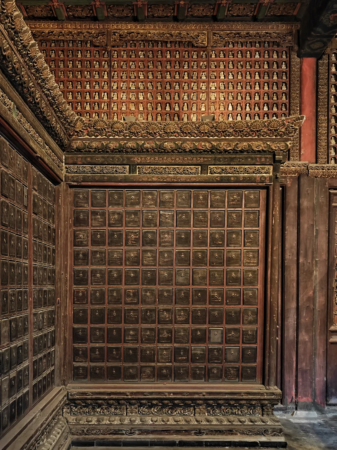 智化寺\n⏰9:00-17:00 周一闭馆\n📍北京市东城区禄米仓胡同5号\n🎫20(每周三免费200人)\n📢免费讲解老师讲得非常好,建议跟听(9:30和14:00)\n\t\n🛕智化寺完整保留了明早期官式建筑特征:屋顶举折沿用宋制(上陡下缓),步架深度自檐至脊递减;保留宋元遗风(如生起、侧脚),同时发展出简化构造(如通柱式楼阁)。梁思成评价其为\"小半部明代官式建筑史\",是研究宋元至清建筑演变的关键实物。\n\t\n👉本篇介绍每个殿内主要看点,总体介绍见上篇。\n\t\n🛕山门:英宗赐汉白玉横匾“敕赐智化寺”\n🛕智化门:原塑有四大天王像,现已无存。门前两通大石碑《敕赐智化禅寺之记碑》和《敕赐智化禅寺报恩之碑》\n🛕钟鼓楼:鼓楼内的大鼓现放在智化殿内西侧,鼓身绘有金龙,且为“沥粉贴金”工艺,极为少见;钟楼内大钟原件保存于大钟寺\n🛕主殿智化殿:原三世佛造像被移至大觉寺主殿。现在这三尊清代佛像原属本寺大悲堂。背面明代壁画《地藏菩萨与冥府十王》原是卧佛寺的旧物,中央绘地藏菩萨,两侧各六人,左侧道明和尚,右侧闵长者,其余为冥府十王。另外存有一些造像,据说是当年作为仓库时留存下来的别处佛像,特殊时期也受到了保护\n🛕东配殿大智殿:原供有观音菩萨、文殊菩萨、普贤菩萨,如今皆无存。目前展示的是智化寺明代彩画工艺研究与复原成果,彩画颇具宋代遗风,色调沉稳庄重,并运用截金工艺、罩染手法\n🛕西配殿藏殿:存放八角形转轮藏,顶部是寺内唯一保留的曼荼罗藻井。金丝楠木,繁复瑰丽,共八面,每面45个抽屉,藏360部经书。抽屉上雕有精美佛像,顶上金大鹏和龙女雕工精美,角上摩羯鱼口生莲花,隔柱饰有狮身飞羊、狮子和大象,至高中心处为一尊持智拳印毗卢遮那佛坐于莲花座上(需走到屋角才能看到部分),底部石质须弥座\n🛕如来殿:重檐庑殿顶,极少见。布满小龛,龛内设小佛。此层前后金柱为通柱,通过上层楼板,往上延伸成为上层檐柱;通柱的使用简化结构,有利于上下楼层空间的展开。供有释迦如来本尊及两位胁侍。左大梵天,右帝释天(明承宋制),长袍上绘有鸟、牡丹、龙、狮的图案,模拟出刺绣和精细织物的质感。殿前香炉明万历二十八年造,刻有很多道教的符号,可见当时有佛道融合现象。\n🛕万佛阁:如来殿二楼,供奉三身佛,不开放。整座佛阁有八千余尊佛像。\n\t\n