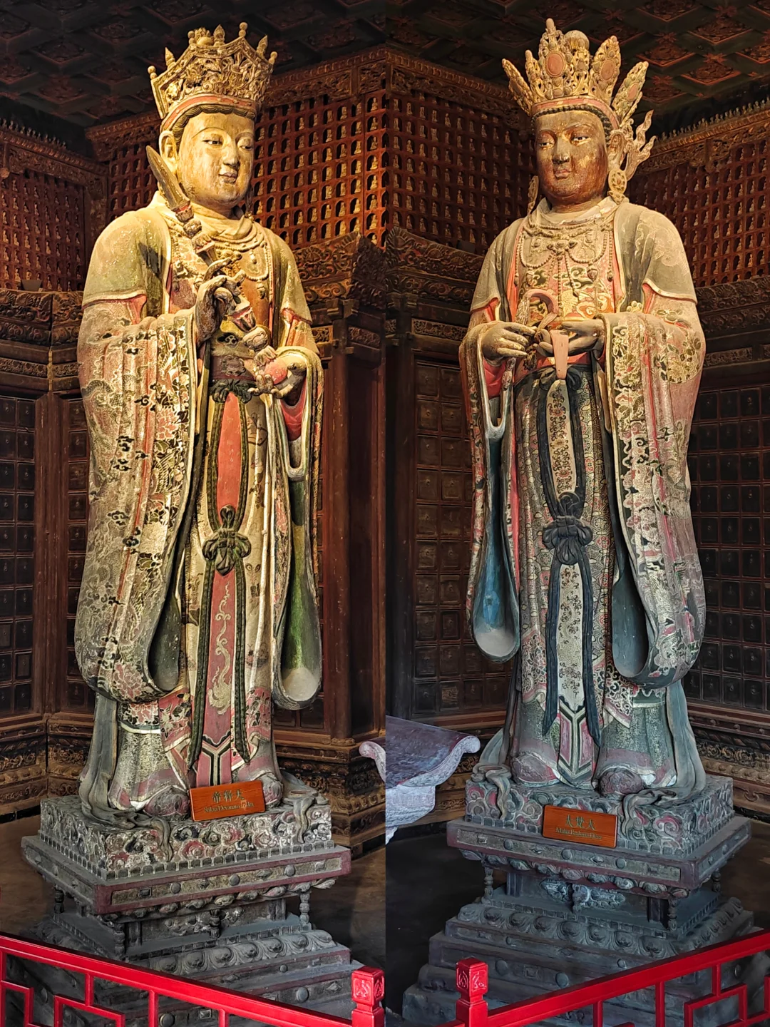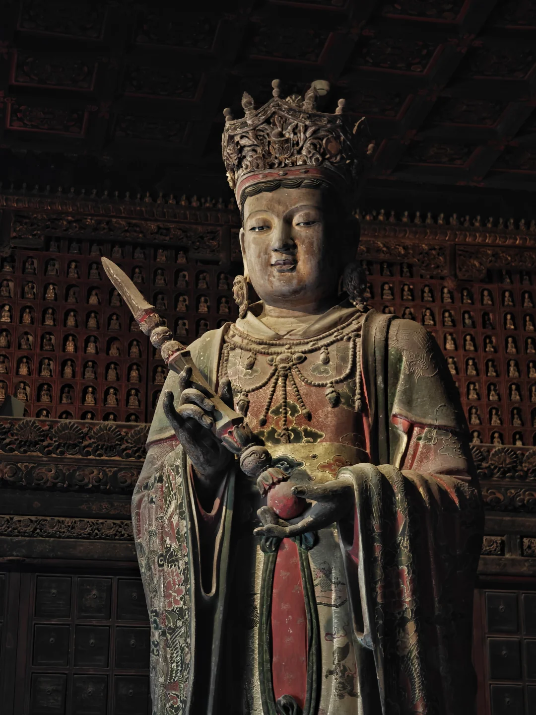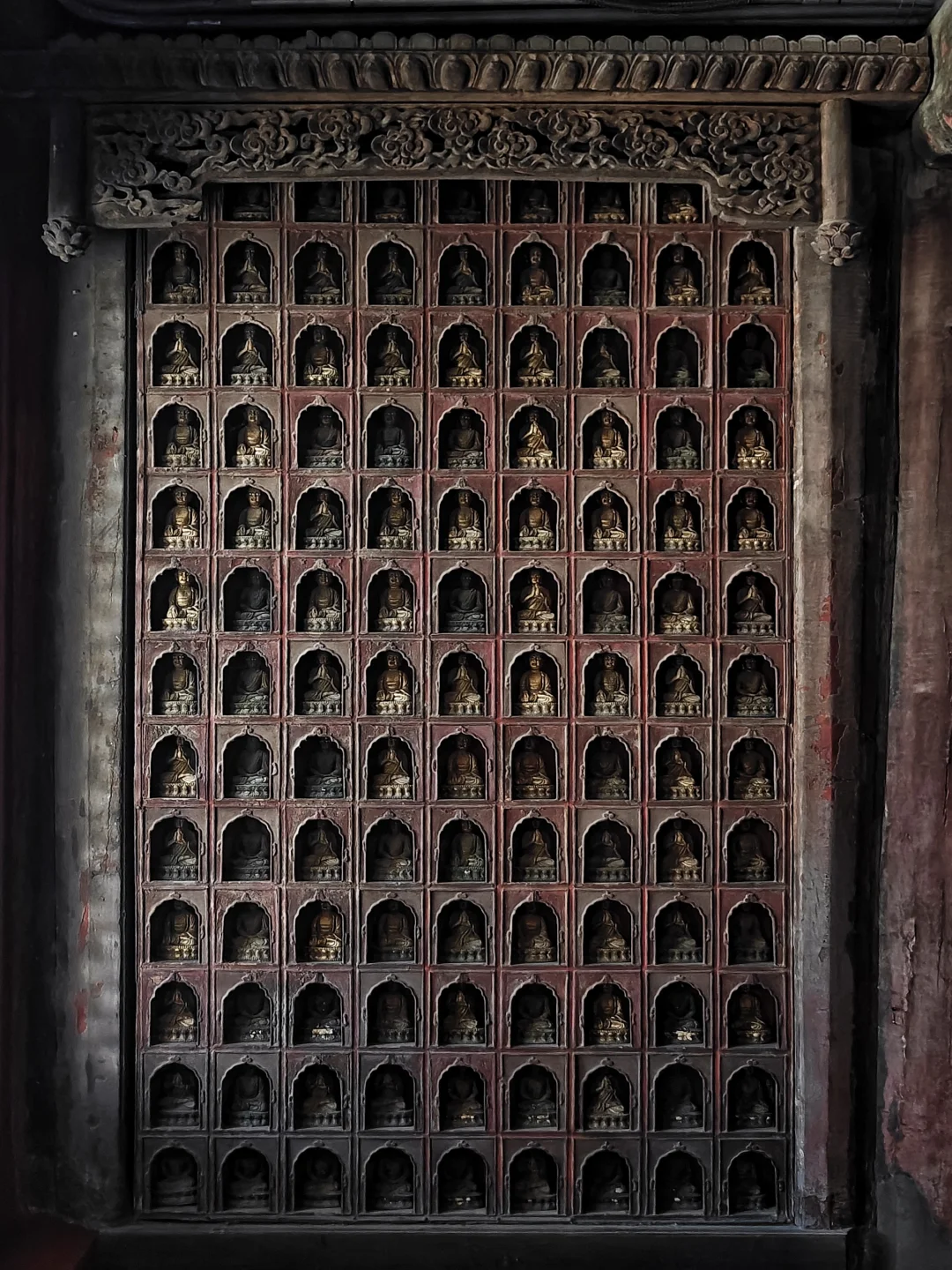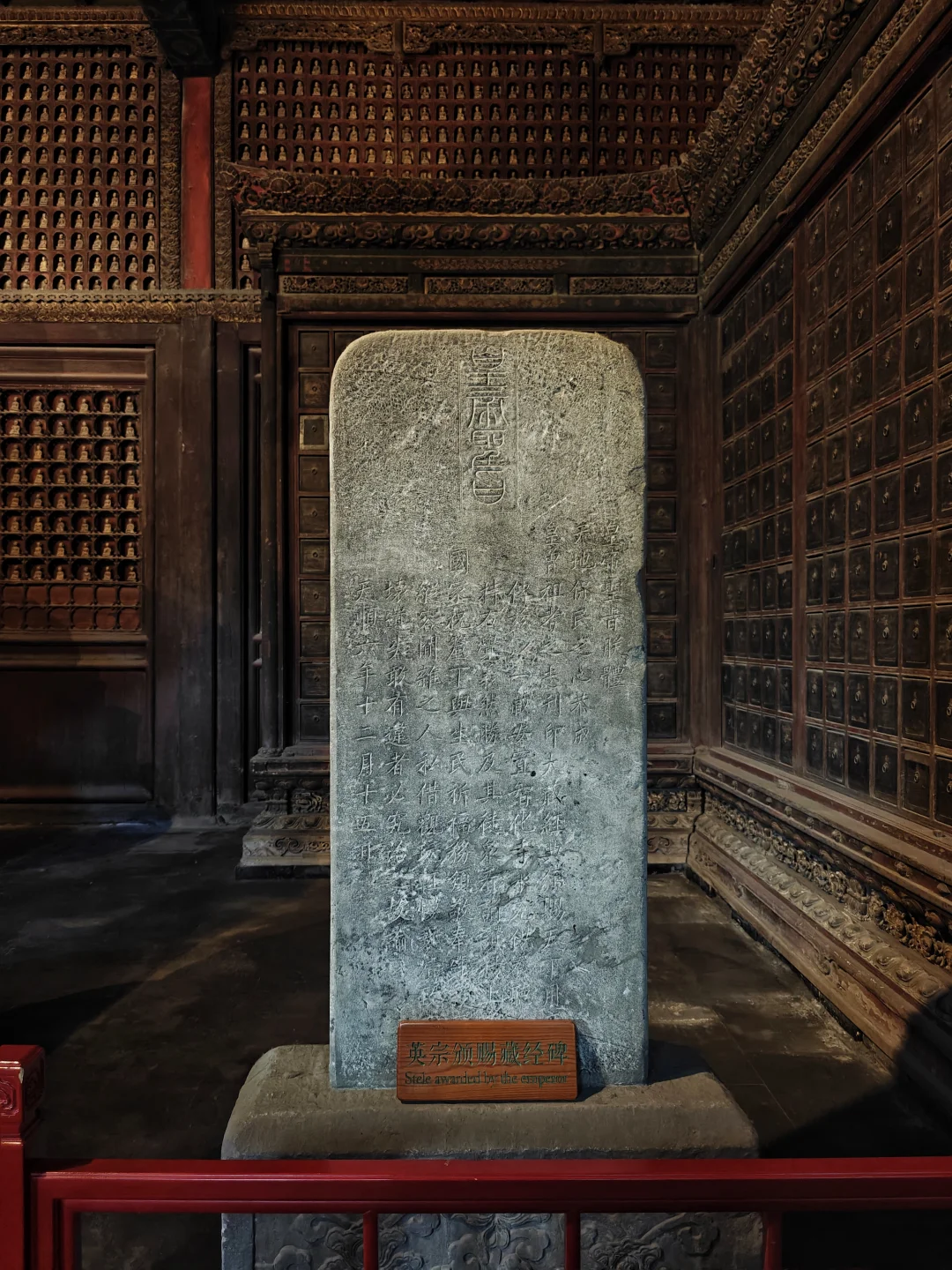 智化寺\n⏰9:00-17:00 周一闭馆\n📍北京市东城区禄米仓胡同5号\n🎫20(每周三免费200人)\n📢免费讲解老师讲得非常好,建议跟听(9:30和14:00)\n\t\n🛕智化寺完整保留了明早期官式建筑特征:屋顶举折沿用宋制(上陡下缓),步架深度自檐至脊递减;保留宋元遗风(如生起、侧脚),同时发展出简化构造(如通柱式楼阁)。梁思成评价其为\"小半部明代官式建筑史\",是研究宋元至清建筑演变的关键实物。\n\t\n👉本篇介绍每个殿内主要看点,总体介绍见上篇。\n\t\n🛕山门:英宗赐汉白玉横匾“敕赐智化寺”\n🛕智化门:原塑有四大天王像,现已无存。门前两通大石碑《敕赐智化禅寺之记碑》和《敕赐智化禅寺报恩之碑》\n🛕钟鼓楼:鼓楼内的大鼓现放在智化殿内西侧,鼓身绘有金龙,且为“沥粉贴金”工艺,极为少见;钟楼内大钟原件保存于大钟寺\n🛕主殿智化殿:原三世佛造像被移至大觉寺主殿。现在这三尊清代佛像原属本寺大悲堂。背面明代壁画《地藏菩萨与冥府十王》原是卧佛寺的旧物,中央绘地藏菩萨,两侧各六人,左侧道明和尚,右侧闵长者,其余为冥府十王。另外存有一些造像,据说是当年作为仓库时留存下来的别处佛像,特殊时期也受到了保护\n🛕东配殿大智殿:原供有观音菩萨、文殊菩萨、普贤菩萨,如今皆无存。目前展示的是智化寺明代彩画工艺研究与复原成果,彩画颇具宋代遗风,色调沉稳庄重,并运用截金工艺、罩染手法\n🛕西配殿藏殿:存放八角形转轮藏,顶部是寺内唯一保留的曼荼罗藻井。金丝楠木,繁复瑰丽,共八面,每面45个抽屉,藏360部经书。抽屉上雕有精美佛像,顶上金大鹏和龙女雕工精美,角上摩羯鱼口生莲花,隔柱饰有狮身飞羊、狮子和大象,至高中心处为一尊持智拳印毗卢遮那佛坐于莲花座上(需走到屋角才能看到部分),底部石质须弥座\n🛕如来殿:重檐庑殿顶,极少见。布满小龛,龛内设小佛。此层前后金柱为通柱,通过上层楼板,往上延伸成为上层檐柱;通柱的使用简化结构,有利于上下楼层空间的展开。供有释迦如来本尊及两位胁侍。左大梵天,右帝释天(明承宋制),长袍上绘有鸟、牡丹、龙、狮的图案,模拟出刺绣和精细织物的质感。殿前香炉明万历二十八年造,刻有很多道教的符号,可见当时有佛道融合现象。\n🛕万佛阁:如来殿二楼,供奉三身佛,不开放。整座佛阁有八千余尊佛像。\n\t\n