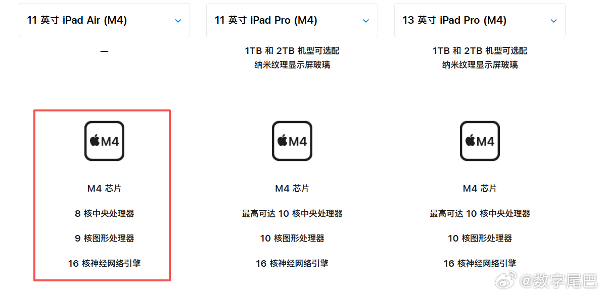 新 iPad Air 主要升级了 M4 芯片,配色上没有改动。另外更换了全新的无线网络芯片 N1 和 C1X 基带芯片。但需要注意的是新款上也并不是满血 M4,只有 8 核 CPU 和 9 核 GPU 的配置。