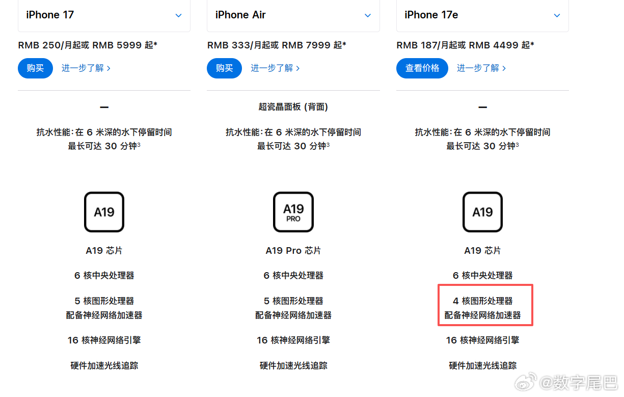 iPhone 17e 新增一个粉色配色,另外还有黑白可选,正面玻璃为超瓷晶面板 2,6.1 英寸屏幕(60Hz)。配备 A19 芯片,搭载 C1X 基带。但这颗 A19 并不是满血版,相比 iPhone 17 的 A19 还砍少了一个 GPU 核心。