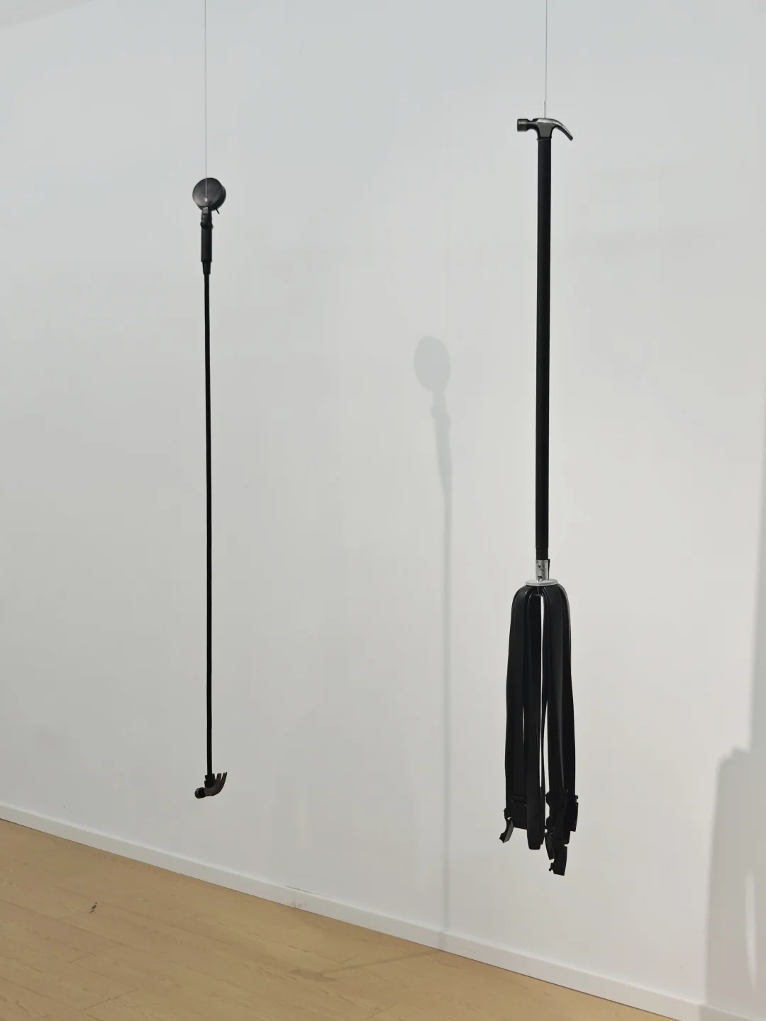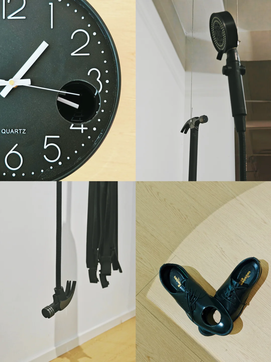 作品:通过日常工具的增殖重组(锤子头+假发、莲蓬头、皮带),在未来危机与揭示当下权力结构方面产生多重意义