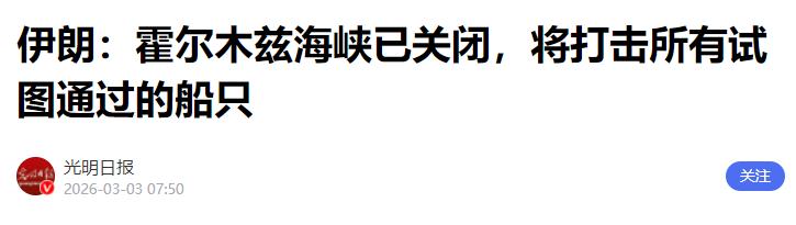 根据央视新闻的报道,当地时间2026年3月2日深夜,伊朗革命卫队司令顾问表示,霍尔木兹海峡已被关闭,伊方将打击所有试图从霍尔木兹海峡通过的船只。 这次伊朗不是随口说说,而是实打实动真格的。伊朗革命卫队将领贾巴里,直接在公开场合放出狠话,语气特别坚决,他说:“我们将点燃任何试图通过霍尔木兹海峡的船只”,除此之外,贾巴里还明确表示,他们还会攻击周边的石油管道,总而言之,就是不会让一滴石油从这个地区运出去,态度强硬到没有丝毫退让。 那伊朗为什么要这么做?其实不是伊朗故意挑事,而是事出有因。根据央视报道和公开信息,早在2月28日,美国和以色列就对伊朗发动了联合军事打击,不仅空袭了伊朗的多个政府机构,还袭击了伊朗的军事基地和渔港,造成了不小的损失。 伊朗多次遭到袭击后,实在忍无可忍,才做出了关闭霍尔木兹海峡的决定,这其实是伊朗对抗美以袭击的反击手段,也是被逼到绝境后的无奈之举。 现在霍尔木兹海峡的局势已经非常紧张,根据相关监测数据,目前已经没有任何油轮敢轻易通过这条海峡,有几十艘油轮要么在海峡附近徘徊观望,要么直接停航避险,原本繁忙的航道,现在变得十分冷清。 而且伊朗已经付诸行动,3月1日就有一艘未经授权的油轮试图通过霍尔木兹海峡,直接被伊朗击中,这也充分说明,伊朗说的“打击所有试图通过的船只”,并不是空话,是真的会动手。 除了关闭海峡、放话打击船只,伊朗方面还给出了一个明确的判断,他们认为,未来几天,国际油价将会暴涨,甚至有可能达到每桶200美元。 可能大家对这个价格没有概念,要知道,就在3月2日当天,国际油价已经开始大幅上涨,伦敦布伦特原油价格一度涨了13%,美国的轻质原油期货价格也涨了10%以上。按照这个趋势,要是霍尔木兹海峡一直关闭,油价真的有可能大幅飙升。 油价上涨,影响的不只是产油国和石油企业,咱们普通人的生活也会受牵连。油价一涨,汽油、柴油价格肯定会跟着涨,平时开车加油会更贵;而且很多工业生产都离不开石油,石油价格上涨,会导致各种商品的生产成本增加,最后这些成本都会转嫁到消费者身上,咱们买东西可能会更贵,比如日用品、食品的价格都有可能小幅上涨。 目前,国际社会对这件事也十分关注,各个国家的态度也不一样。北约已经明确表示,不会参与美国和以色列在伊朗的军事行动;英国和法国也表态,不会参与对伊朗的进攻性打击,还认为美以的军事行动没有经过联合国安理会审议,是不合法的。这也能看出,很多国家并不支持美以的做法,也希望局势能够尽快缓和。 其实霍尔木兹海峡也不会一直关闭,根据历史经验,霍尔木兹海峡从来没有被完全、长期关闭过,这次伊朗关闭海峡,一方面是为了反击美以的袭击,另一方面也是为了施压,希望美以停止对伊朗的打击。 不过伊朗也面临着不小的压力,因为伊朗自己的石油出口,90%也需要通过霍尔木兹海峡,关闭海峡其实也是一种“自伤”的做法,每天都会损失大量的石油收入。 现在的情况是,伊朗已经做好了长期应对战争的准备,而美国总统特朗普则表示,对伊朗的军事行动可能会持续4到5周,甚至更久。双方的对峙越来越激烈,霍尔木兹海峡的局势也变得越来越复杂。 这件事虽然发生在中东,距离我们很远,但和我们的生活息息相关。霍尔木兹海峡一旦长期关闭,全球能源供应会陷入紧张,油价暴涨会影响全球经济,咱们普通人也会感受到实实在在的影响。伊朗的强硬反击,其实也是在告诉美以,不要以为可以随意欺负人,被逼到绝境,任何国家都会拿出自己的底线和实力。 目前,局势还在持续升级,伊朗已经发动了多轮反击,袭击了美军基地,而美以也没有停止对伊朗的打击。 后续到底会如何发展,油价会不会真的涨到200美元,霍尔木兹海峡什么时候能重新开放,我们还需要持续关注央视的后续报道。 但可以肯定的是,伊朗这次是铁了心要反击,不会轻易妥协,而这场对峙,最终受伤的还是普通民众,希望双方能够尽快冷静下来,通过谈判解决矛盾,避免局势进一步恶化。