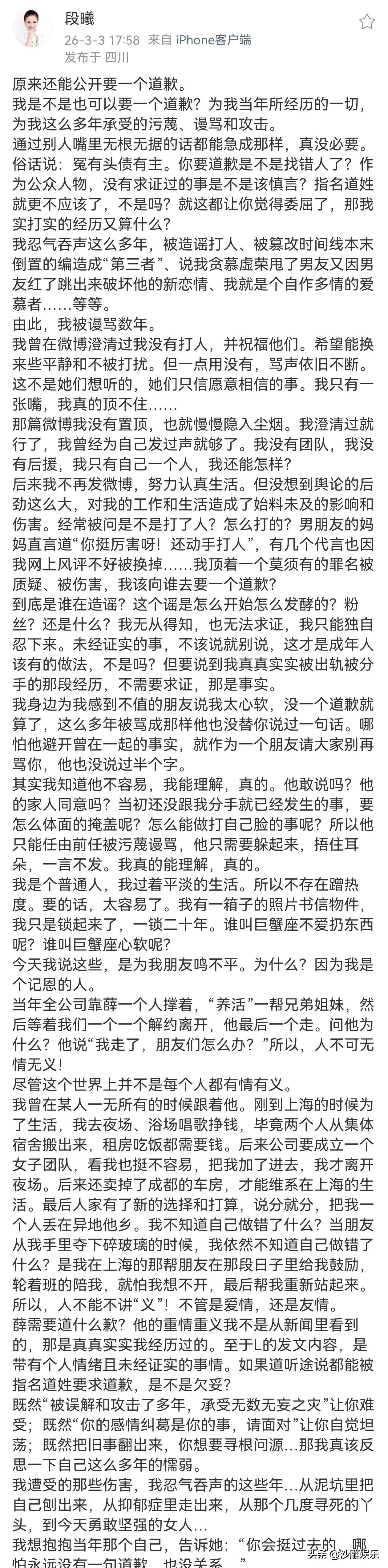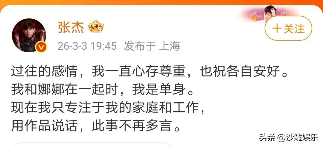 张杰,深夜四字回应! 3月3日的娱乐圈,真的比电视剧还精彩。原本是薛之谦和李雨桐的“恩怨局”,结果谢娜一句“喊话”直接把战火引到了自家后院。就在前女友段曦发长文痛诉当年“被出轨被分手是事实”后,当晚,张杰终于正面回应了 。 简单给大家捋一下时间线。今天,谢娜霸气护夫,要求薛之谦为多年前在节目中含沙射影的言论道歉。没想到,这直接炸出了一位“故人”——张杰的前女友段曦。她发长文力挺薛之谦,称自己当年才是受害者,为了爱情卖掉车房陪张杰闯荡,最后却“被分手”,还被污蔑,甚至因此承受了多年的网暴 。 面对这突如其来的“回忆杀”,张杰在深夜写下了回应:“过往的感情,我一直心存尊重,也祝各自安好。我和娜娜在一起时,我是单身。现在我只专注于我的家庭和工作,用作品说话,此事不再多言。” 。 张杰的回应,最大的亮点就是四个字:“我是单身”。 这话说得很有艺术感。既没有否认段曦的存在,也尊重了过去的感情,但关键点卡得死死的——和谢娜开始时,自己没有脚踏两只船 。这既是对妻子的保护,也是对舆论的切割。作为一个在娱乐圈低调了二十年的“歌手”,他这次没有让老婆挡在前面,而是自己站出来熄火,说实话,挺爷们的。 但是网友都是福尔摩斯。有人扒出,张杰和谢娜2006年经何炅介绍相识,而公开资料显示他与段曦的恋情在2007年才结束 。这一年的“真空期”到底发生了什么?成了目前双方各执一词的焦点。段曦那边说得声泪俱下,甚至细节到卖车卖房;张杰这边虽然简短,但态度笃定。这种“罗生门”,最让吃瓜群众上头。 说实话,感情这事,尤其是十几年前的旧账,外人根本算不清。张杰这次的回应,聪明就聪明在“不纠缠”。 他没有像某些明星那样和前女友写小作文互撕,而是选择了“祝安好”和“向前看”。对于段曦的委屈,我们表示同情;但张杰有句话说得对,他现在是三个孩子的父亲,他的首要任务是守护现在的家庭 。不管当年真相如何,既然选择了各自的路,互不打扰才是最大的体面。既然当年分手时没说的话,现在也不必再说,交给作品吧。 网友议论纷纷 - “支持杰哥!造谣一张嘴,辟谣跑断腿,过去的就让它过去吧。” - “前女友卖掉车房陪你吃苦,最后就换来一句‘我是单身’?这交代太苍白了吧。” - “只有我的关注点在薛之谦身上吗?这事到底跟他有没有关系?他怎么还不出来回应?” - “谢娜是真爱张杰啊,谁说我老公我跟谁急,结果还把陈年旧事炸出来了,这波亏了。” 这场大戏,目前各方都在“扔料”,但真相恐怕只有当事人自己心里清楚。作为看客,还是搬好小板凳,静观其变吧。