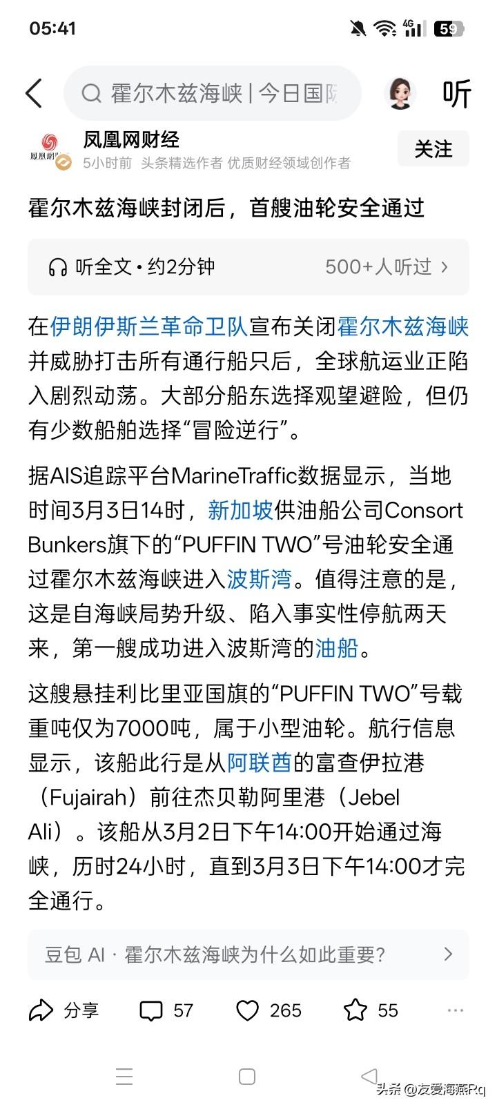 封锁好像彻底破产了? 伊朗海军要封锁霍尔木兹海峡,但美国和以色列称,他们几乎完全、彻底的干掉了伊朗的全部海军。 好像就是在这种情况下,新加坡石油供应公司的一艘油轮,光明正大,大摇大摆的通过了霍尔木兹海峡,顺利进入波斯湾。 这似乎说明,伊朗的海军真的是如同美国和以色列说的那样,已经基本上全军覆没,不在存在,至少已经没有战斗力,当然也没有什么军事力量,再去封锁什么霍尔木兹海峡了。 有些事情做不了,或者根本就不能做,嘴上强大,还真说不定将命也送去。