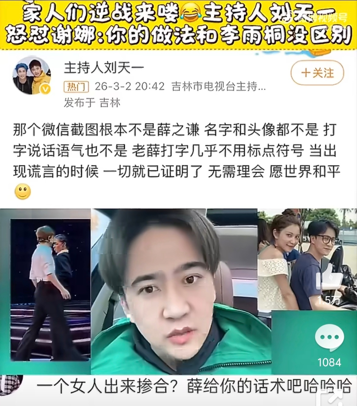 主持人刘天一喊话谢娜 娱乐圈这是咋啦?张杰前女友都跳出来了...居然张杰还亲自回应了那段值得尊重的感情....前助理还开始扒张杰和谢娜的过去时间线....这都怎么了...