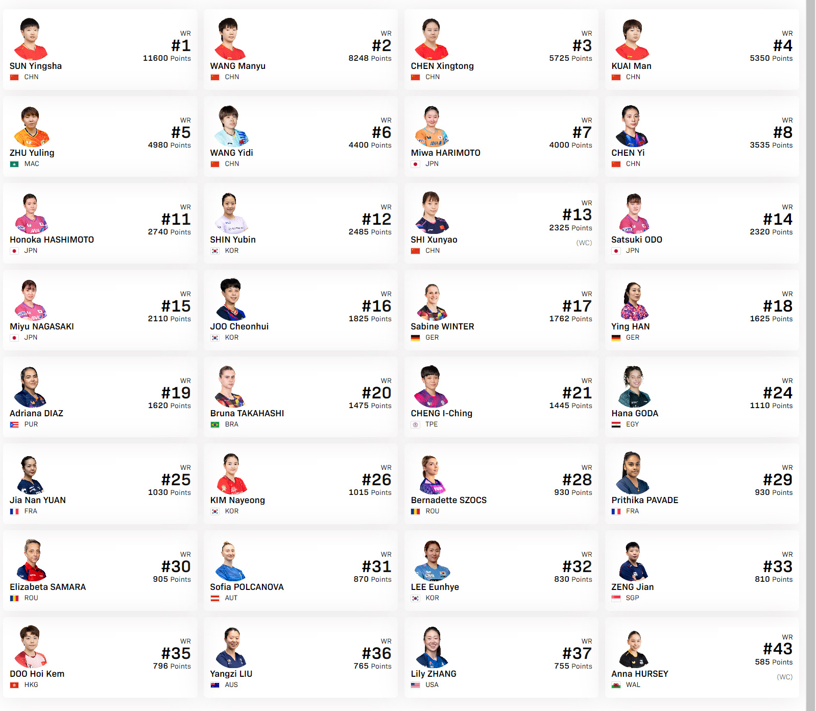 女单:孙颖莎、王曼昱、陈幸同、蒯曼、王艺迪、陈熠、石洵瑶