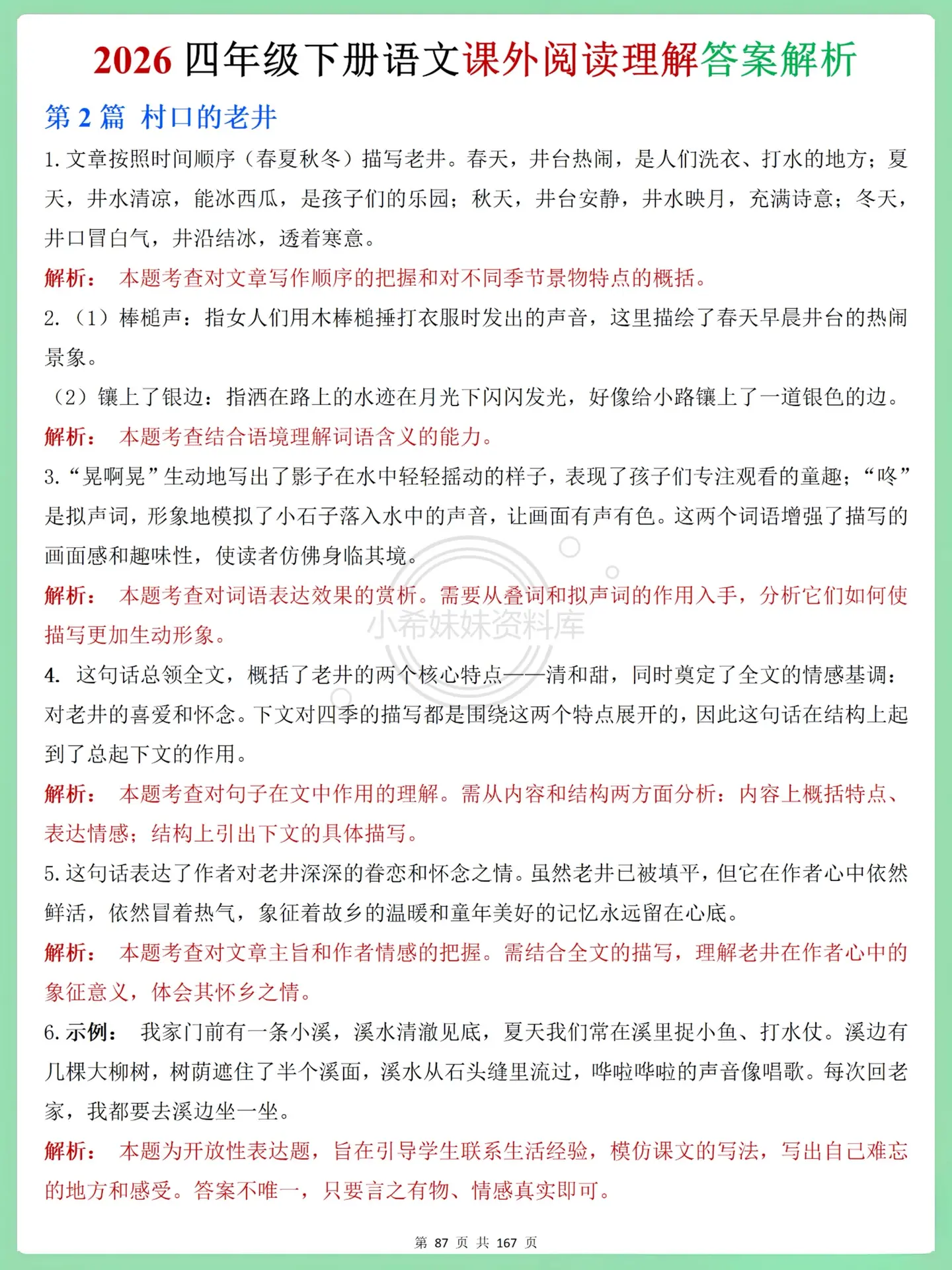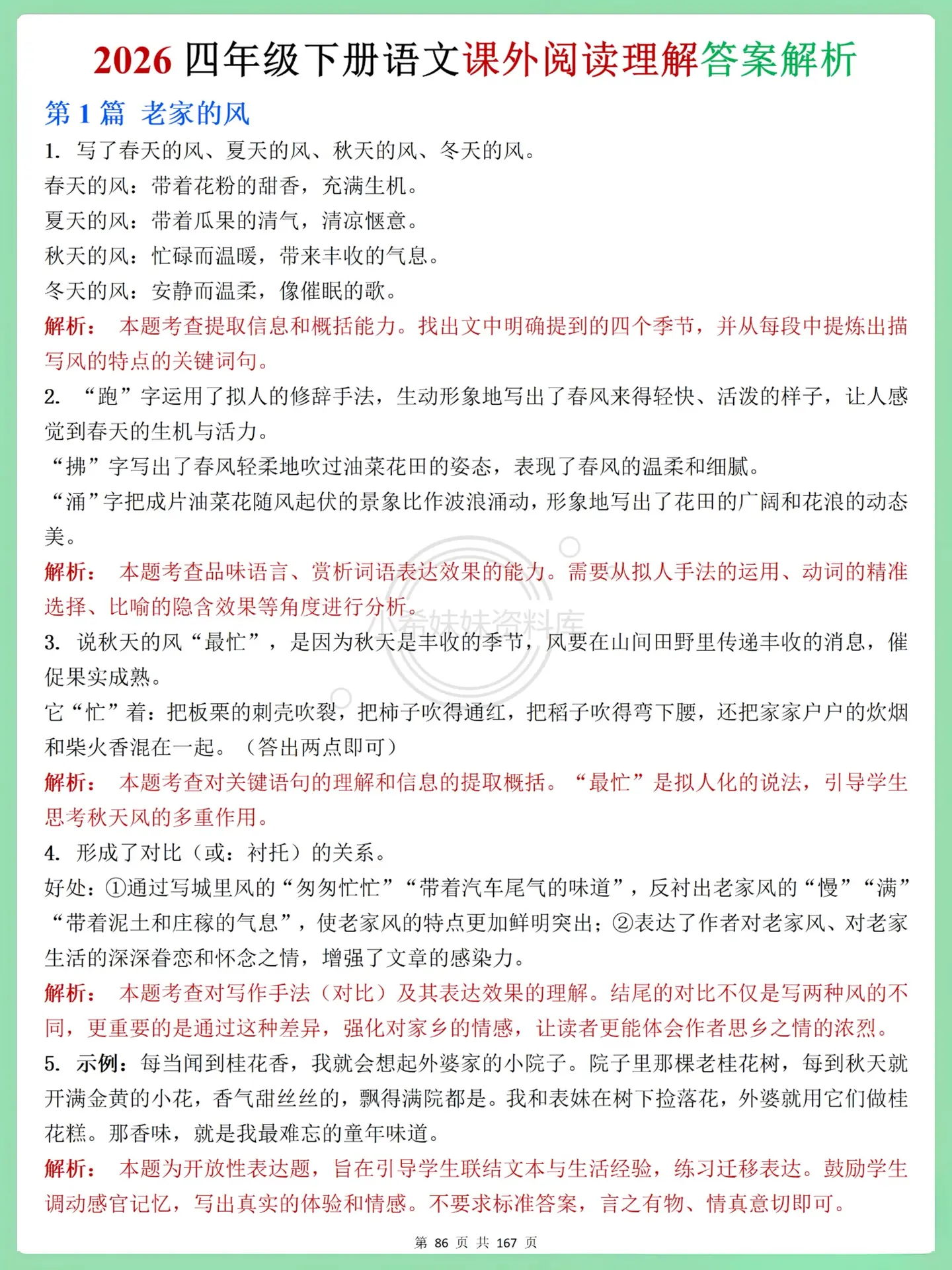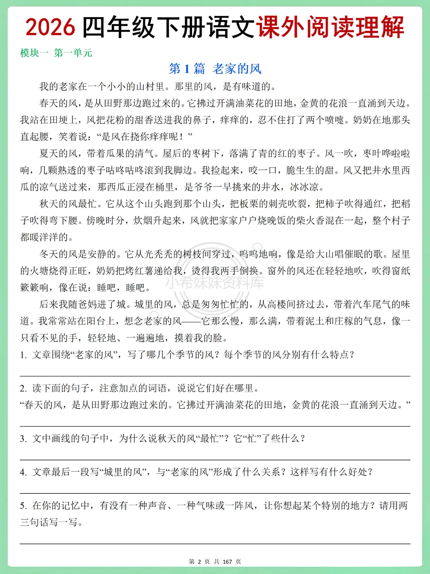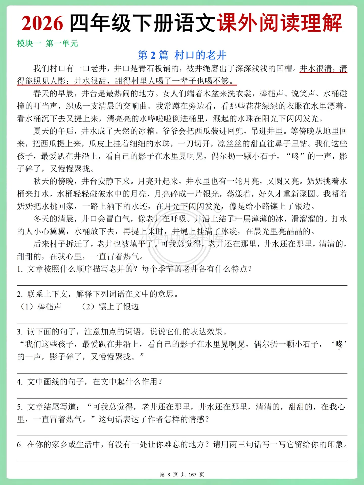 2026四下语文课外阅读理解专项训练。谁懂啊!这套四年级下册阅读理解太绝了😭 完全贴合人教版课标,乡村生活、自然科普、童话寓言、小古文全覆盖,孩子读得停不下来~ 题型超对症!字词基础、句子赏析、内容概括、读写拓展全包含,每道题都有详细解析,家长辅导不费妈,孩子自学也能吃透📖 不管是课堂同步练还是假期拔高,用它练阅读,语文成绩稳涨分,学霸都在偷偷用~