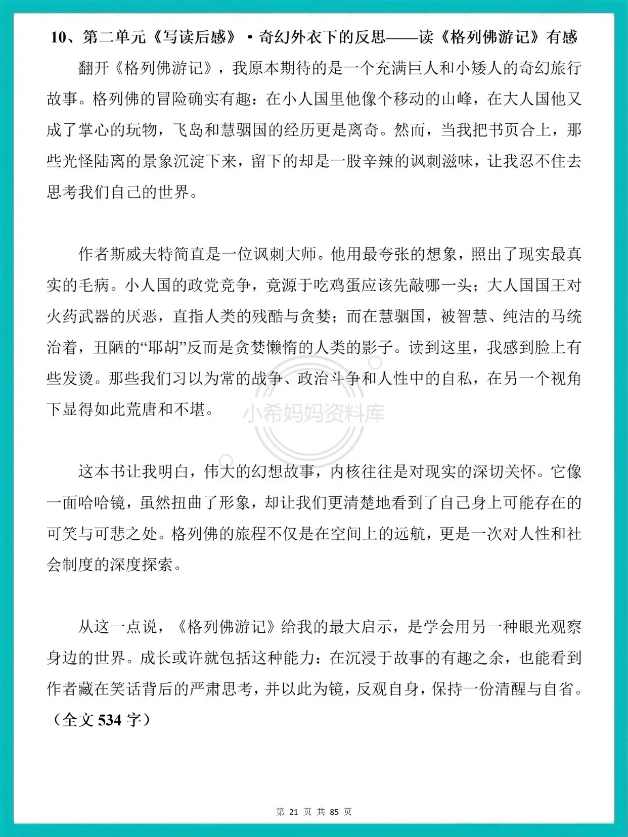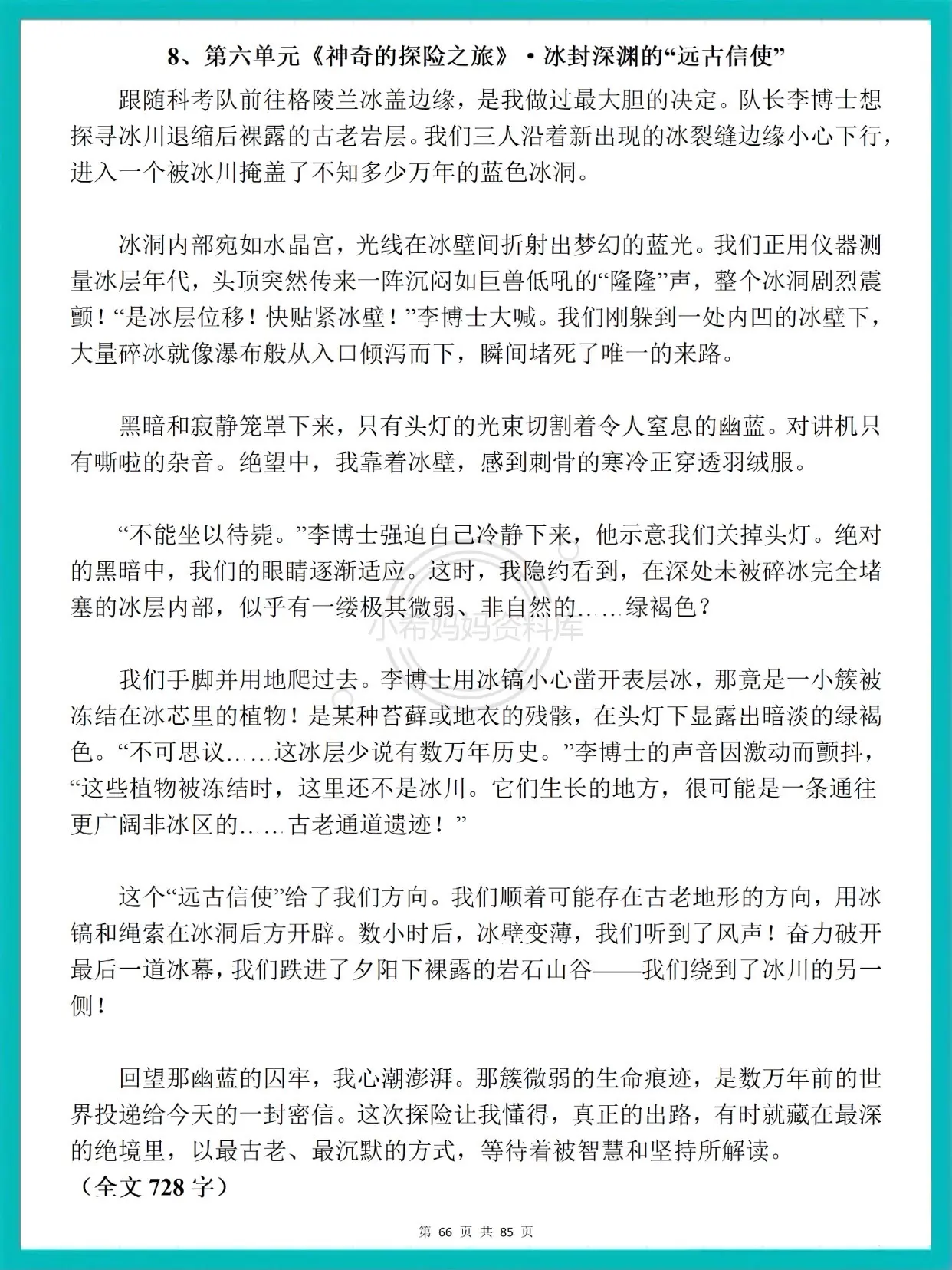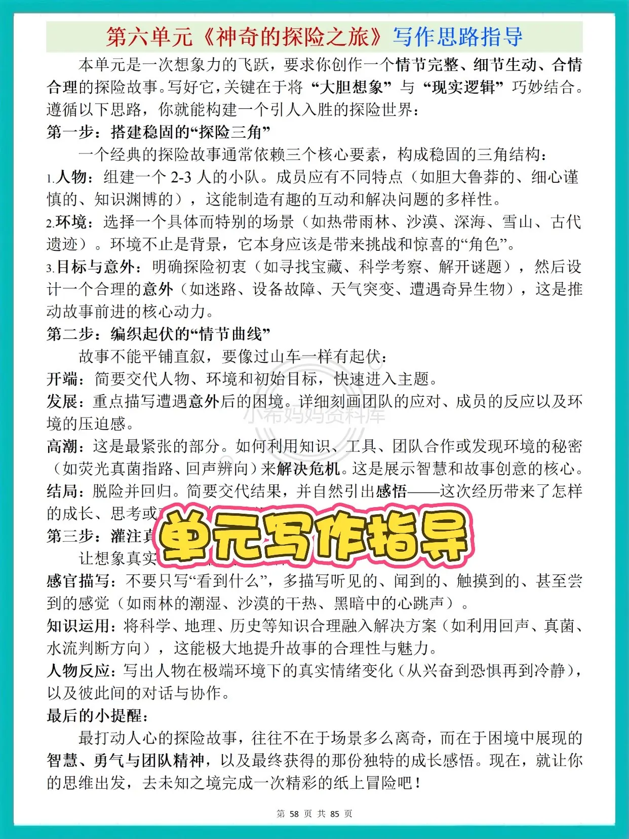 2026新五下作文|8主题73篇范文速码。开学季五下语文刚需✨ 作文预习练笔直接锁这套! 73篇高分范文+逐单元写作思路,8个课堂习作主题全覆盖,精准贴合课本要求: 《那一刻,我长大了》《写读后感》《学写简单的研究报告》 《他____了》《形形色色的人》《神奇的探险之旅》 《中国的世界文化遗产》《漫画的启示》 素材全是小学生真实生活,写事有细节、写人有特点,开学练笔、单元小测直接对标模仿,孩子轻松掌握写作技巧,家长辅导不用愁,新学期作文次次拿优~