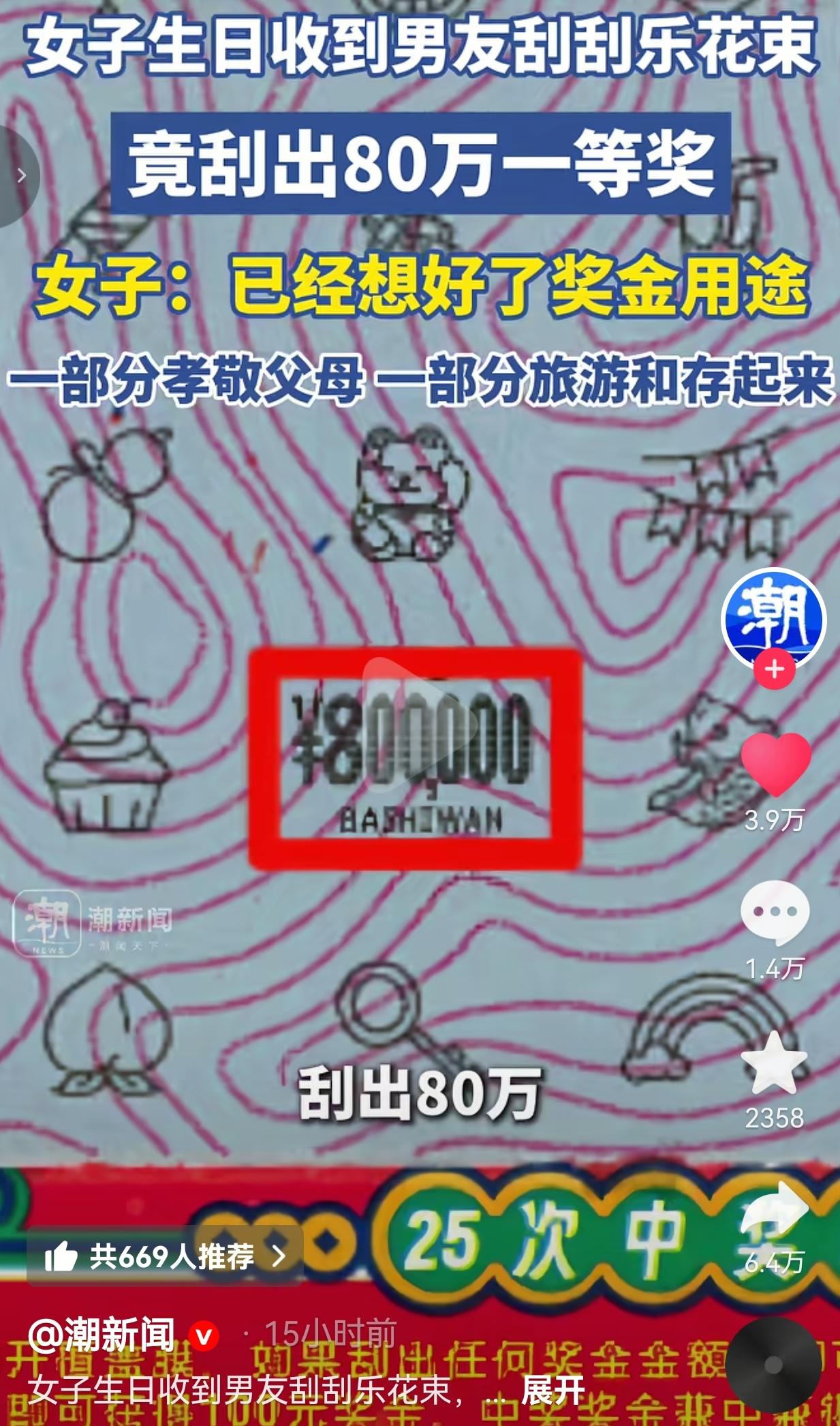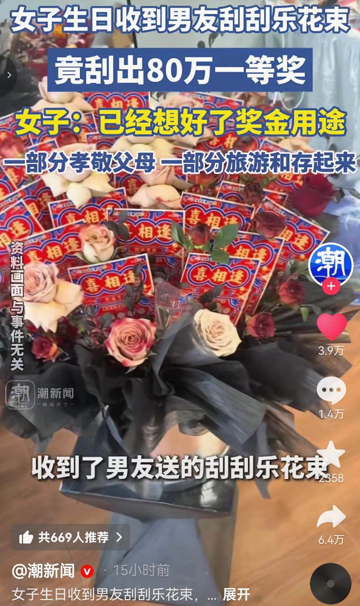 这才是顶级浪漫!广东佛山的李女士最近过了一个这辈子都忘不了的生日。 在生日当天,她受到的生日礼物不是包包、不是口红,而是一大束用红玫瑰和“喜相逢”刮刮乐扎成的花束。 李女士拆开的时候还笑着吐槽:“这也太实在了,直接送彩票啊?” 可当她刮开其中一张时,整个人都懵了——屏幕上赫然显示着“¥800000”的字样。 她反复确认了好几遍,又拉着男友一起看,才敢相信自己真的中了一等奖,整整80万。 面对这笔“从天而降”的巨款,李女士没有被冲昏头脑,她早就想好了怎么花: 一部分用来孝敬父母,让他们晚年过得更舒心。 一部分和男友一起去旅游,弥补之前因为工作忙错过的风景。剩下的全部存进银行,作为未来生活的保障。 男友也笑着说,当初就是想给她一个惊喜,没想到真的中了大奖,这钱是她的,也是他们两个人的。 此事引发热议,有人羡慕李女士的好运气,有人酸“为什么我遇不到这样的男友”。 其实,我们羡慕的从来不是那80万,而是藏在刮刮乐花束里的用心,是中奖后不吵不闹、彼此信任的底气,是把“我们”放在“我”前面的格局。 很多人说,钱是感情的试金石。可真正的感情,从来不是考验谁更有钱,而是考验两个人在利益面前,还能不能守住初心,还能不能把对方的感受放在第一位。 李女士没有独吞奖金,男友也没有眼红嫉妒,他们一起规划未来,把意外之财变成了对彼此的承诺。这才是比80万更珍贵的东西。 最后,我想问一下:如果是你,突然中了80万,你会怎么花?你会第一时间和另一半分享吗?