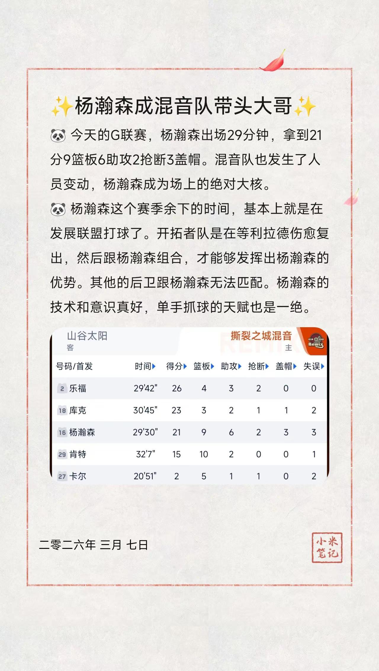 ✨杨瀚森成混音队带头大哥✨。🐼 今天的G联赛,杨瀚森出场29分钟,拿到21分9篮板6助攻2抢断3盖帽。混音队也发生了人员变动,杨瀚森成为场上的绝对大核。🐼 杨瀚森这个赛季余下的时间,基本上就是在发展联盟打球了。开拓者队是在等利拉德伤愈复出,然后跟杨瀚森组合,才能够发挥出杨瀚森的优势。🐼 其他的后卫跟杨瀚森无法匹配。杨瀚森的技术和意识真好,单手抓球的天赋也是一绝。很多人虽然也能单手抓球,但是跟杨瀚森不一样,杨瀚森是能够握完全住球,那传球的感觉就与众不同了。可以带不同方向旋转的。有点类似乒乓球的弧线球。
