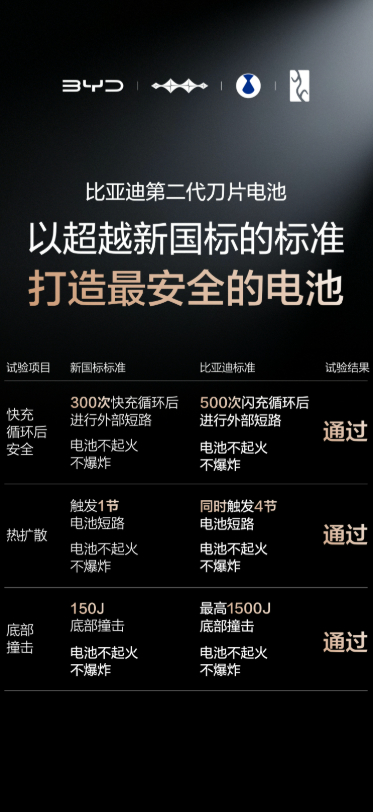 最重要的安全性方面,比亚迪也以远超新国标标准,通过了500次闪充循环后边闪充边针刺试验、10倍新国标撞击力底部撞击试验、同时触发4节电池短路热扩散试验。电芯还终身保修。