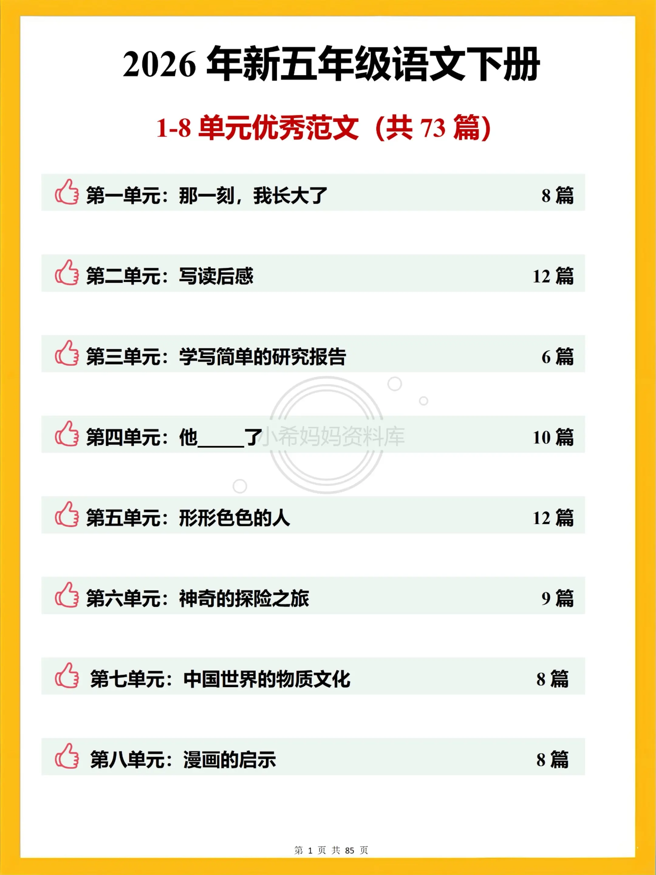 2025五下语文作文 8单元73篇范文。五下家长速码💯语文作文直接抄作业的快乐谁懂! 孩子写作文没思路、凑字数、不会细节描写?这套刚需素材直接拿捏,73篇高分范文精准贴合课本8大习作主题,单元作业/随堂练笔直接用: 《那一刻,我长大了》《写读后感》《学写简单的研究报告》《他____了》《形形色色的人》《神奇的探险之旅》 《中国的世界文化遗产》《漫画的启示》 全是小学生适配的真实生活素材,细节拉满、结构清晰,不用家长费脑辅导,孩子对标模仿就能写高分,五下语文作文直接躺赢~