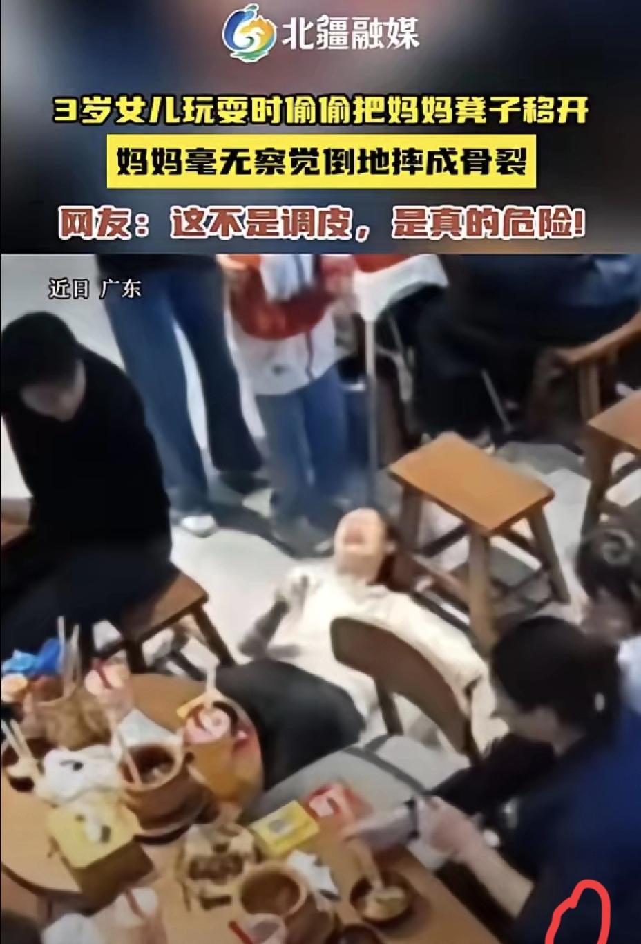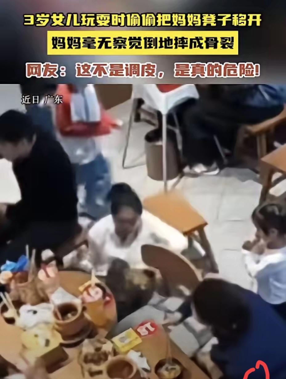 “太吓人了!”近日,广东发生一起让人揪心的家庭意外。一名女子和家人在饭店聚餐,起身夹菜的间隙,年仅3岁的女儿竟偷偷把她的凳子挪开,女子毫无防备直接坐空,重重摔在地上,剧痛之下无法起身。