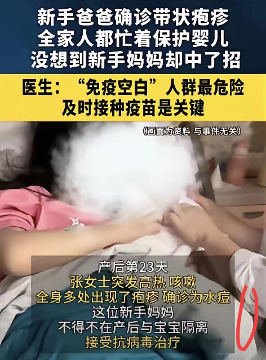 万万没想到!深圳一家防住了宝宝,却没护住产妇 近日,广东深圳一个家庭遭遇了让人揪心又无奈的一幕。 刚迎来新生儿不久,丈夫就确诊了带状疱疹,医生明确叮嘱:病毒具有传染性,严禁接触宝宝。 全家人立刻高度戒备: 丈夫单独隔离、分餐分用具、全程不碰孩子,所有防护都围着宝宝转。 大家都觉得,只要护住新生儿就好,却忽略了刚生产完的妈妈,免疫力同样极度脆弱。 千防万防,最后妈妈还是被传染,身上长出了疱疹。 这下局面彻底被动: 原本只需要隔离丈夫一人,现在妈妈和刚出生的宝宝也被迫一起居家隔离。 宝宝离不开母乳和妈妈照顾,产妇只能忍着疼痛,一边自己养病,一边照顾孩子,让家人既心疼又无奈。 这件事也给所有有新生儿的家庭提了个醒: 家里有产妇和婴儿,大人的防护同样不能大意,免疫力低下时期,一点疏忽都可能带来风险。 新生儿护理 带状疱疹 家庭防护