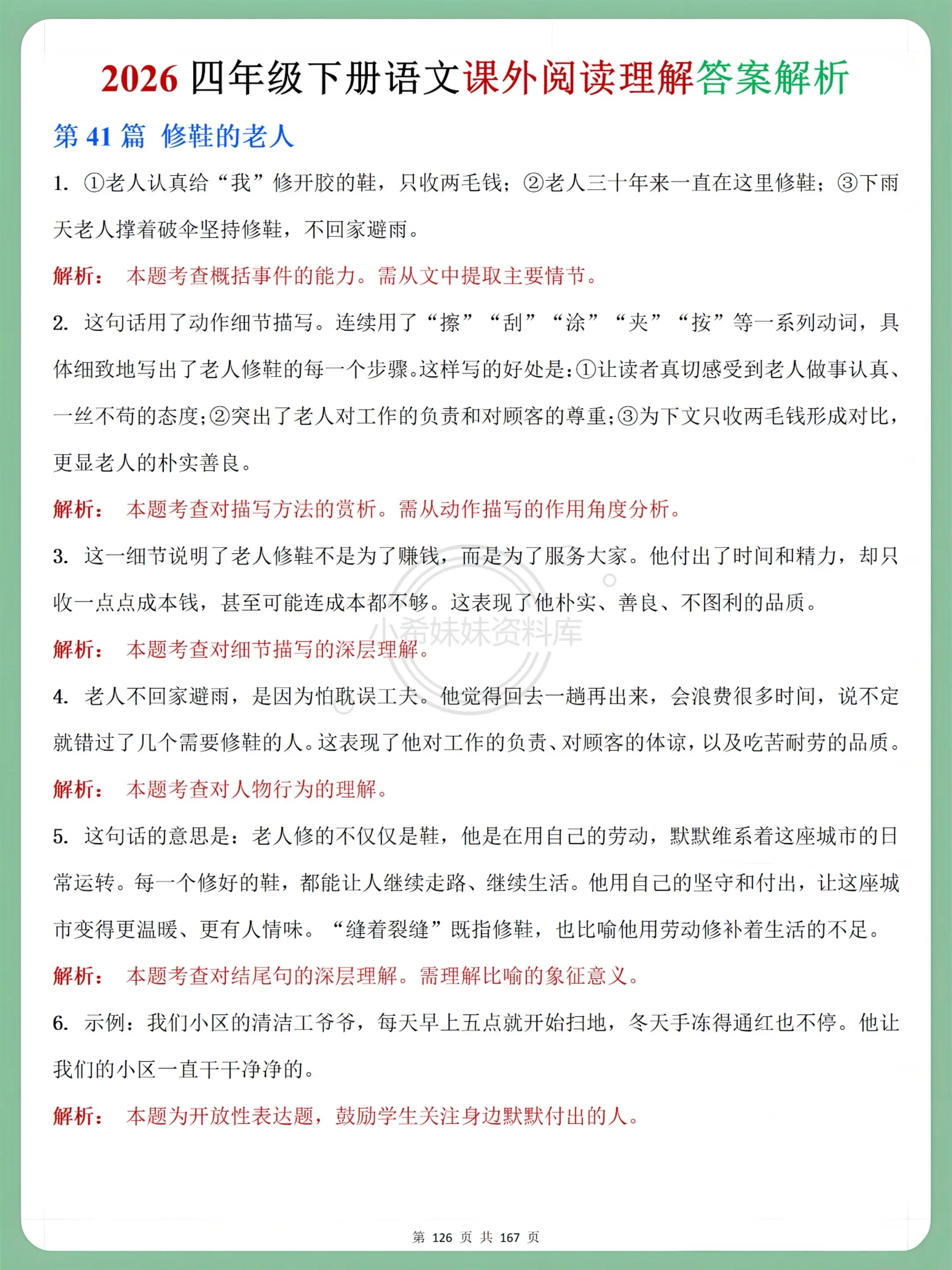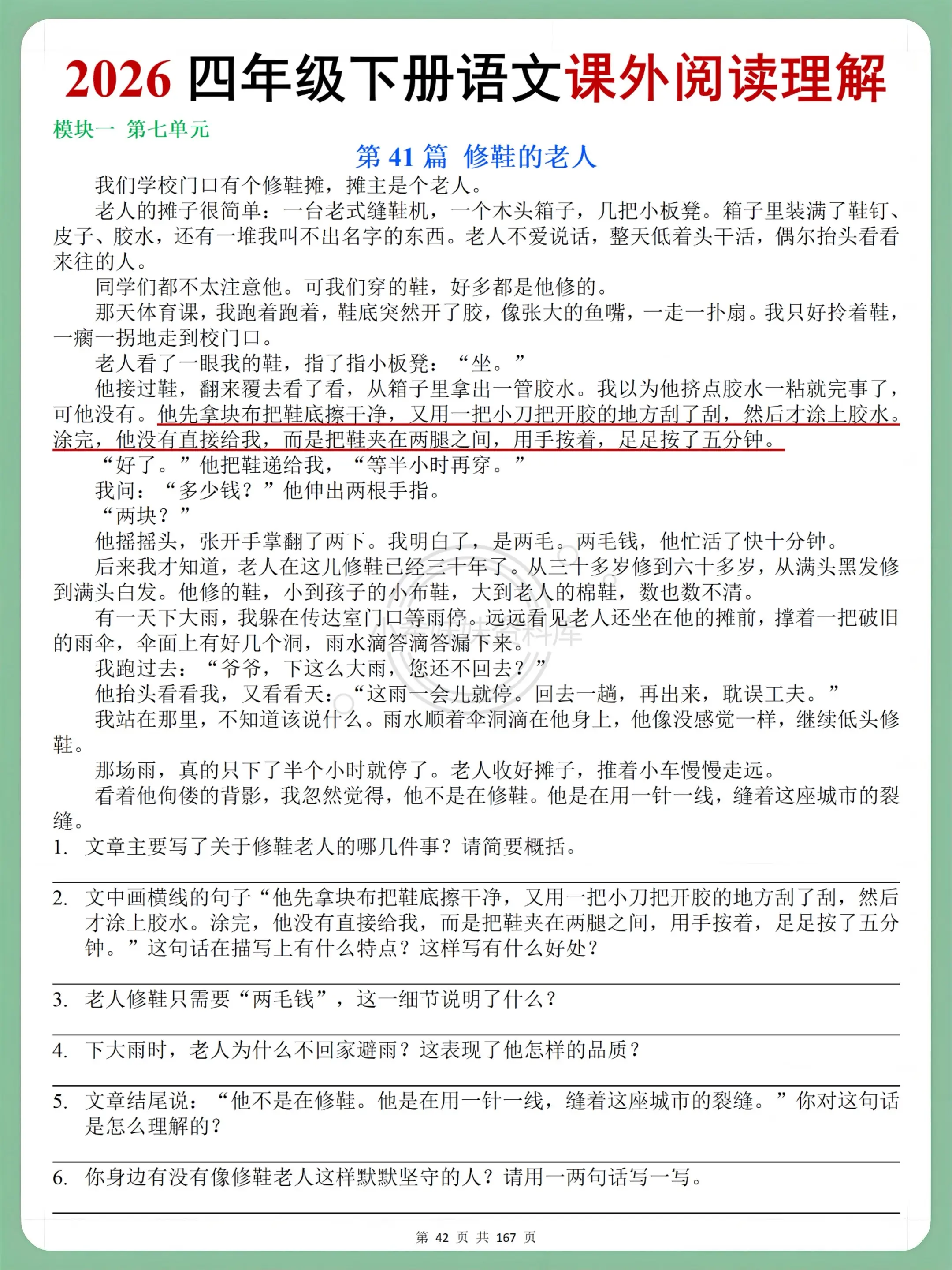 四年级语文下册课外阅读理解,吃透不丢分。四下阅读理解精准对接课堂进度...