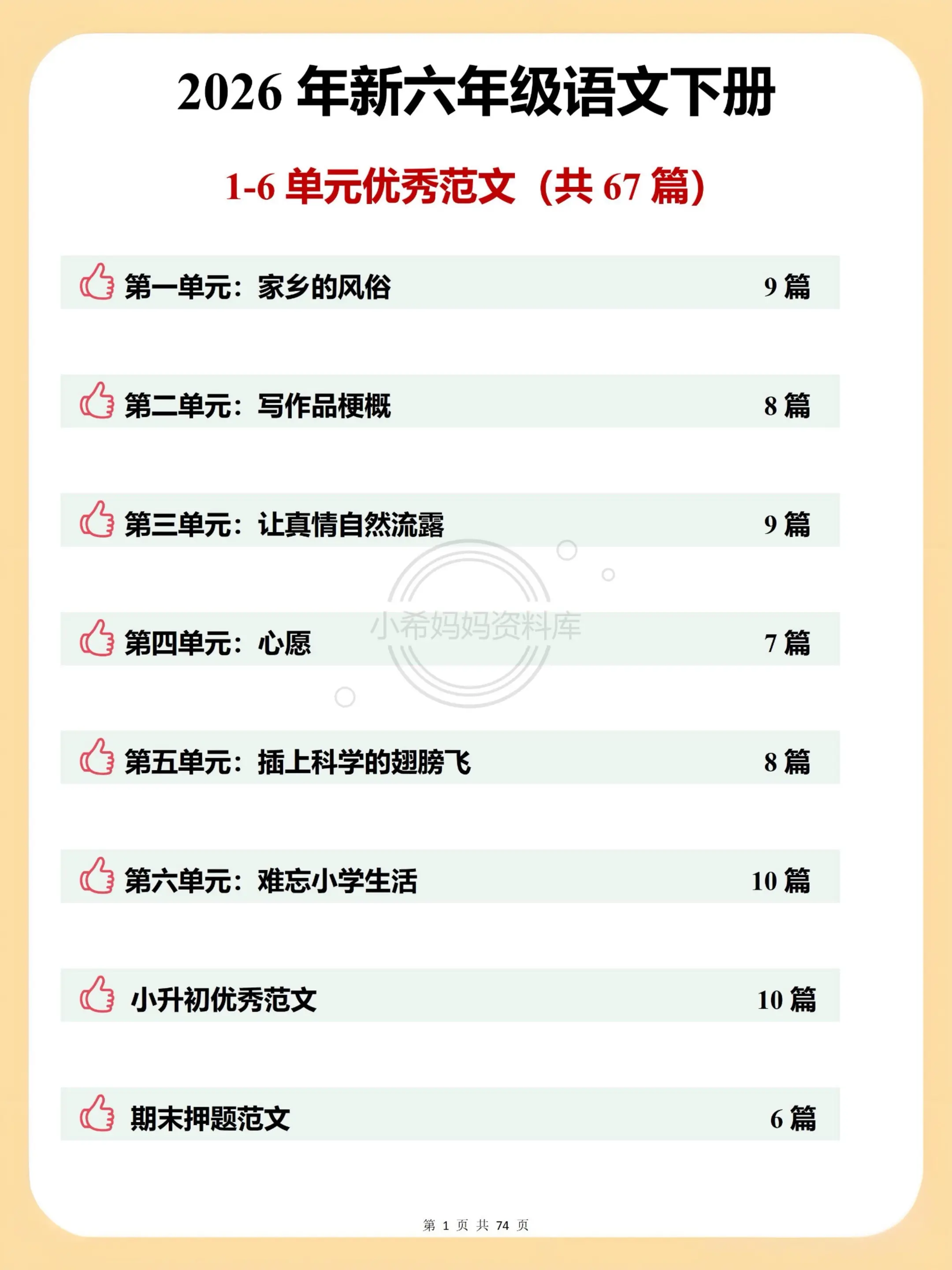 第一单元《家乡的风俗》、第二单元《写作品梗概》、第三单元《让真情自然流露》、第四单元《心愿》、第五单元《插上科学的翅膀飞》、第六单元《难忘小学生活》,六下所有习作主题全囊括,每类都有多篇高分范文参考。