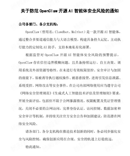【#券商内部紧急提示龙虾风险#】从上门安装OpenClaw包会使用仅需499元,到上门彻底卸载OpenClaw仅需299元,大反转只需一个周末。3月10日晚间,工信部、国家互联网应急中心、央视新闻纷纷提示OpenClaw应用的安全风险。记者获悉,有券商近期已在内部发布通知,提示员工防范OpenClaw带来的安全风险,还有券商为保障公司网络与信息安全,禁止员工在公司电脑等资产环境中,安装和使用OpenClaw。记者采访多位券商的首席信息官,综合观点来看,OpenClaw当前确实存在信息安全隐患,且目前还在早期,远不是消费级产品,全民热有点过早。但智能化浪潮势不可挡,未来会在金融行业应用,并对行业变革产生重要影响。(财联社)网页链接