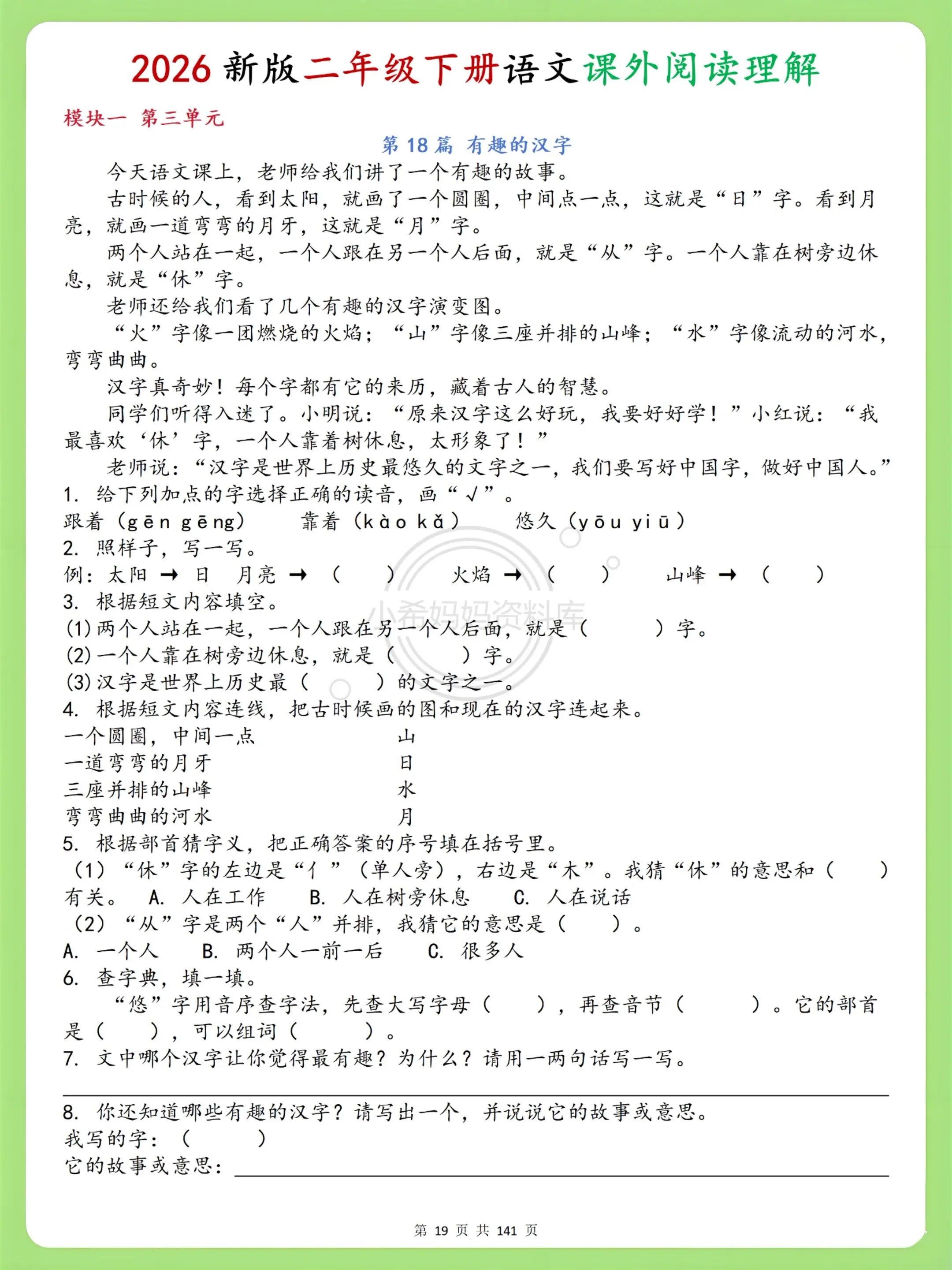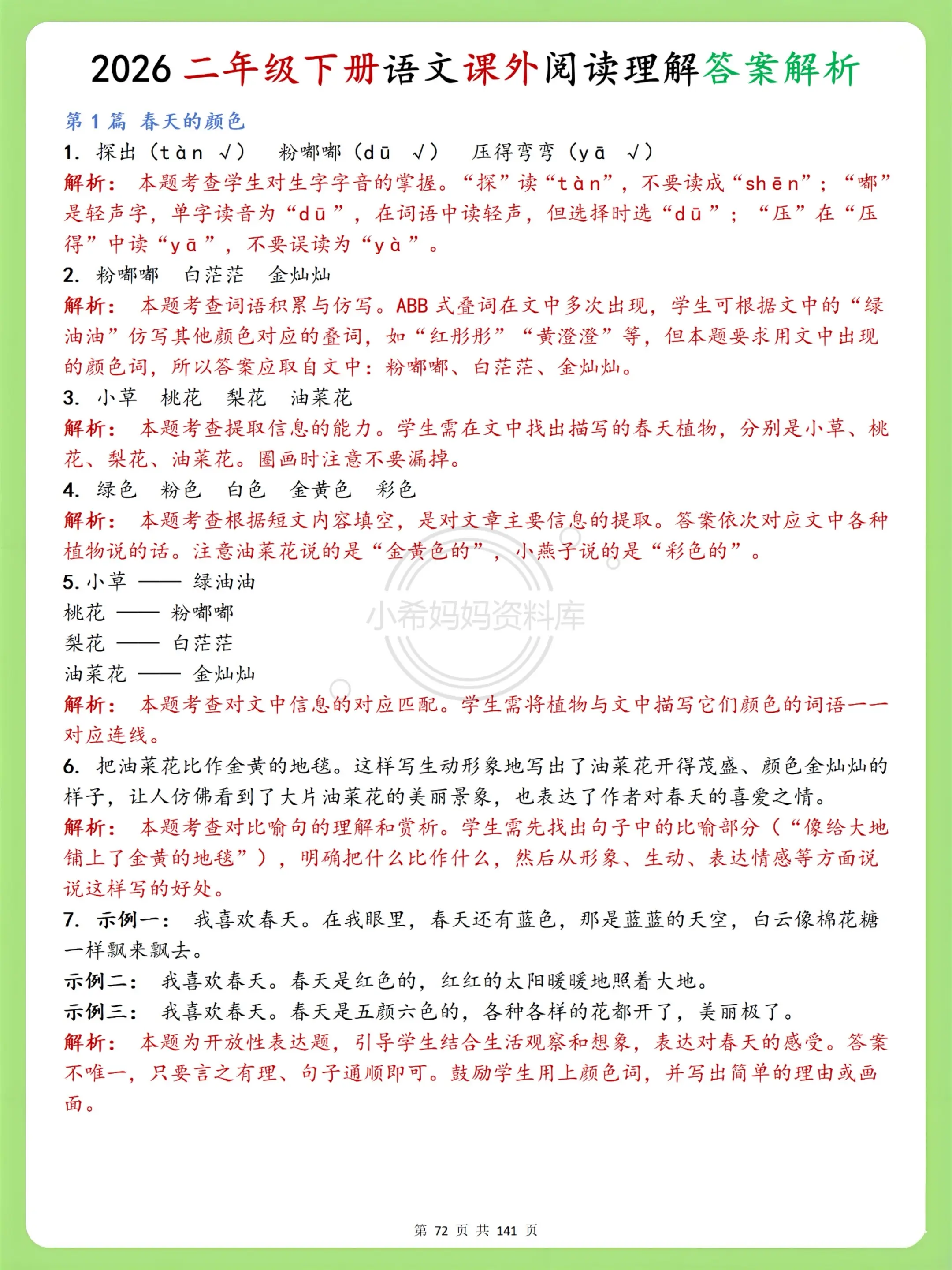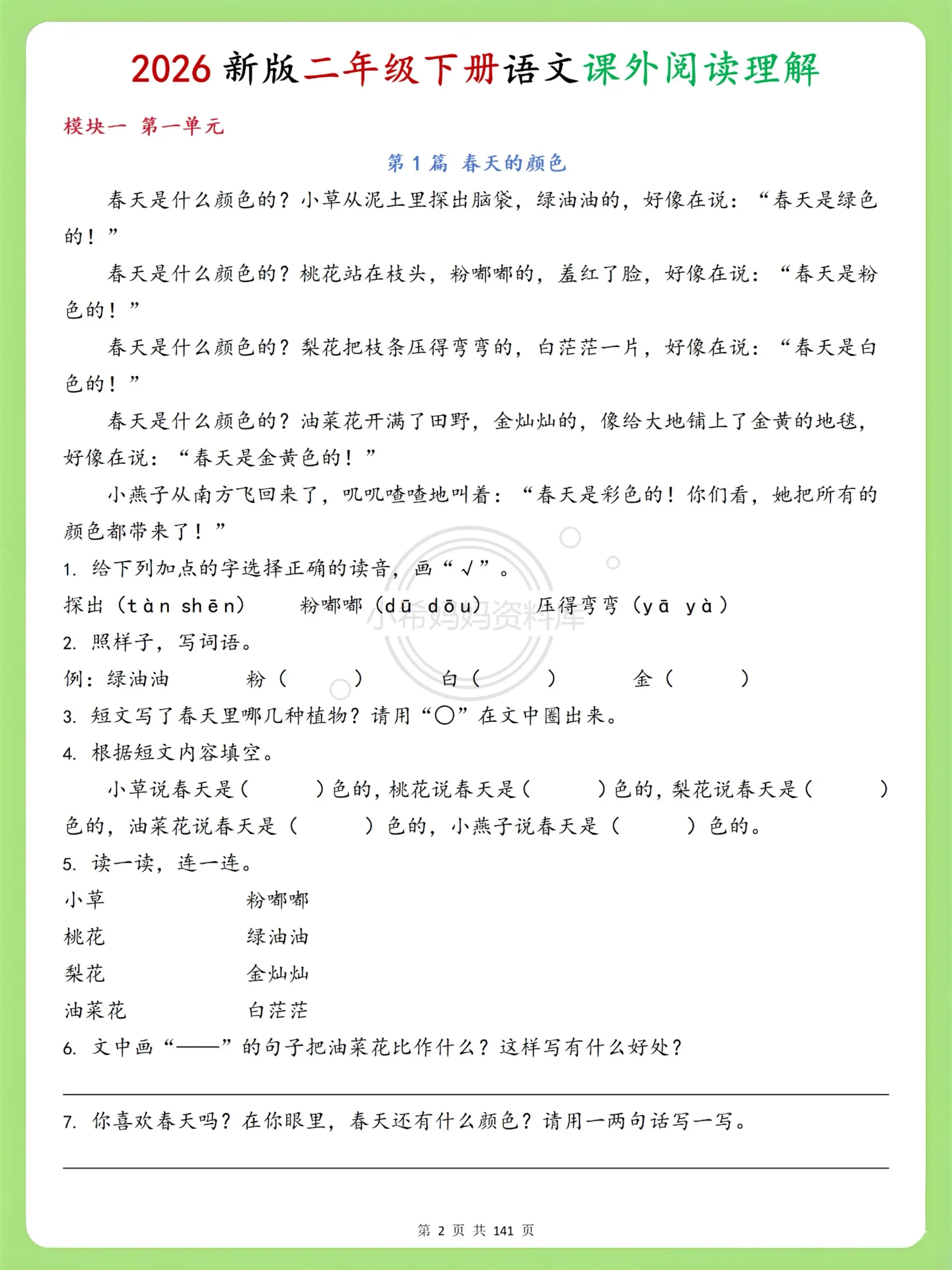 二下语文阅读理解70篇|附答案解析💯。家有二年级娃的宝妈看过来!整理了超全的课外阅读理解资料~ 涵盖春天主题、神话故事、非连续性文本、古诗文等超多题型,从基础的字音字词到句式仿写、情感理解,每篇都带详细答案解析,孩子做完能直接核对纠错,不用家长费心辅导! 题目难度贴合课本进度,图文结合不枯燥,既能巩固课内知识,又能提升阅读和表达能力,每天练1篇,语文成绩悄悄拔尖~