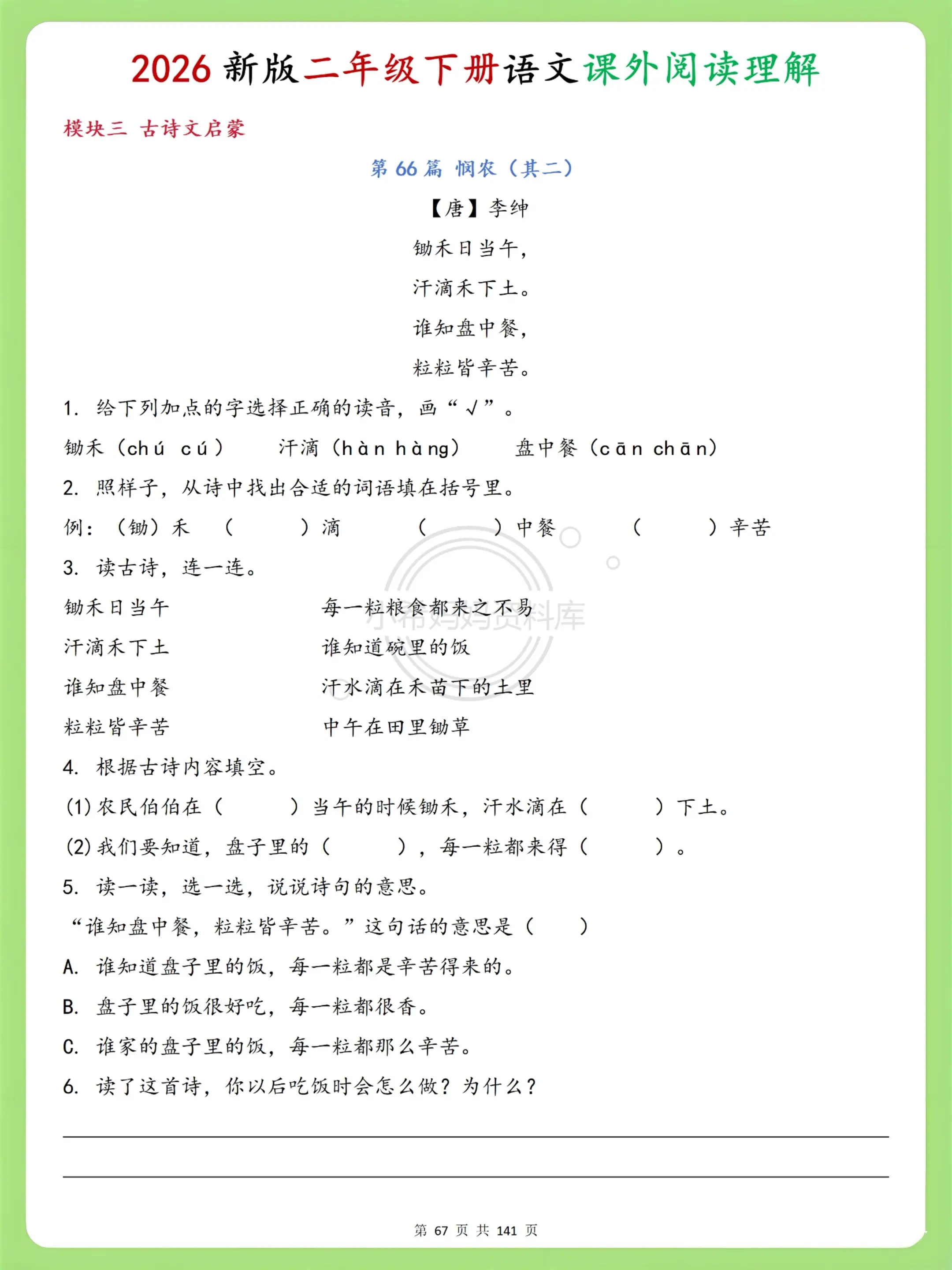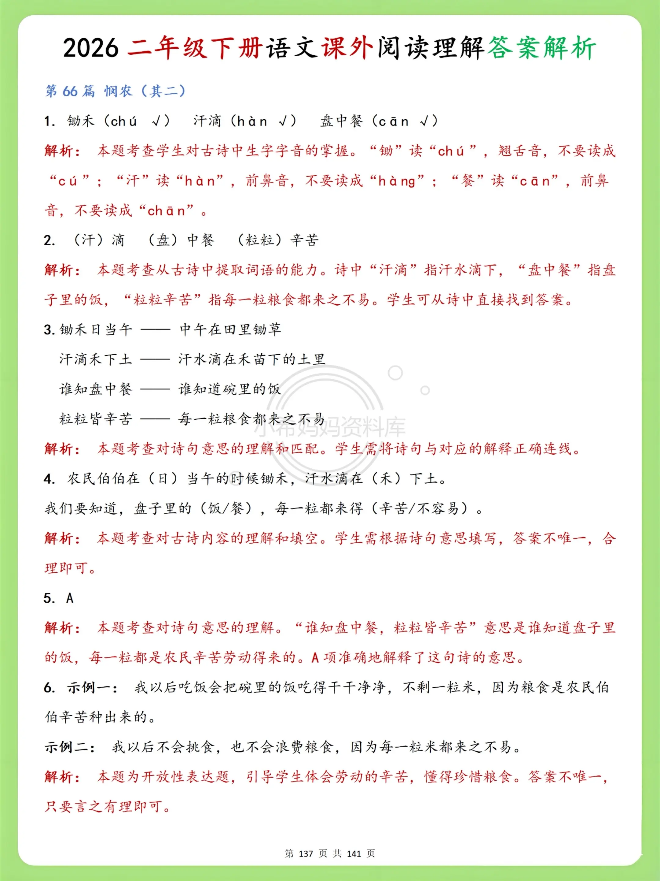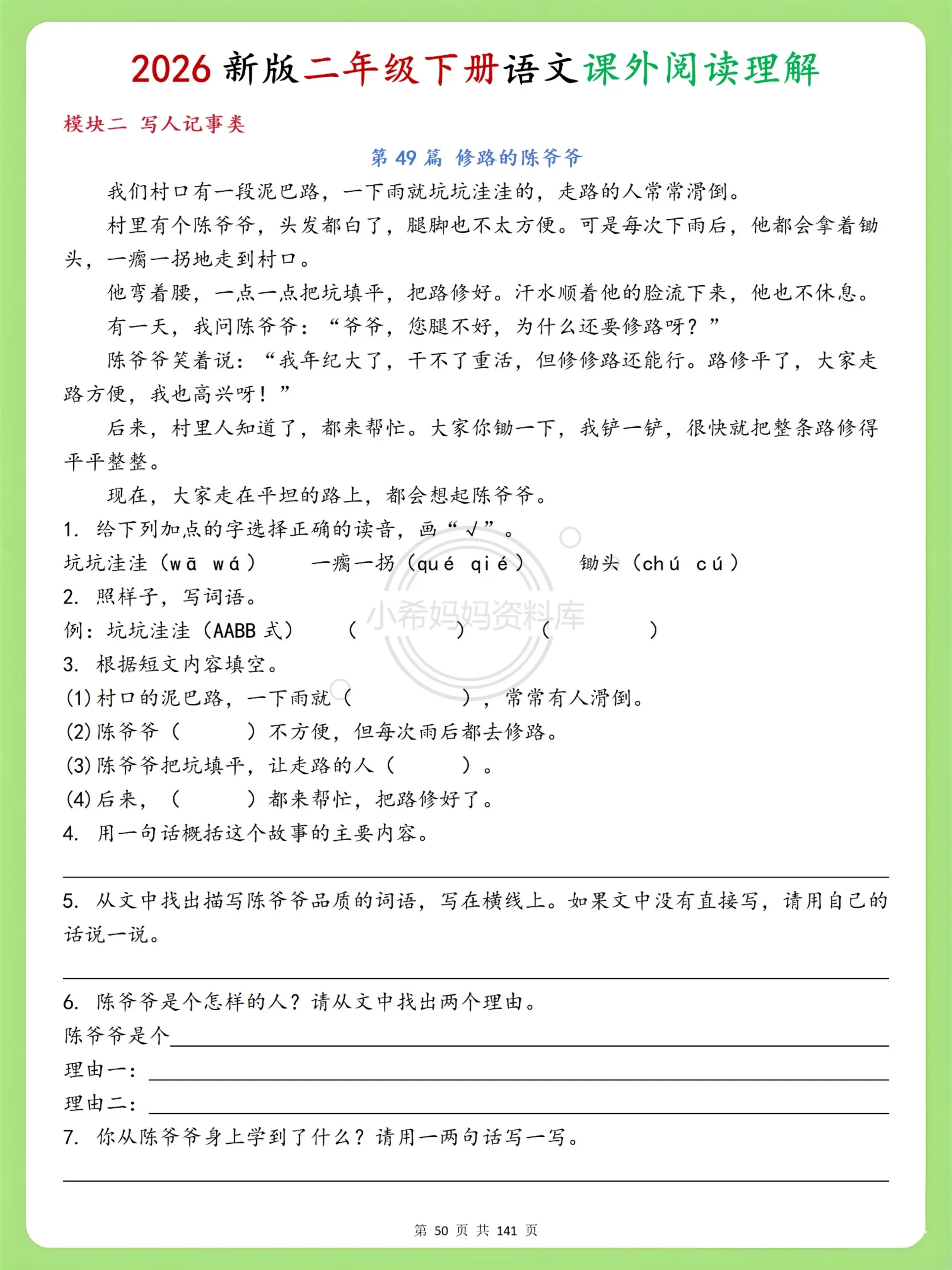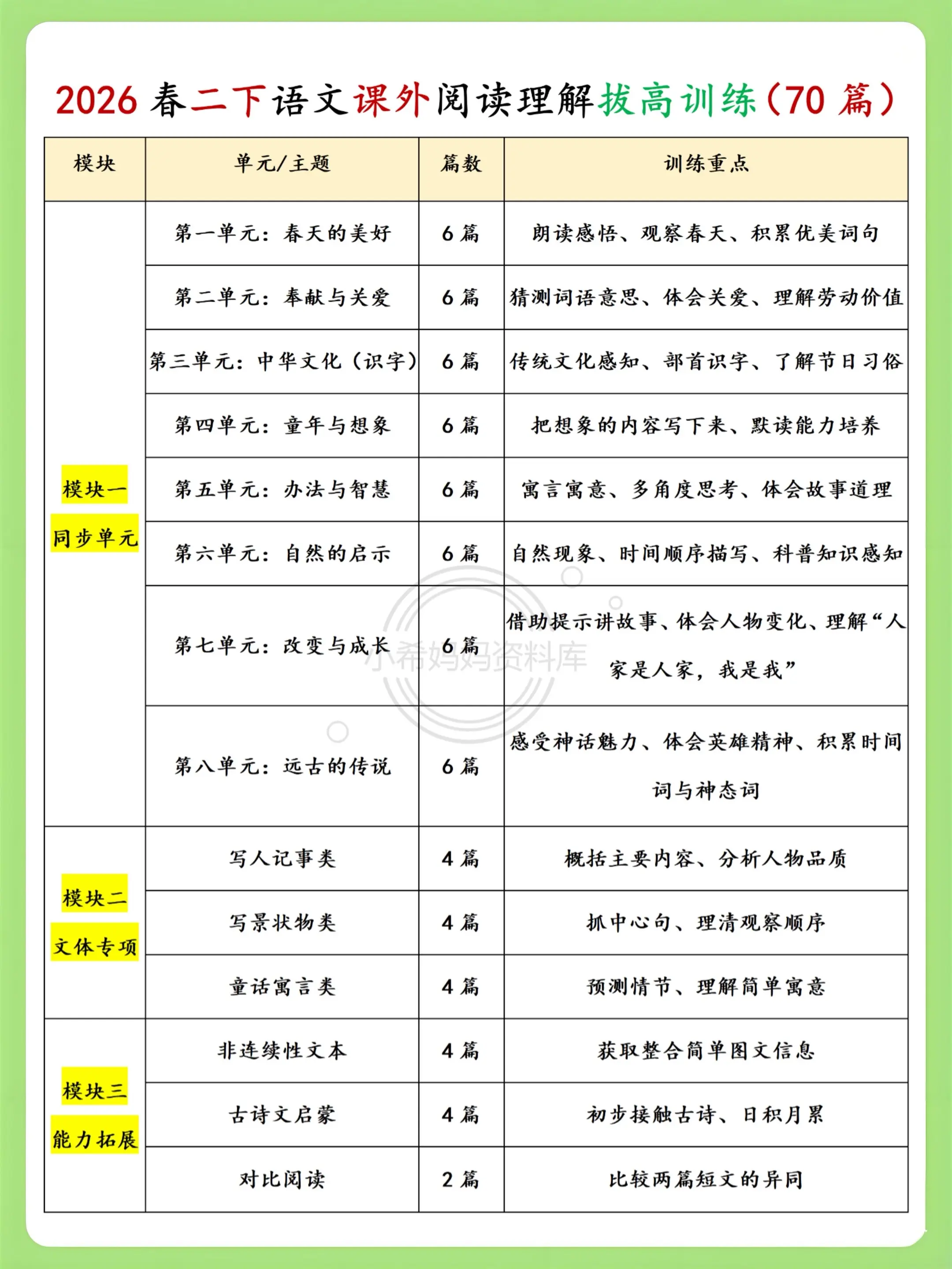 二下语文阅读理解70篇|附答案解析💯。家有二年级娃的宝妈看过来!整理了超全的课外阅读理解资料~ 涵盖春天主题、神话故事、非连续性文本、古诗文等超多题型,从基础的字音字词到句式仿写、情感理解,每篇都带详细答案解析,孩子做完能直接核对纠错,不用家长费心辅导! 题目难度贴合课本进度,图文结合不枯燥,既能巩固课内知识,又能提升阅读和表达能力,每天练1篇,语文成绩悄悄拔尖~