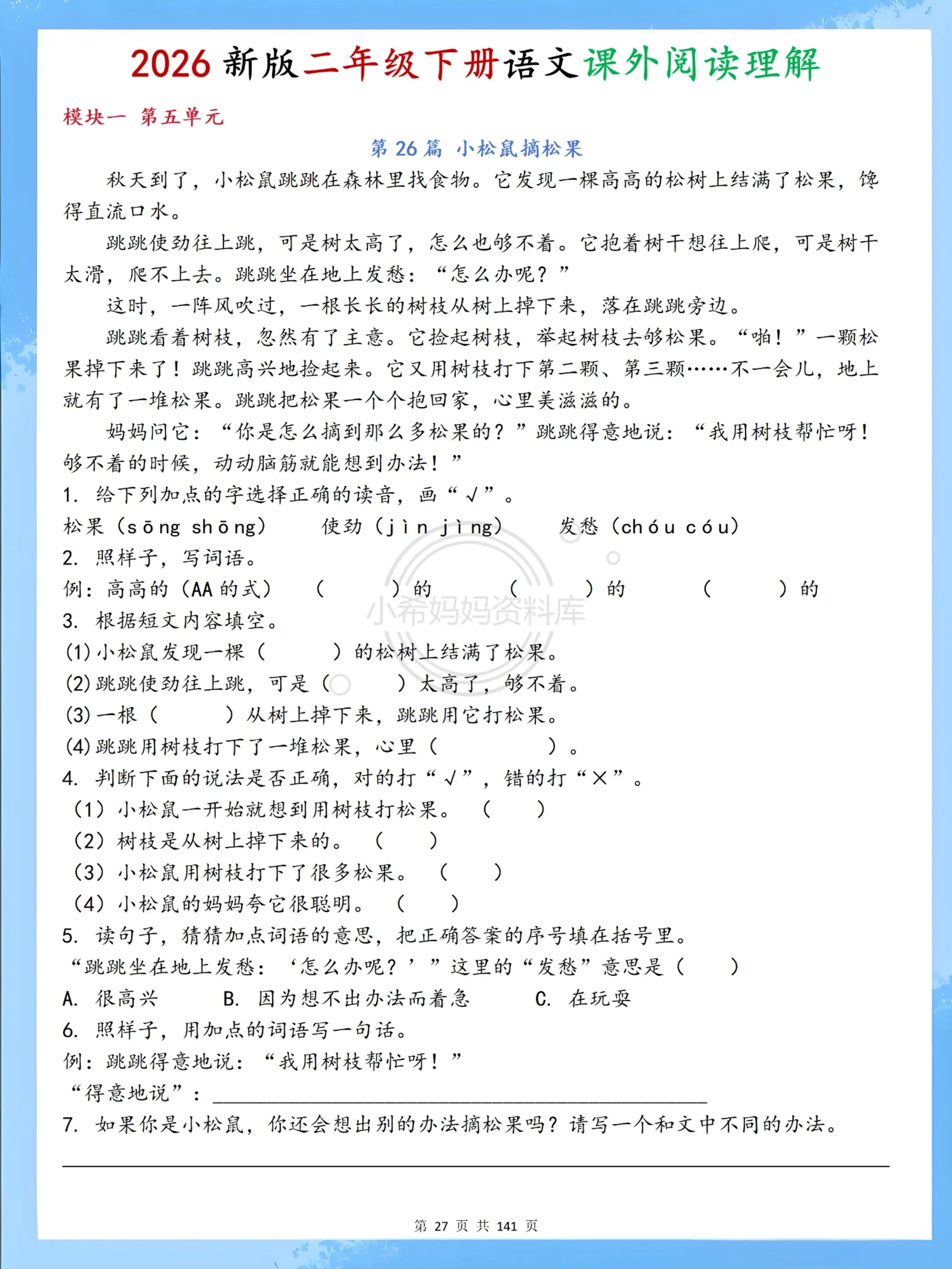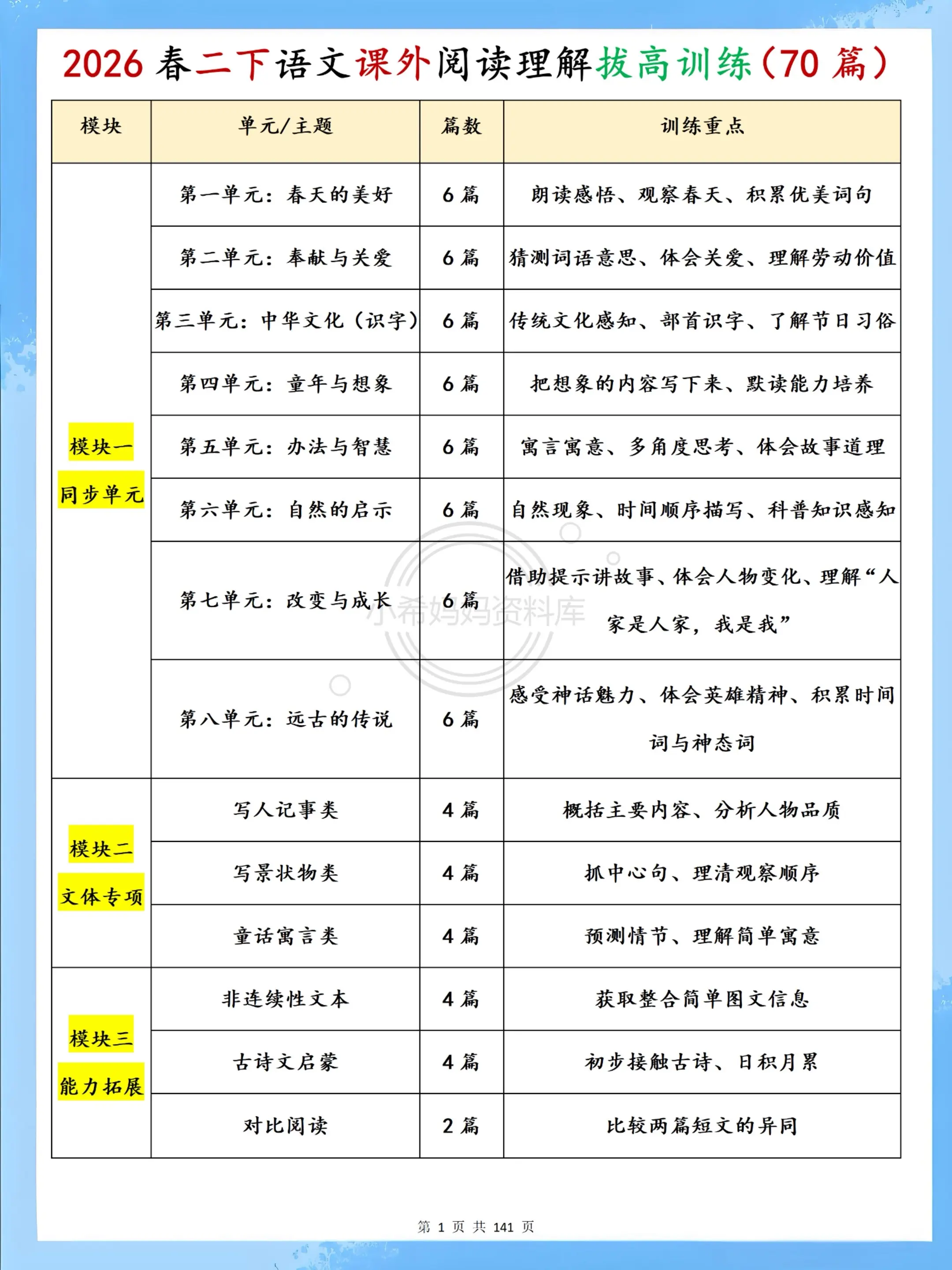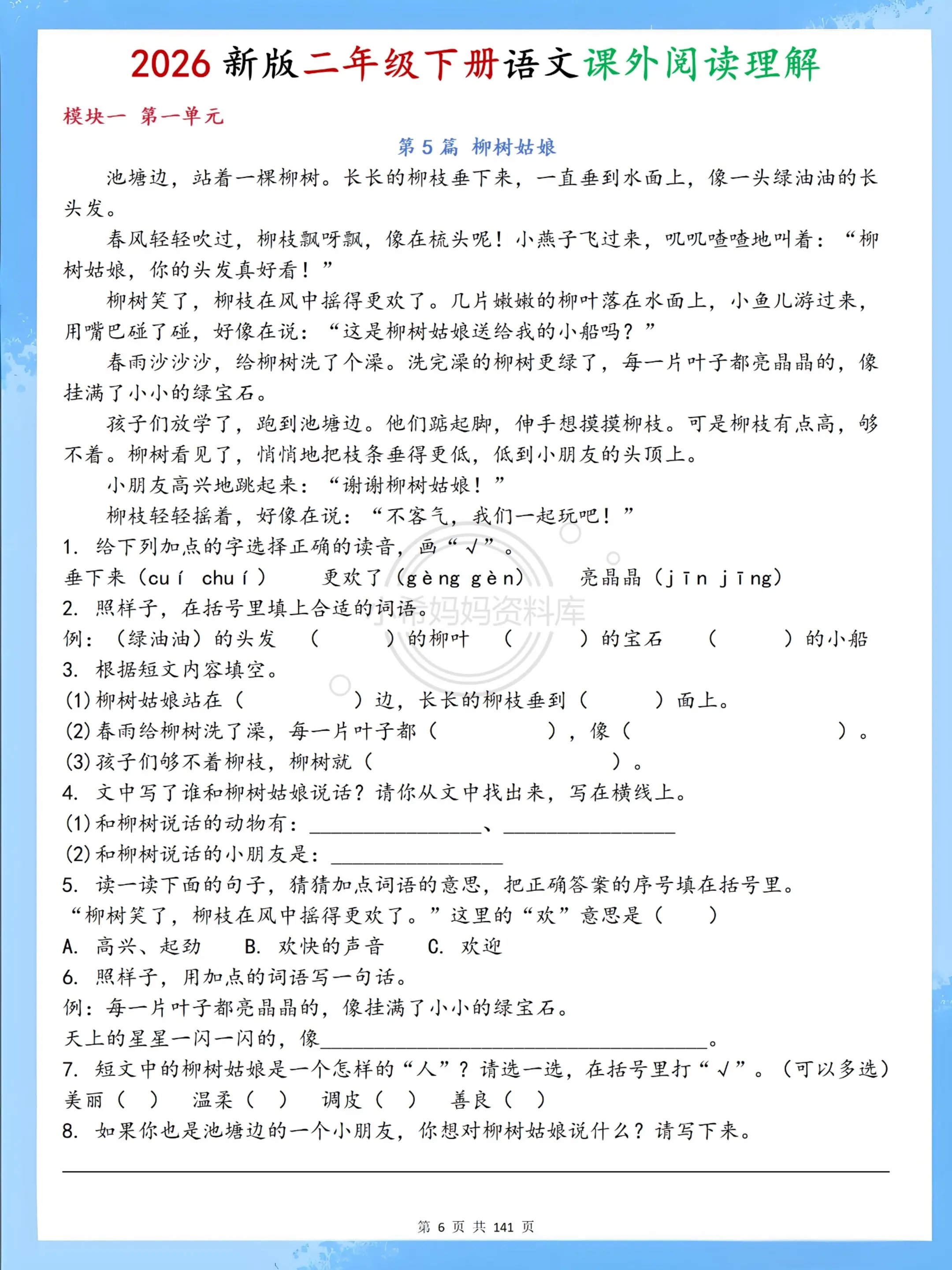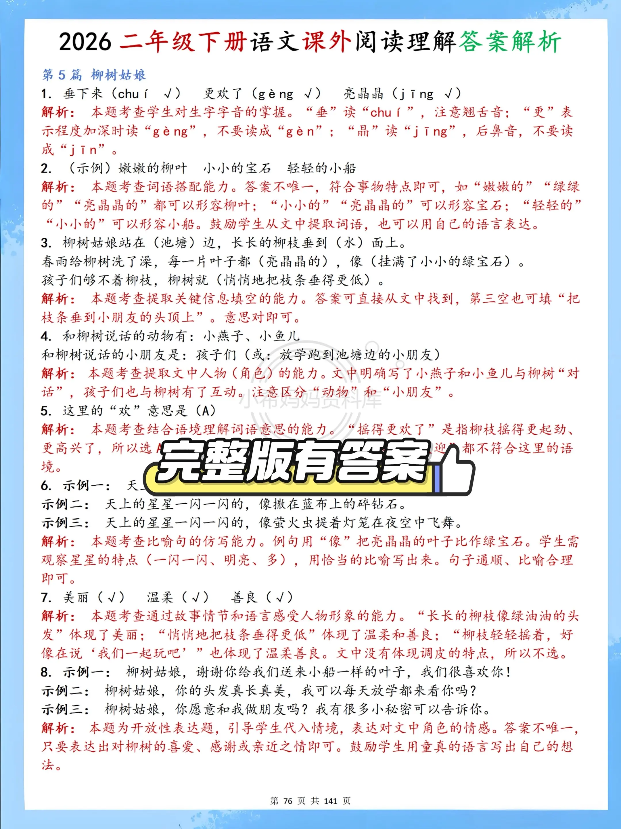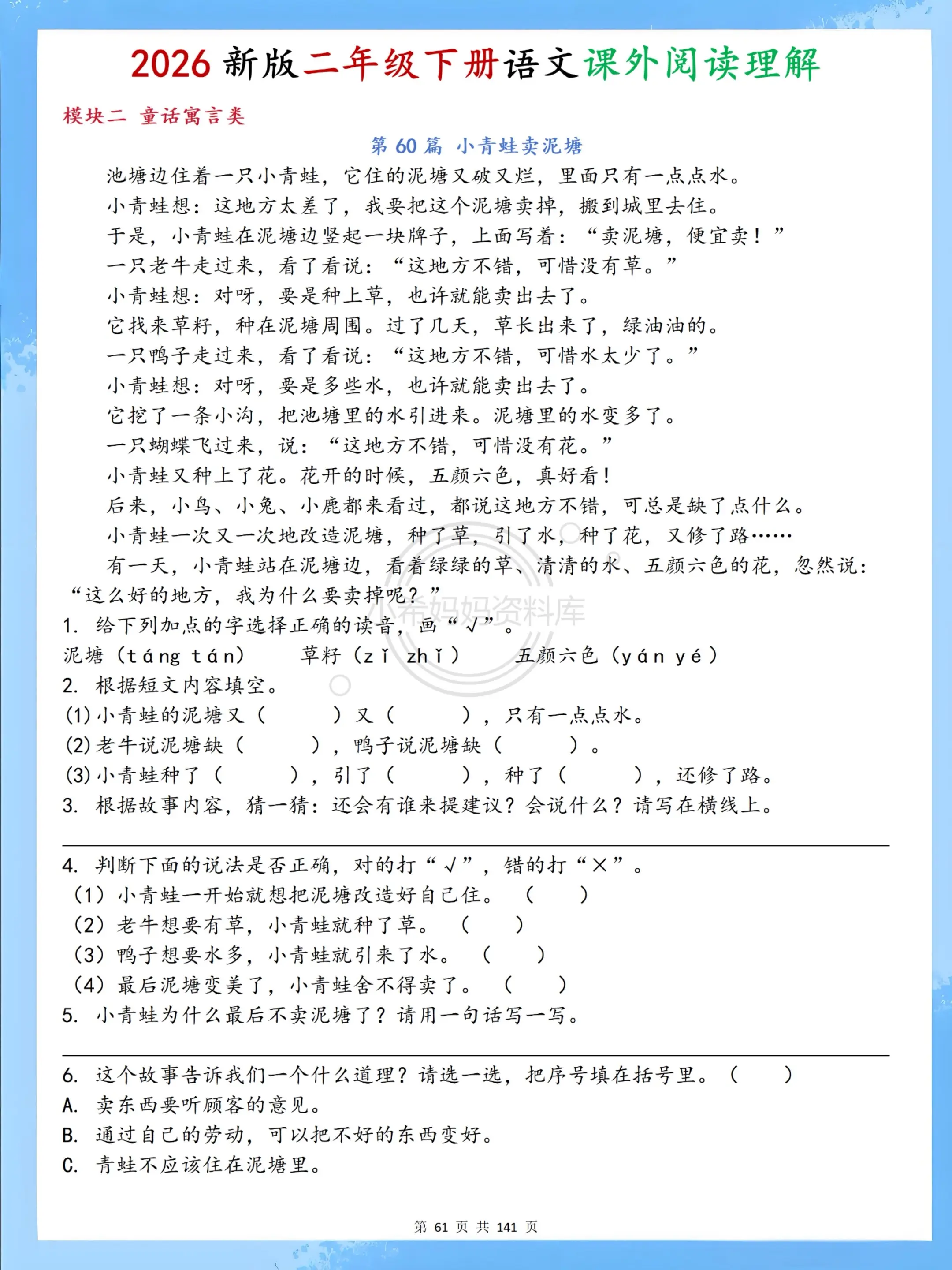 二年级下册阅读理解70篇|专项提分必练✨。二年级下册语文课外阅读全套70篇来啦!紧扣课本单元主题,涵盖写景、写人、寓言、神话、古诗、非连续性文本六大必考题型,每篇都带标准答案+详细解析,字音字形、仿写句子、中心思想、答题技巧一步到位。 不用家长批改,孩子每天练一篇,阅读能力飞速提升,课内巩固+课外拓展双达标,期末阅读不丢分,语文轻松拿高分!