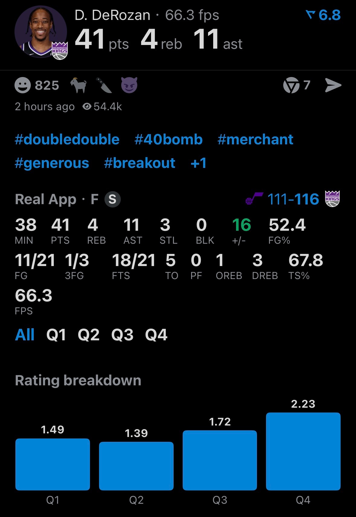 国王战胜爵士德罗赞41分爵士不信邪或者说太想让这些年轻的爵士球员跟阿赞老师好好学习一下得分后卫的技术了,真是古典又优雅,单防不夹击,那真是几乎个个进,于是背靠背第二天,赛季新高41分