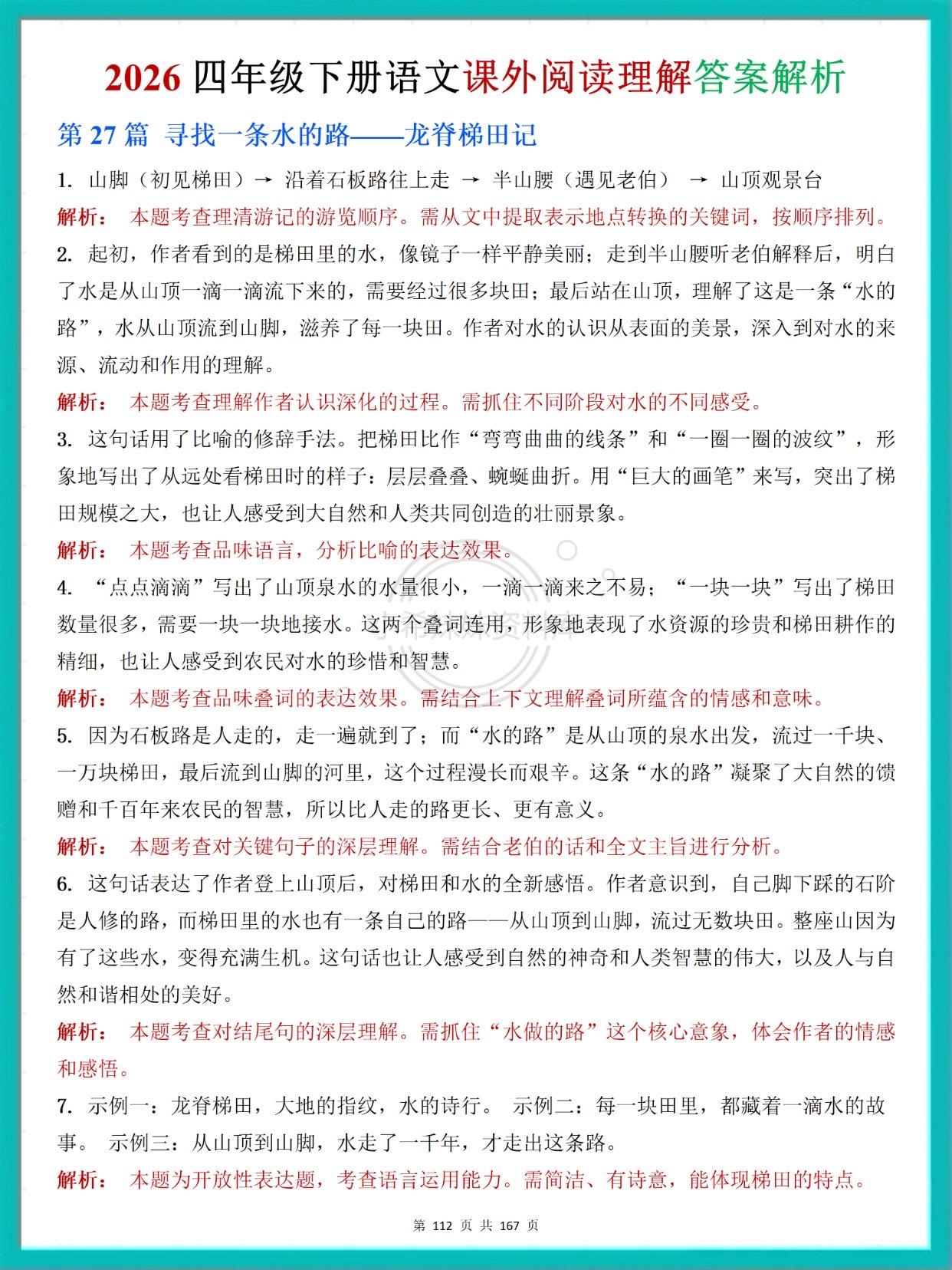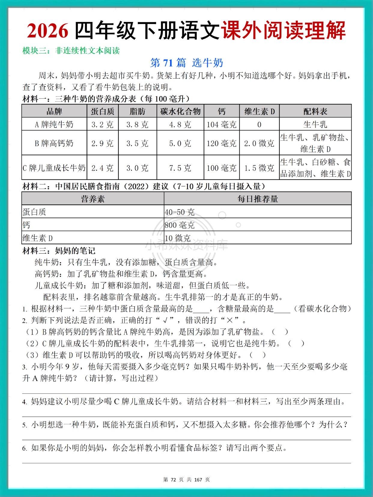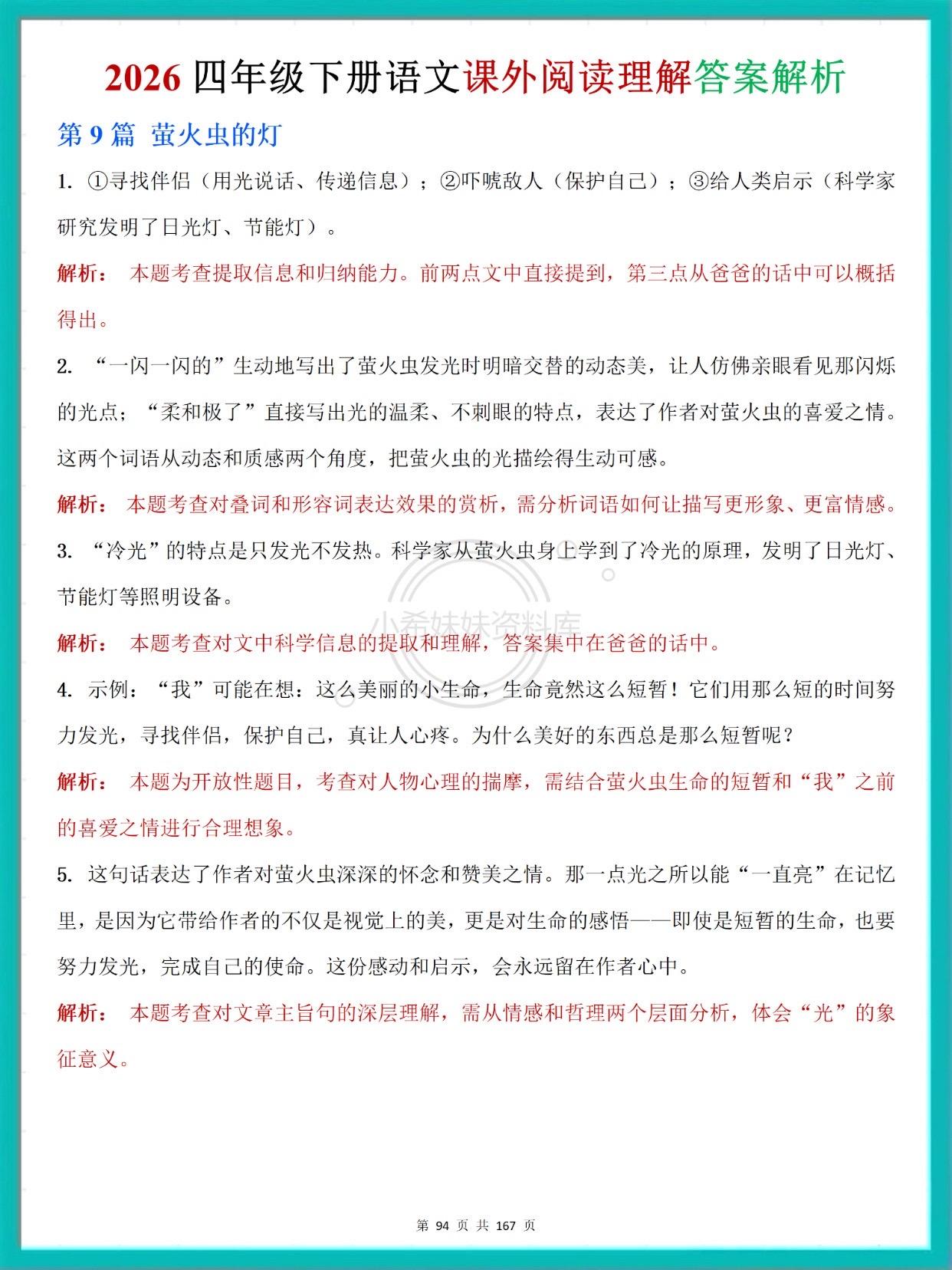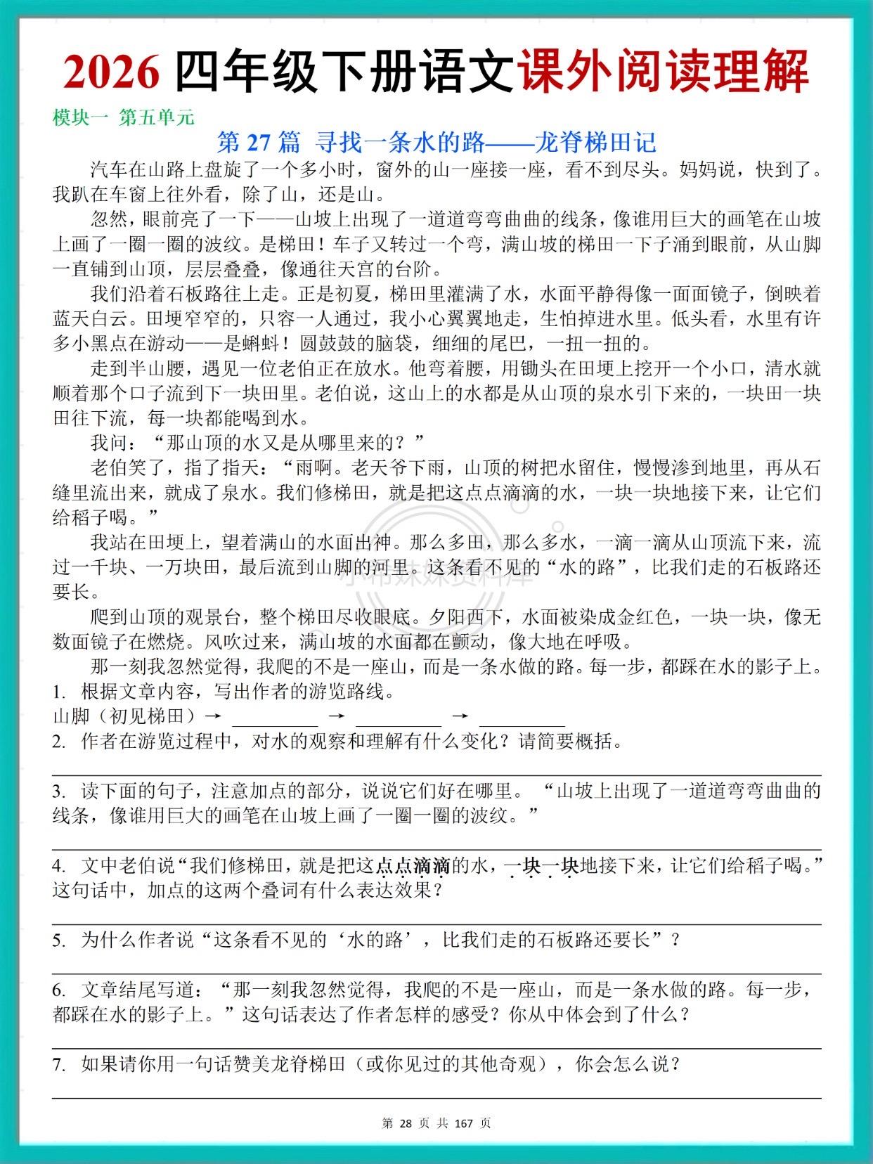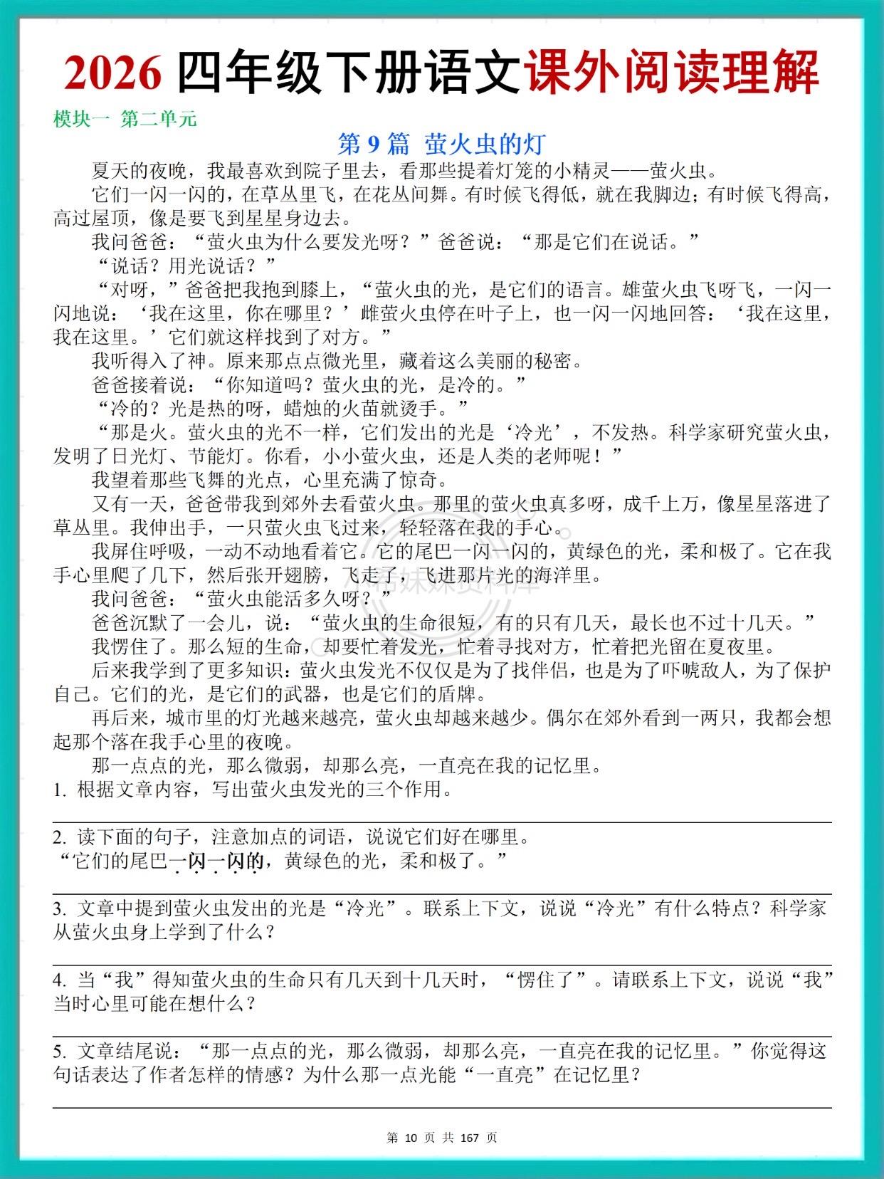四年级语文下册课外阅读理解每日一练82篇。四年级语文阅读总拖后腿?冲分...