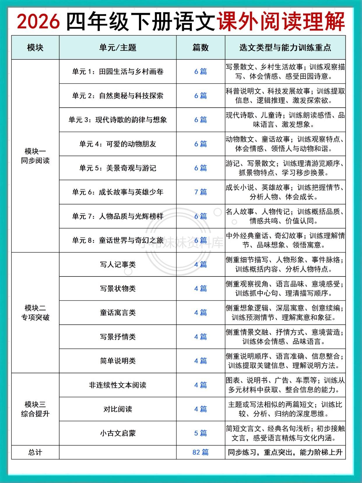 四年级语文下册课外阅读理解每日一练82篇。四年级语文阅读总拖后腿?冲分就靠它! 精准同步人教版四下课本,紧扣课堂单元知识点 写人、写景、科普、小古文全涵盖,考题题型全覆盖 详细解析+答题思路,词句赏析、内容概括全搞定 课后随堂练、单元复习、查漏补缺一站式搞定 孩子自主刷题无压力,家长辅导完全不费神 吃透这套,阅读答题又快又准,单元测直接拿高分💯