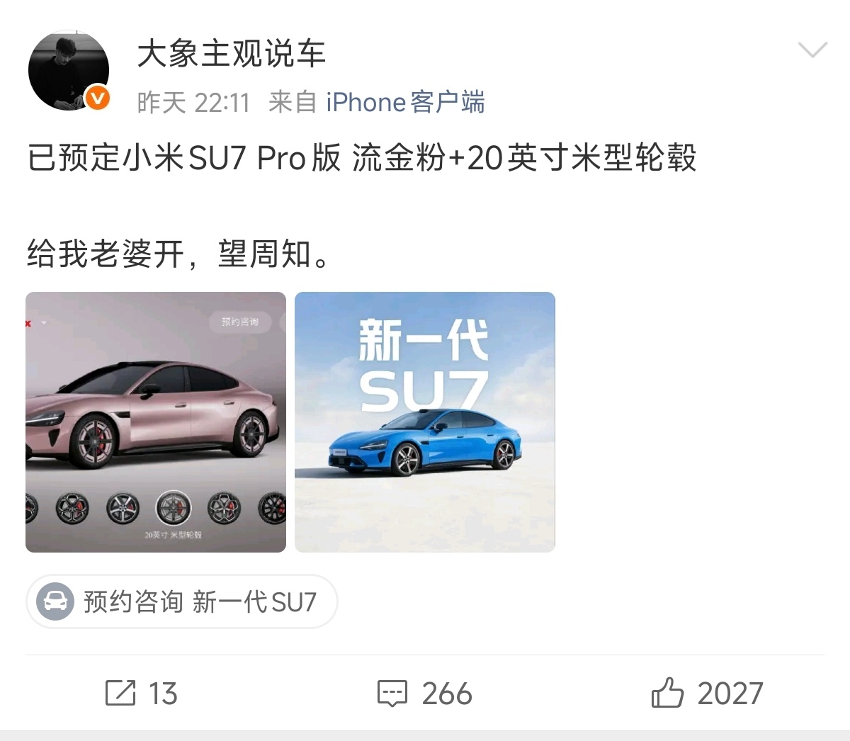 大象主管说车,定了一辆小米SU7Pro流金粉,20寸米型轮毂。