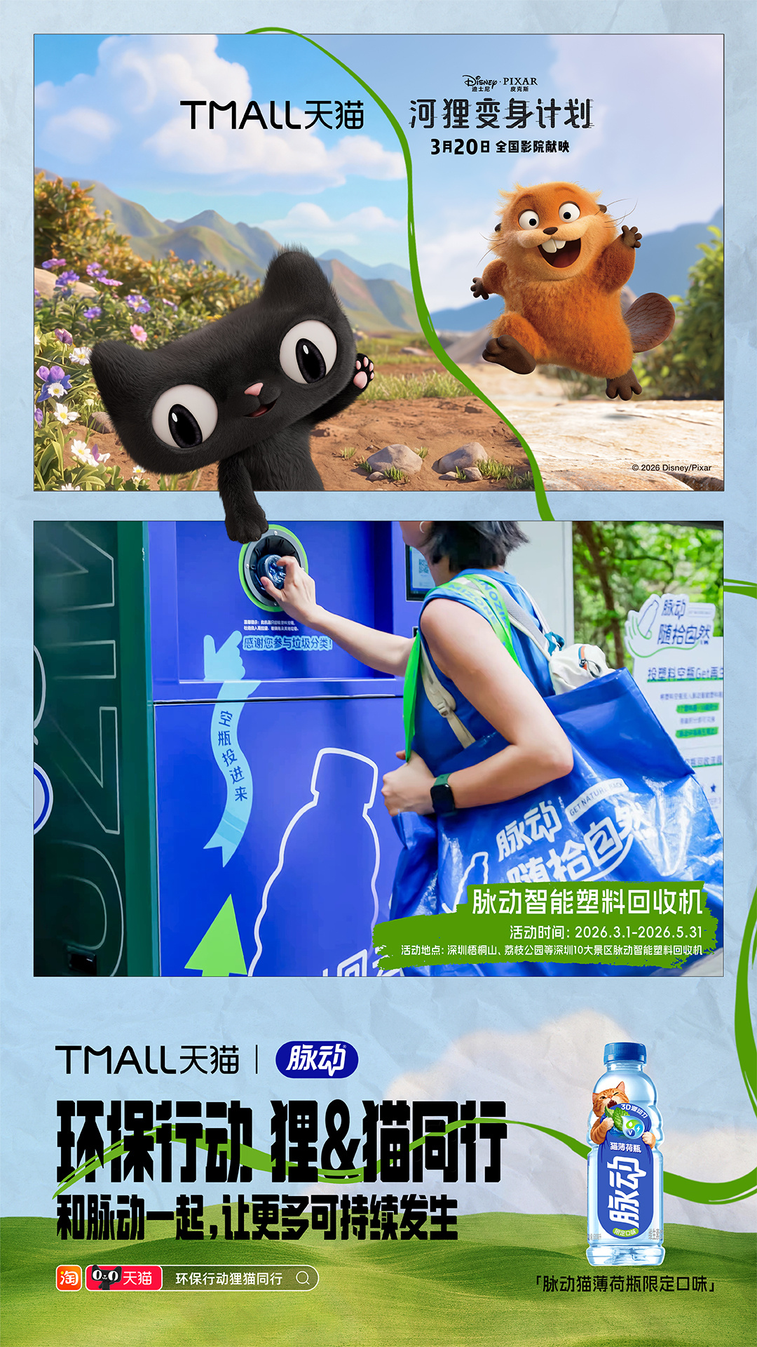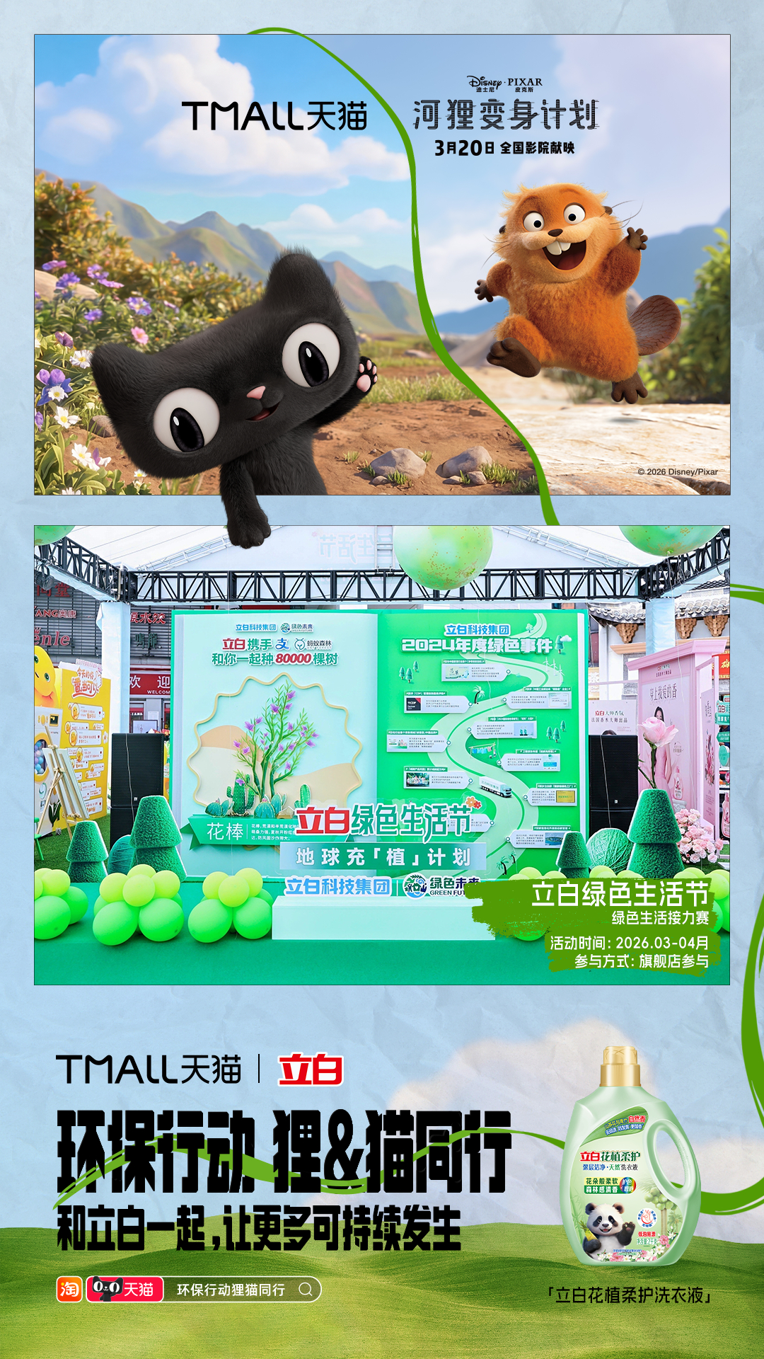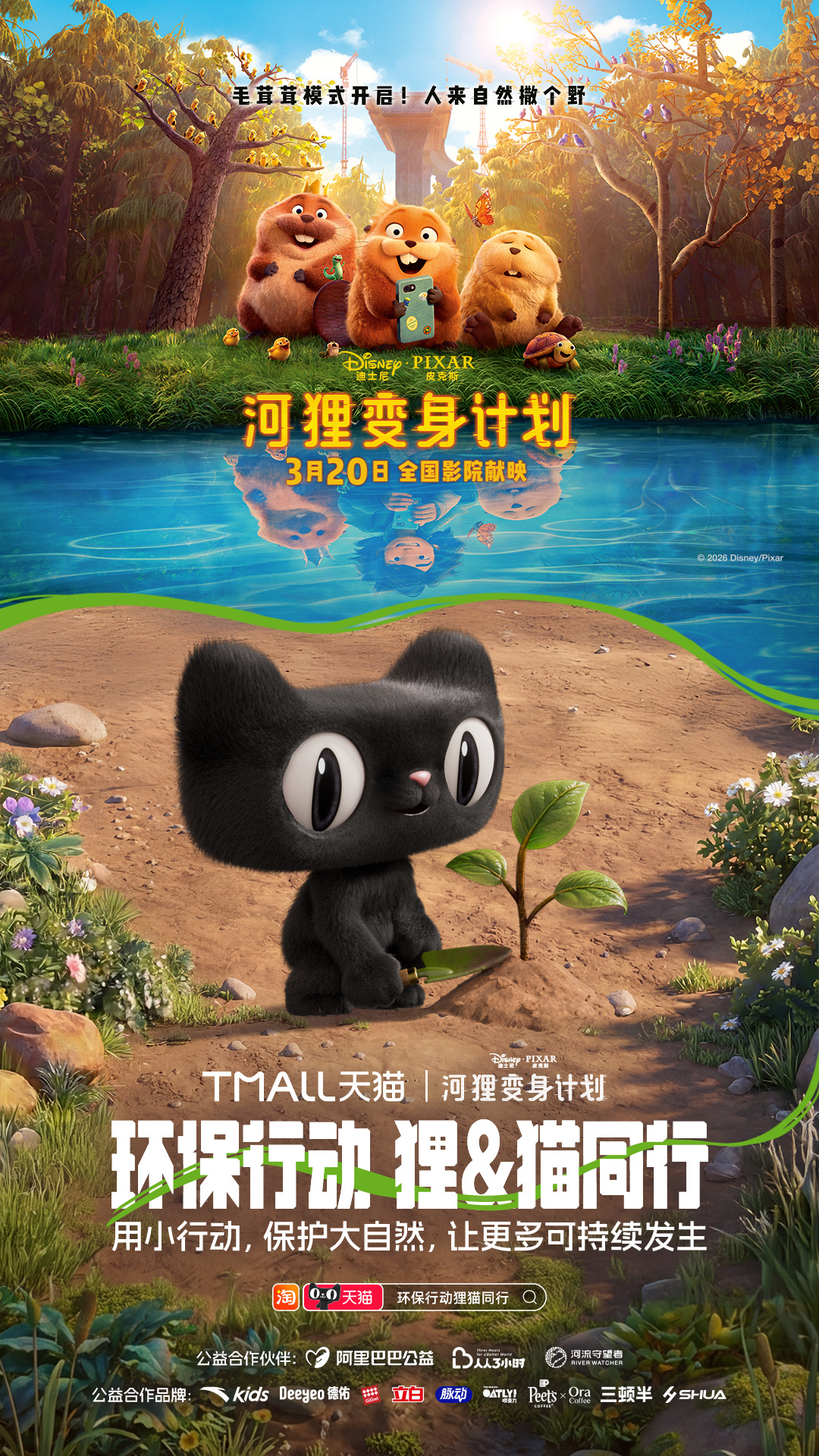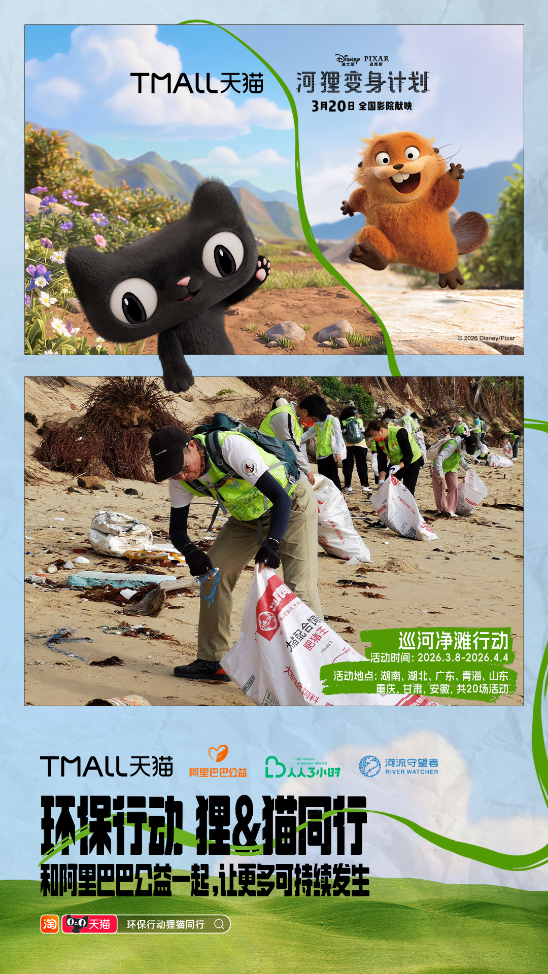 环保行动狸猫同行 《河狸变身计划》确实值得一看,用又癫又可爱的诙谐叙事,让观众产生对人类与自然关系的深刻反思。电影之外,《河狸变身计划》和天猫搞了一波神联动,携手品牌发起10大环保活动:巡滩捡塑、空罐回收、为地球充“植”……把保护地球变成了超多有趣又日常的选择,让每个人都可以加入进来, 上淘宝🔍「环保行动狸猫同行」,认准天猫旗舰店,参与品牌环保行动,活动现场可领取猫天天×《河狸变身计划》主题环保杯!淘宝购物清单