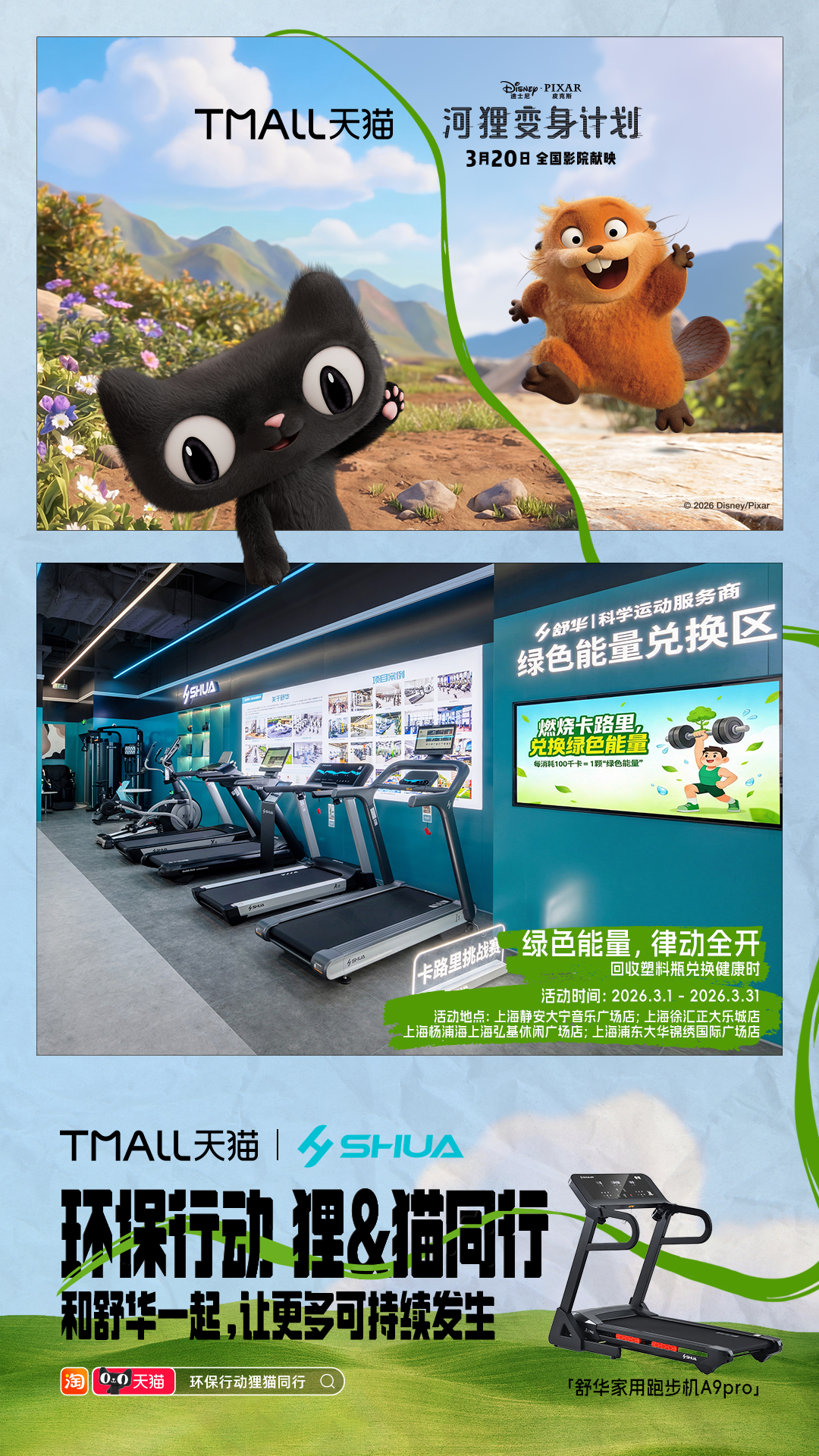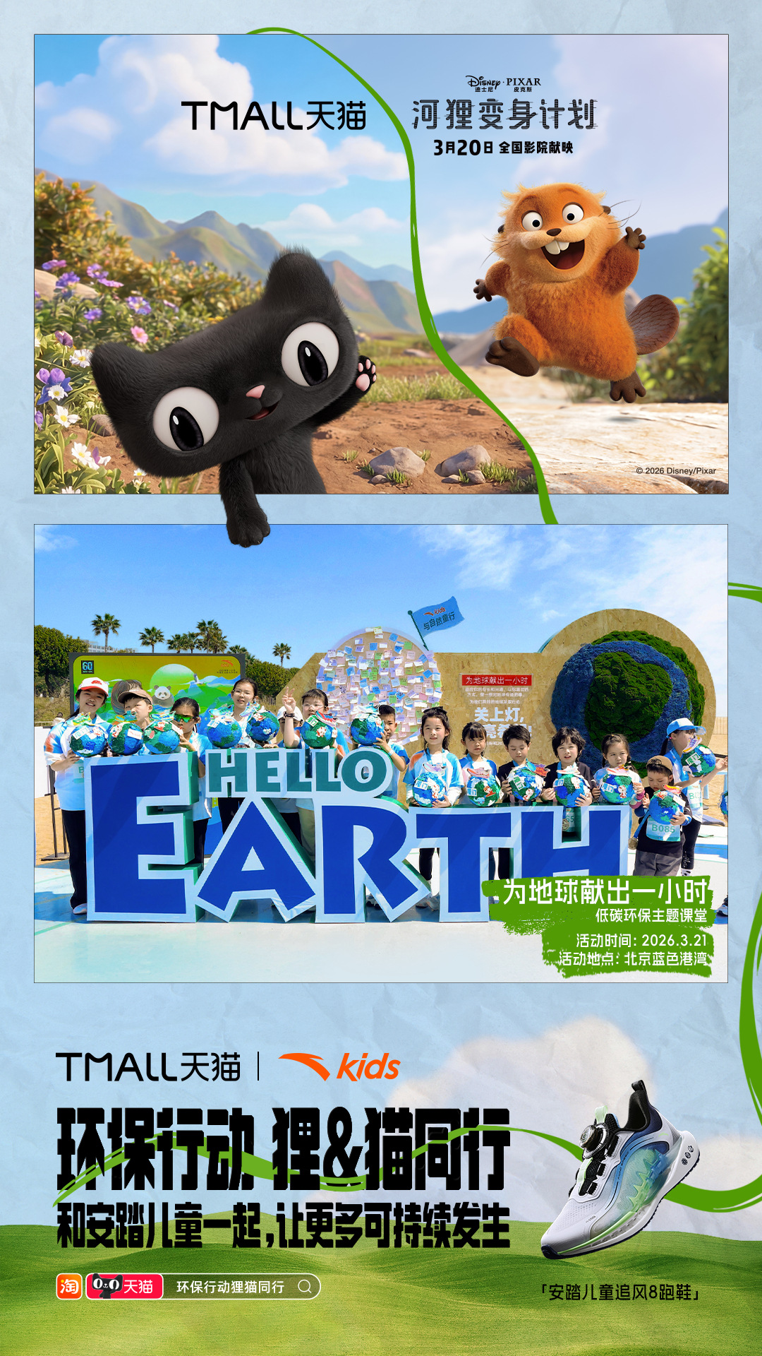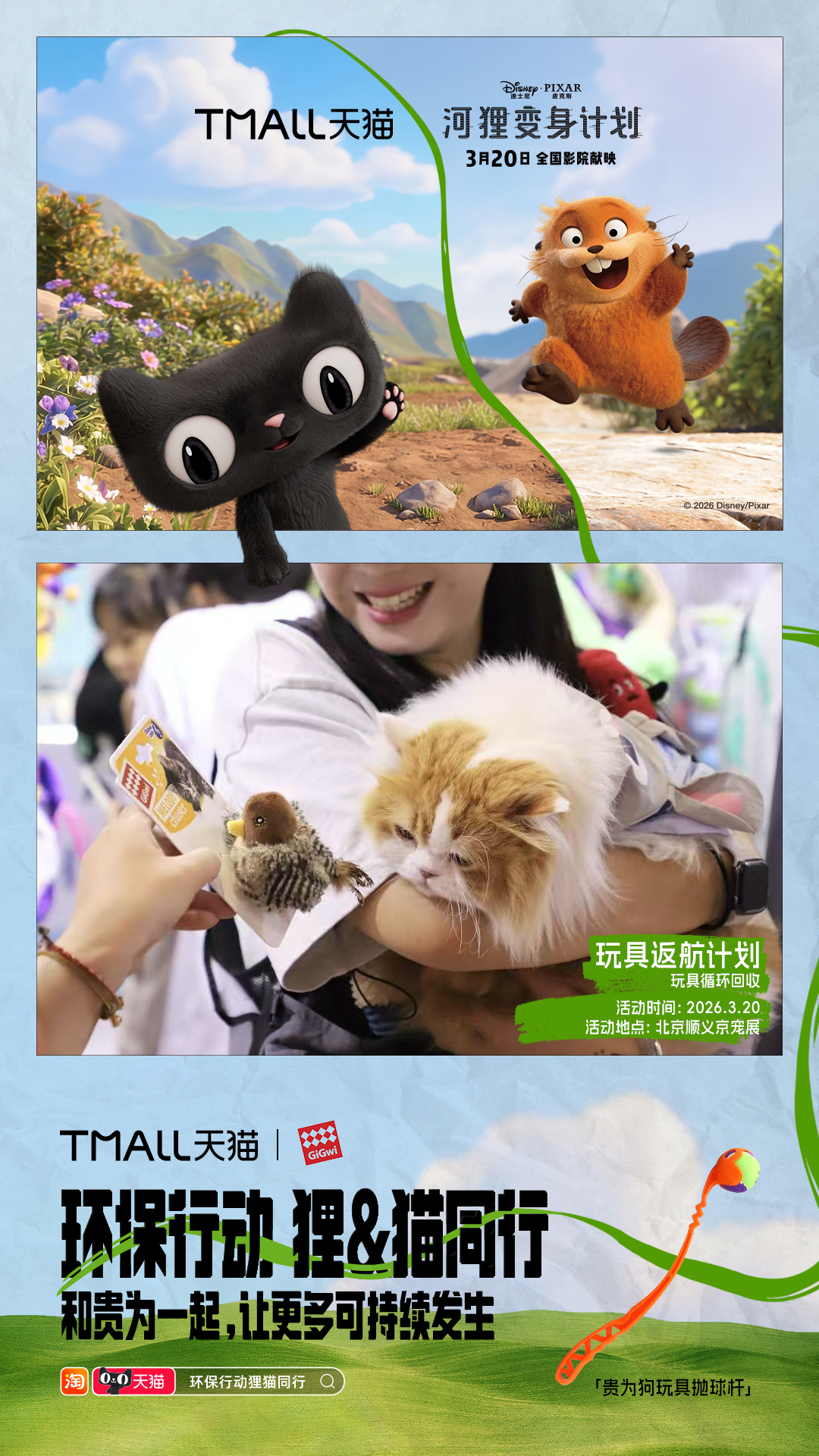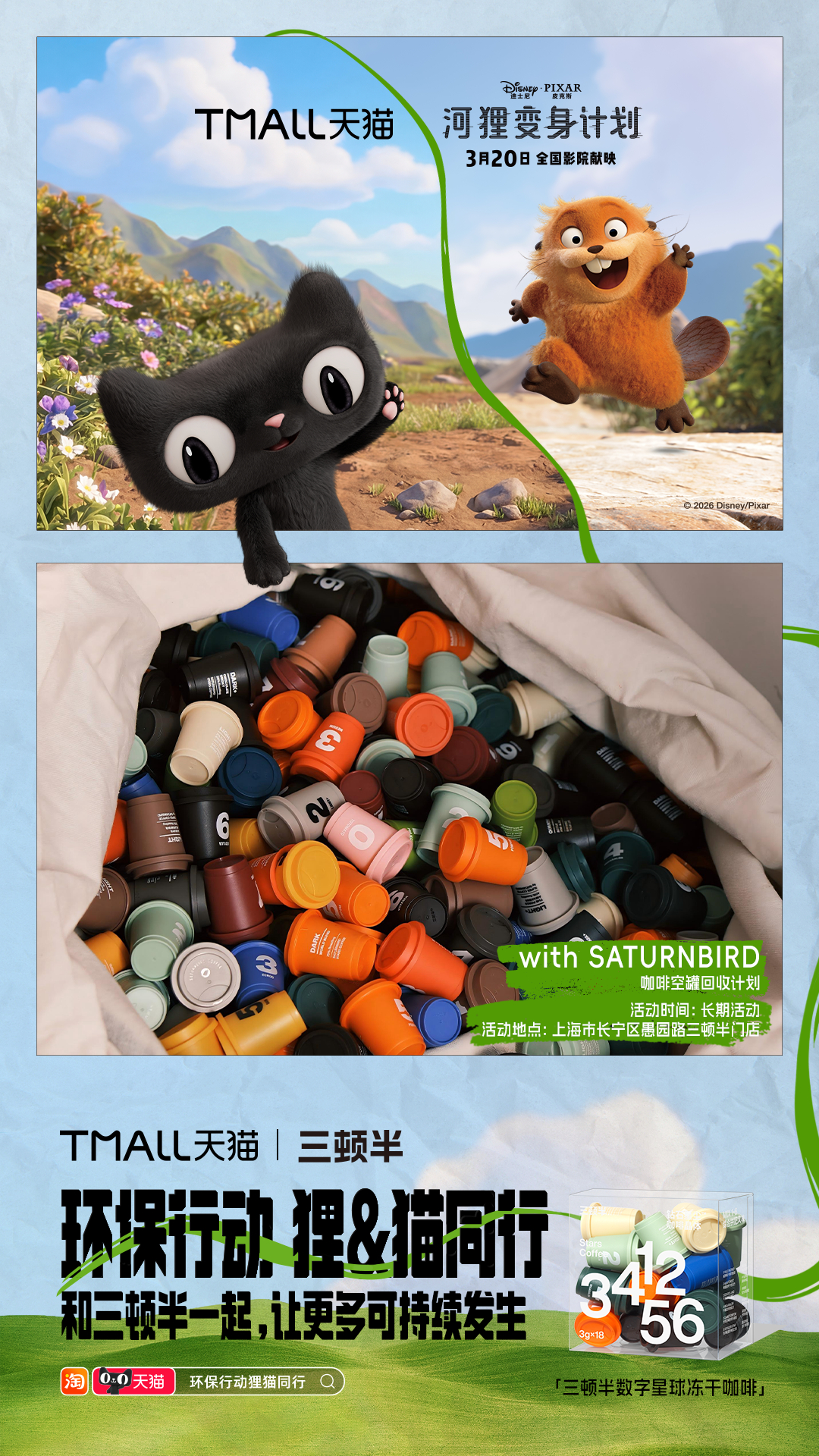 环保行动狸猫同行 《河狸变身计划》确实值得一看,用又癫又可爱的诙谐叙事,让观众产生对人类与自然关系的深刻反思。电影之外,《河狸变身计划》和天猫搞了一波神联动,携手品牌发起10大环保活动:巡滩捡塑、空罐回收、为地球充“植”……把保护地球变成了超多有趣又日常的选择,让每个人都可以加入进来, 上淘宝🔍「环保行动狸猫同行」,认准天猫旗舰店,参与品牌环保行动,活动现场可领取猫天天×《河狸变身计划》主题环保杯!淘宝购物清单