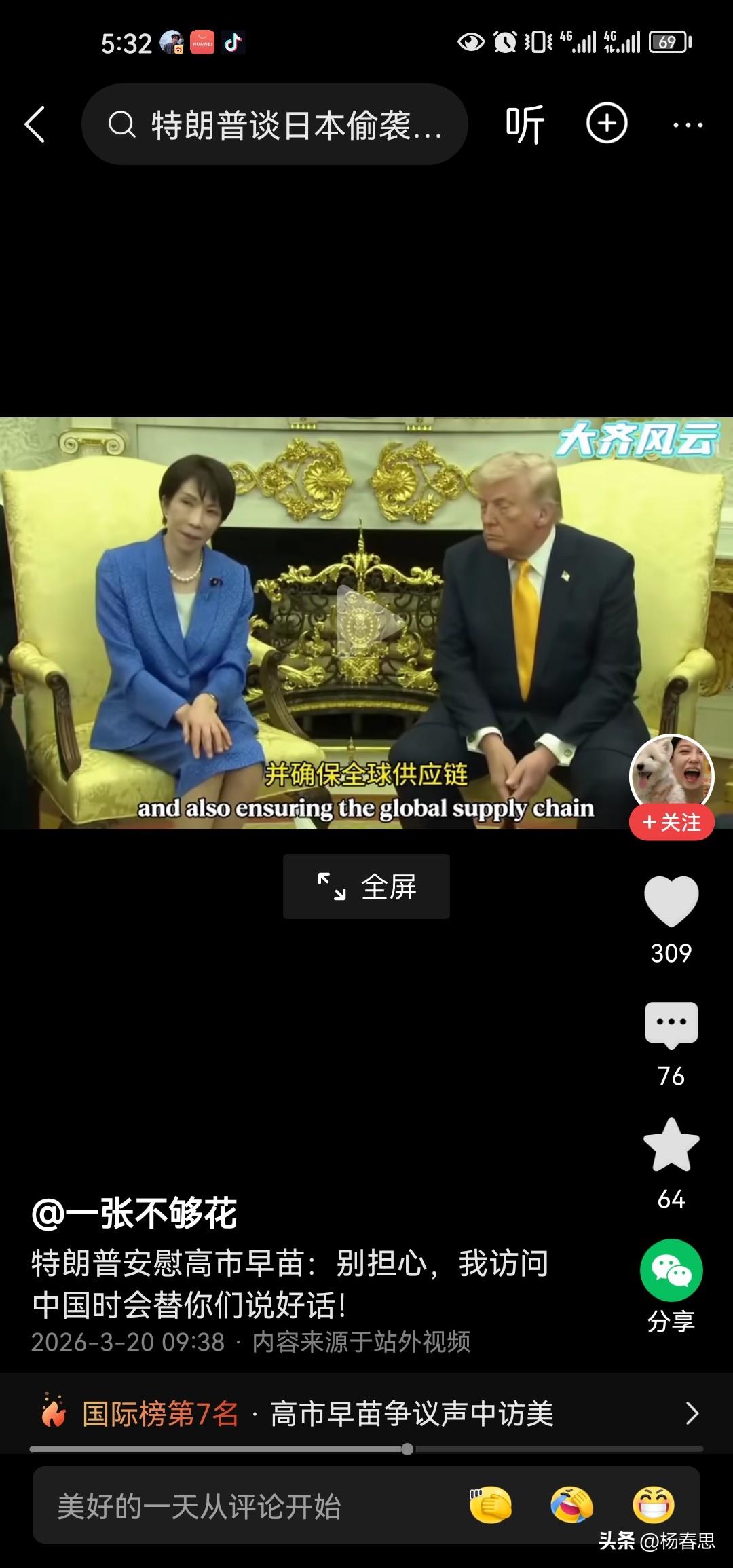高市早苗跑到美国去向特朗普哭诉说,中国对日本进行供应链严厉制裁。要求特朗普为日本说情。特朗普答应了说他访问中国的时候会为日本说好话。呵呵,找谁说都不好使,早苗已经触碰了中国🇨🇳的底线,而且现在还是一直很强硬的态度。令人不爽的是,她在特朗普面前表现得很娇羞,一副郎情妾意小娇妻做态。