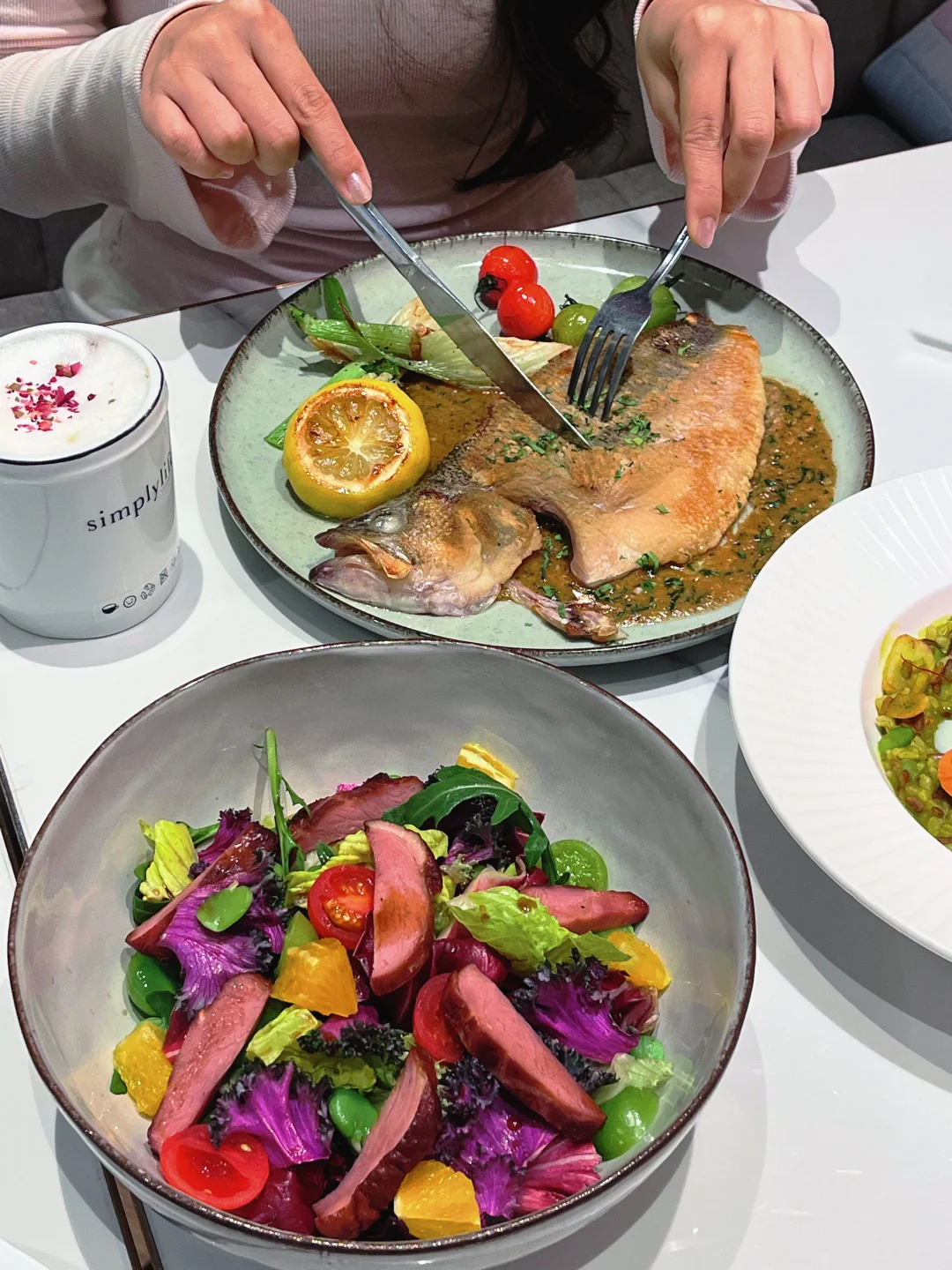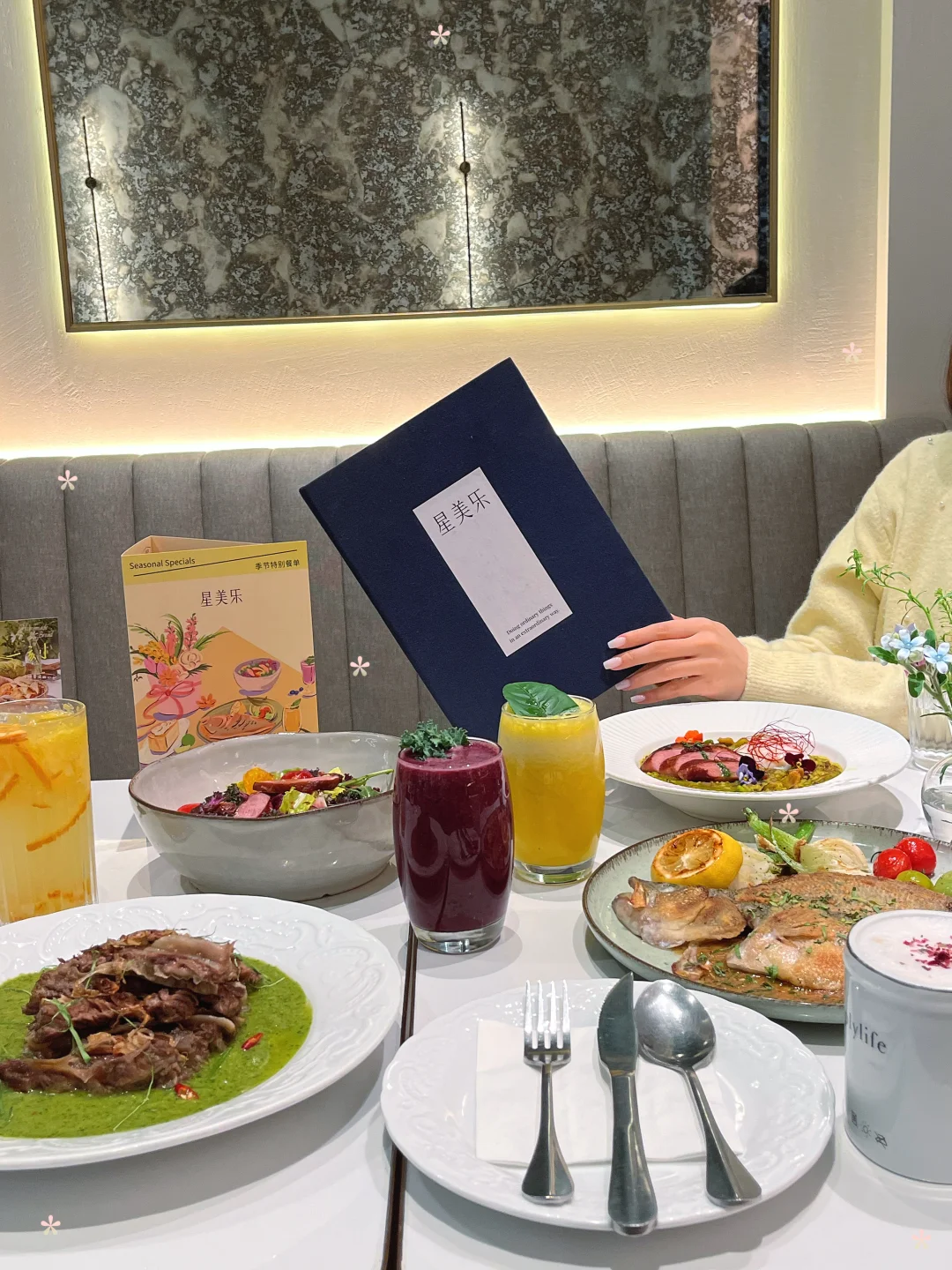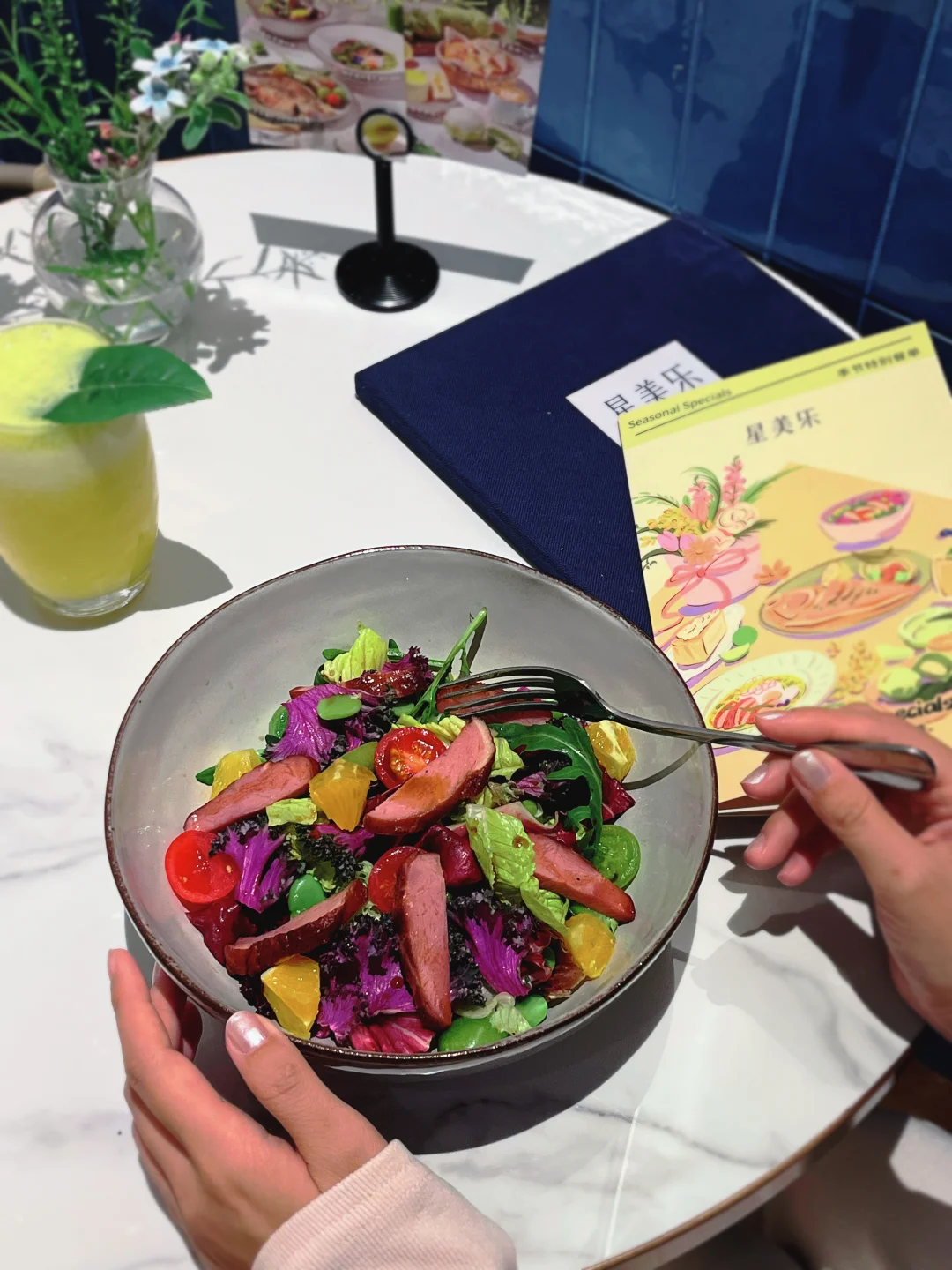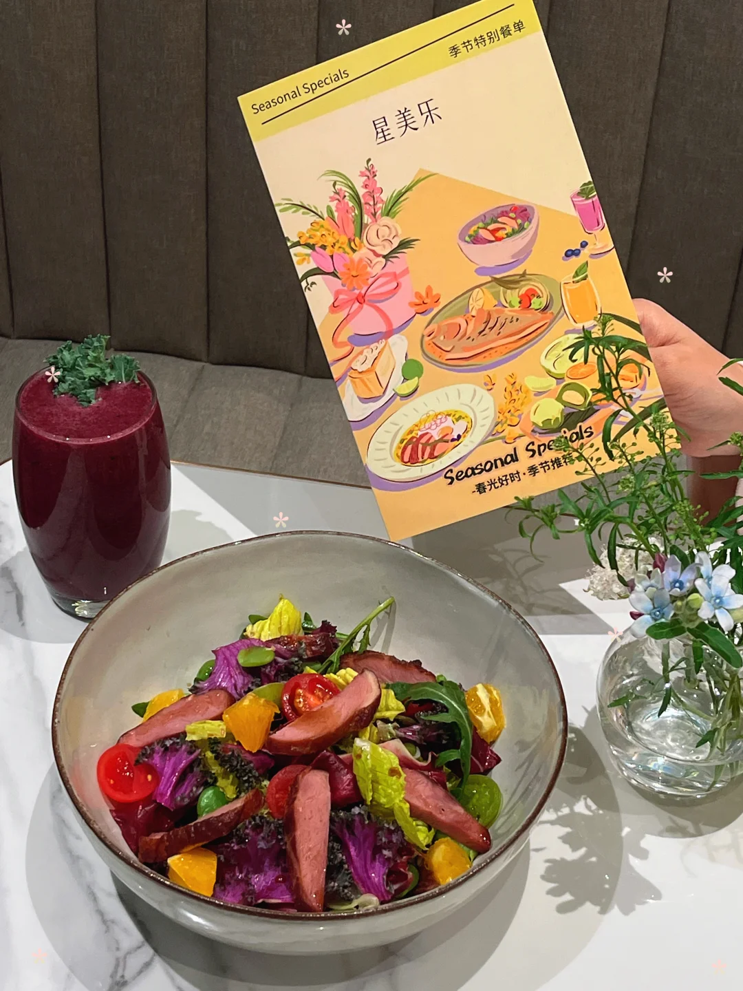 周末放晴|和姐妹溜达来到罗湖万象城 (星美乐他们家还蛮喜欢吃😍天然健康又减脂的轻食🥗和姐妹坐着简单的聊天..再合适不过..这样的幸福有点过头啦😏 这次测评他们家的踏春套餐🥗 非常春天且又幸福的一餐 ⚪️紫气东来+满杯菠萝+橙子泡泡 这几杯饮品真的好春天🍃橙子泡泡是我的最爱!健康又清爽..口感也不错 🥣香茅木姜子牛肋排 自制的香茅青柠酱汁好清爽牛肋排吃起来也没那么腻人~
