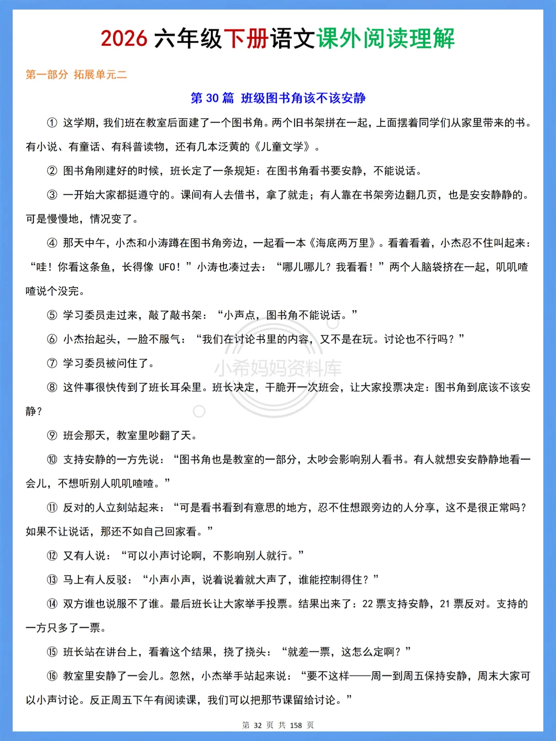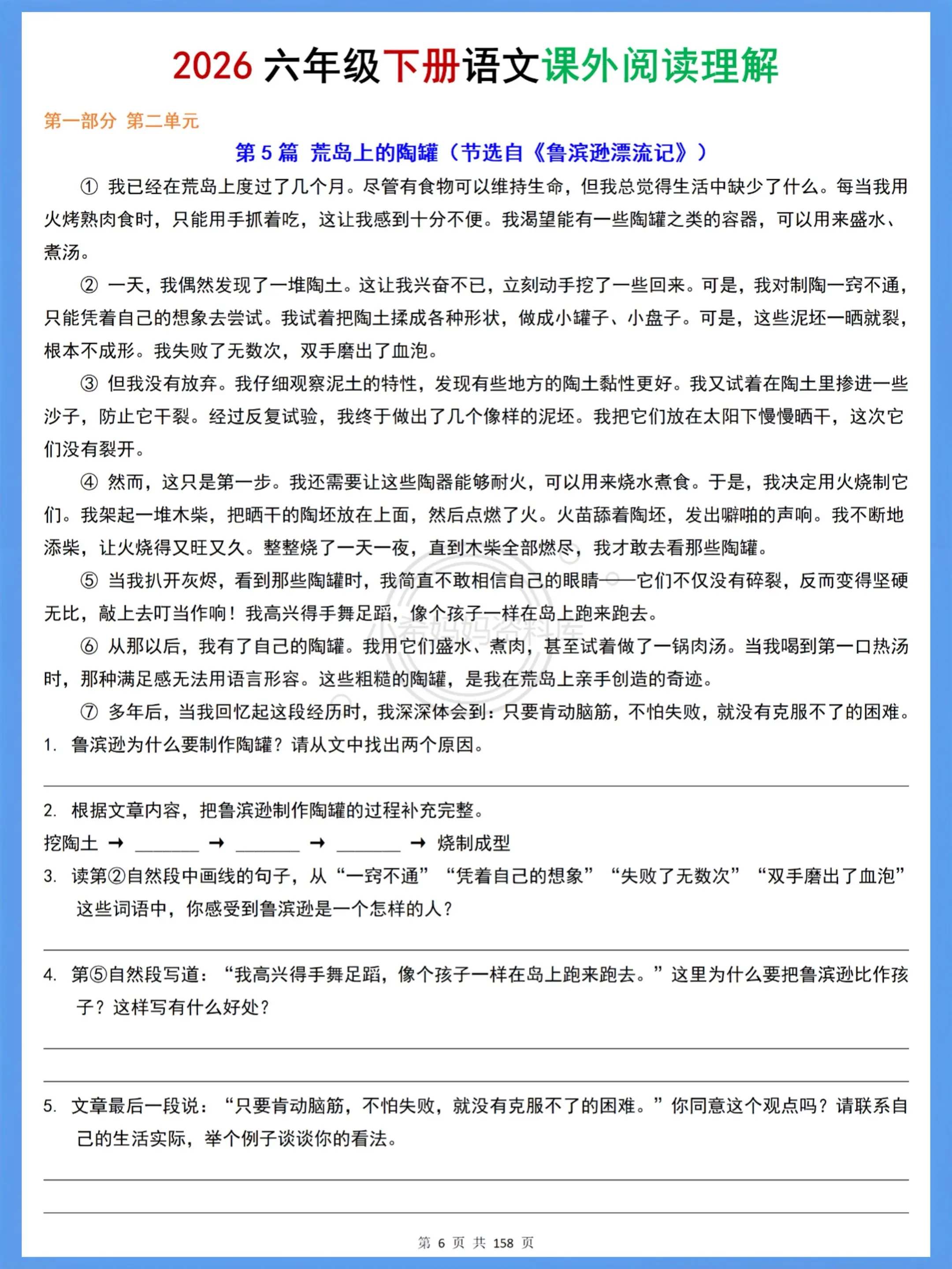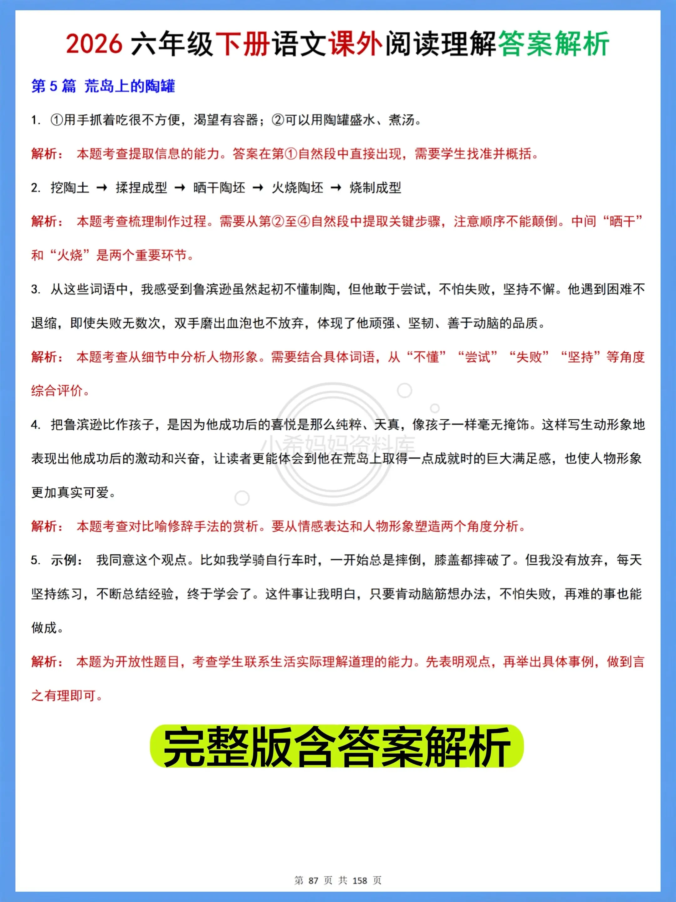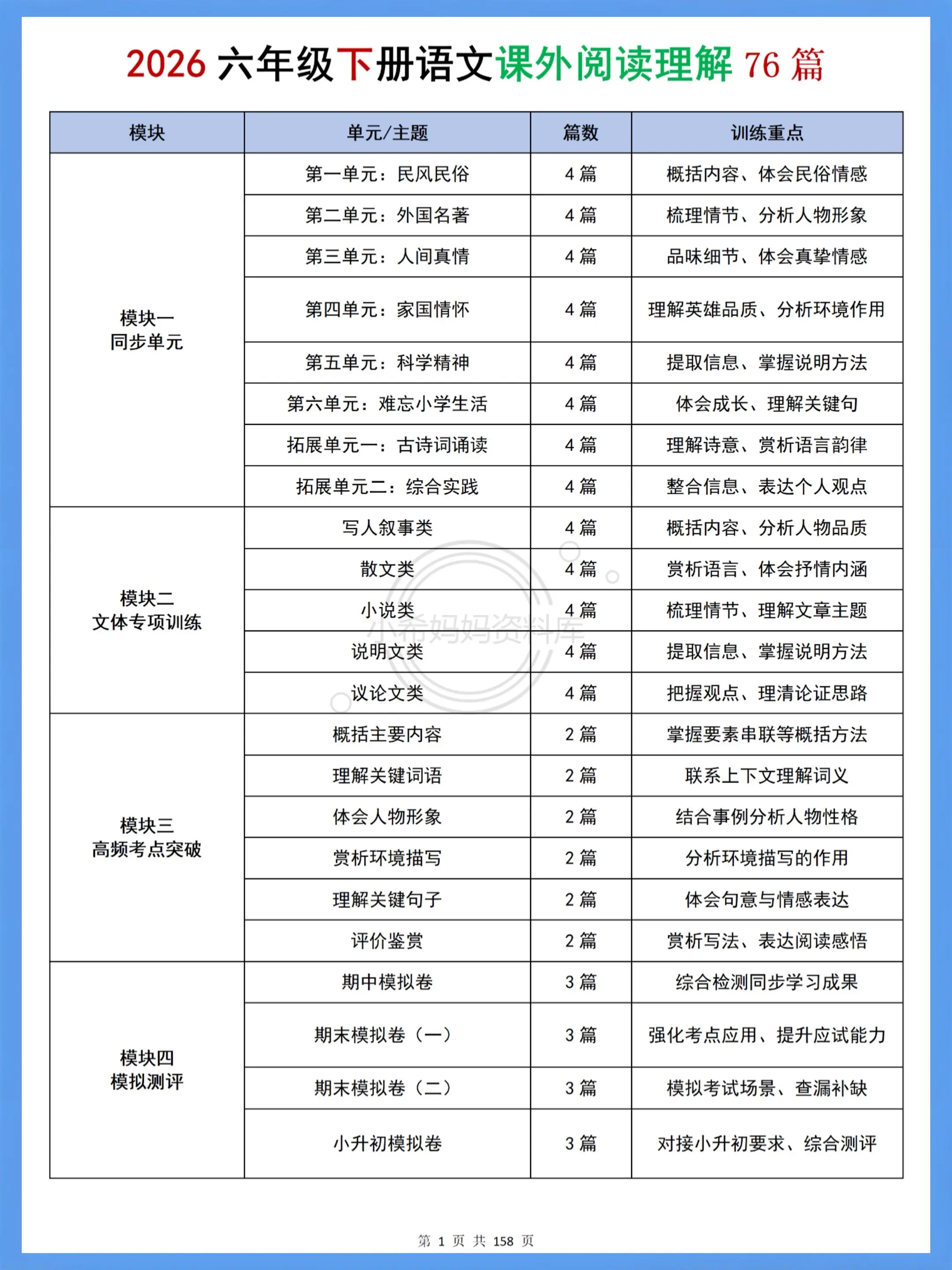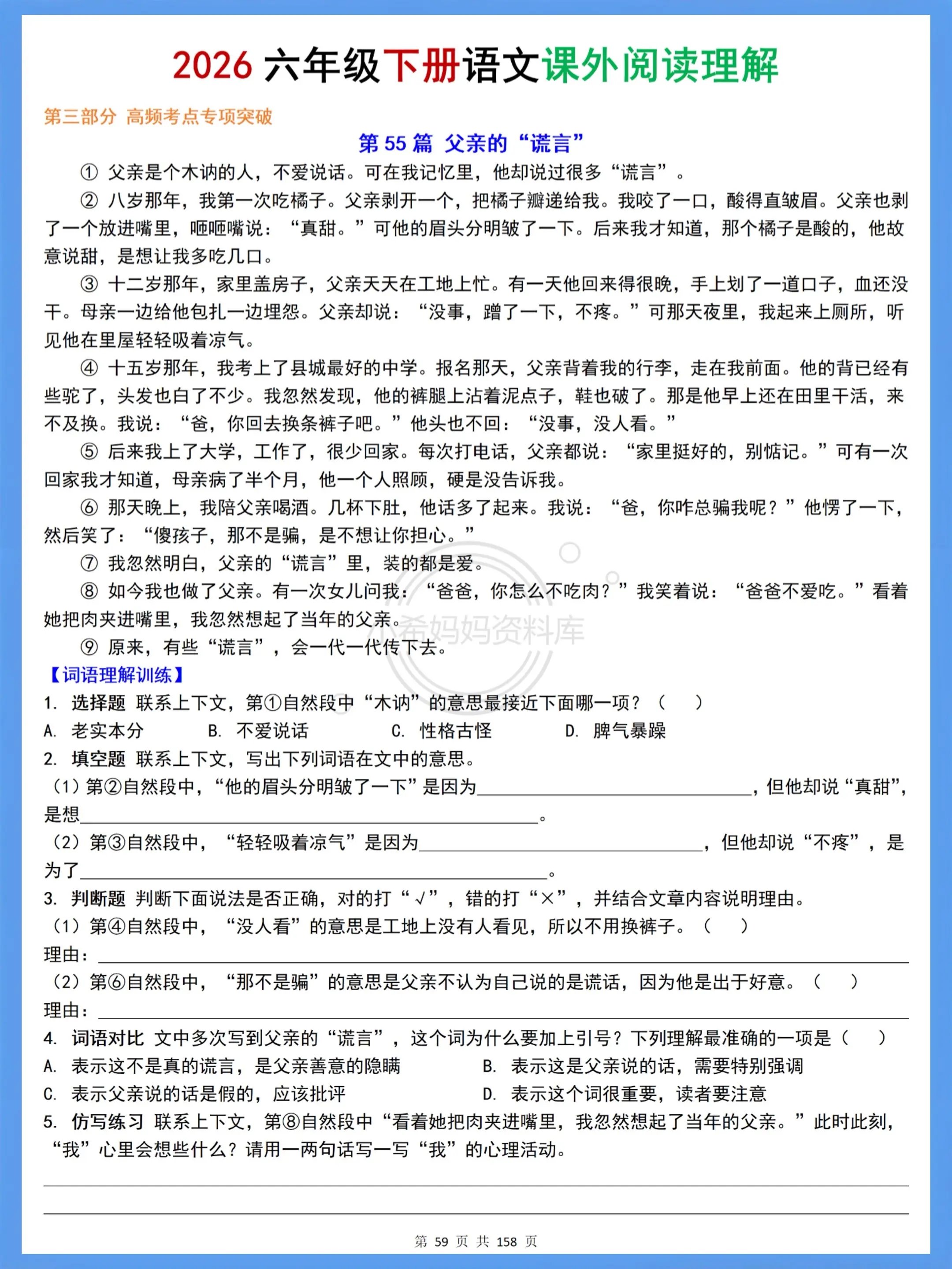 六下阅读救命神器|阅读丢分快刷它📚。六年级下册阅读总拖后腿?这套资料直接封神! 对标部编版+小升初考点,题材超全: 民俗、名著、亲情、说明文、议论文全覆盖 每篇带详细答题模板,概括/赏析/主旨都教 学生自学能懂,家长辅导不头疼,老师可当讲义 刷完阅读稳提分,小升初也不慌💯