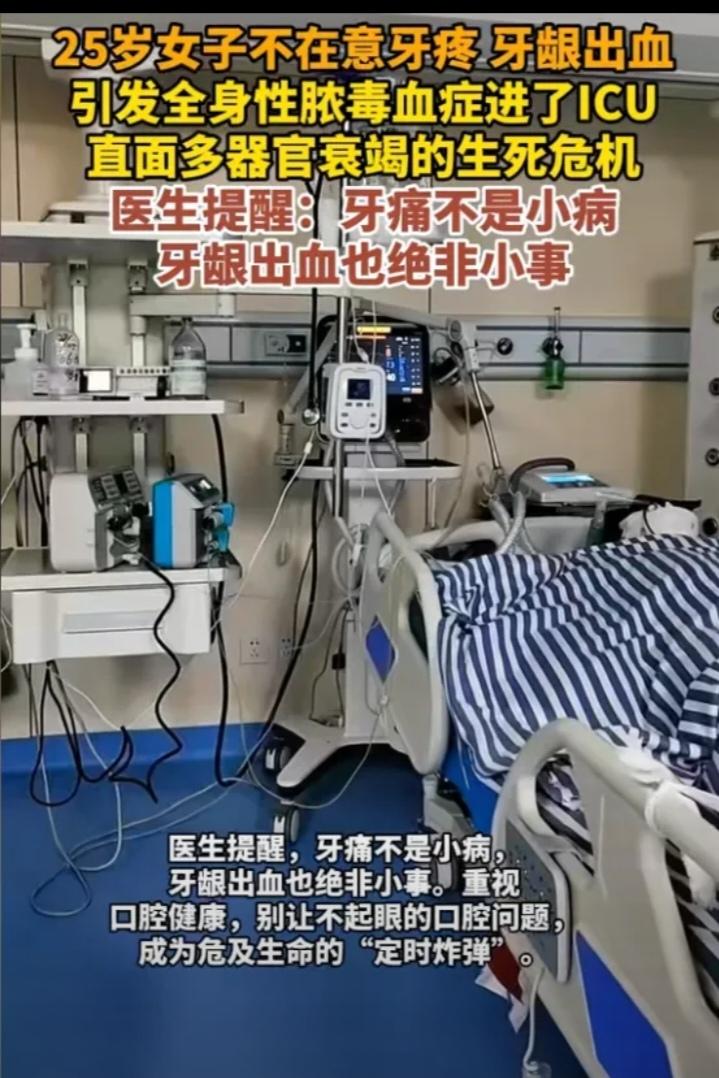 悲剧还是发生了!四川成都,一女子感觉牙疼,并且牙龈出血,但她以为是小毛病,便没有重视,没想到突然高热昏迷,引发了全身性脓毒血症,被紧急送入 ICU,直面多器官衰竭的生死危机!网友:别把牙齿问题当小事! 生活里多数人都碰到过牙疼和牙龈出血,觉得没啥大事,忍一忍就好,可口腔里的细菌很容易侵入血液扩散全身,甚至会威胁生命。 据媒体3月20日报道,25岁女子被牙疼和牙龈出血困扰,但总觉得没啥大事,所以没有做检查也没有规范治疗,将这件事抛之脑后。没想到女子突发高烧,并且浑身乏力,还出现了意识模糊,被家人送医检查后,确诊为全身性脓毒血症,直面多器官功能衰竭的危机,情况万分危急。 医生最终锁定的"致命元凶",就是女子不在意的小毛病牙痛与牙龈出血,这种被忽视的口腔问题,恰恰是引爆全身性脓毒血症的致命导火索。医院立刻展开重症抢救,经过医护人员一周的救治,女子才成功脱离生命危险。 网友看后表示,谁能想到牙齿问题能引发这么大的危机,平时真是小瞧了这个危害,看来身体有任何毛病都不能忽视,及时看医生才是正确的选择! 很多人都有过类似的经历,刷牙出血、牙齿隐隐作痛,总觉得扛两天就能好,要么随便吃点消炎药,压根不往心里去。大家都没意识到,口腔是细菌进入身体的一大通道,小小的伤口和炎症,会让病菌顺着血液流遍全身,慢慢侵蚀内脏器官。 牙痛真不是小病,牙龈出血也绝对不是小事,很多人就是抱着侥幸心理,把小问题拖成大麻烦,最后付出惨痛代价。日常再忙再不在意,只要口腔出现异常疼痛、反复出血、红肿发炎,都要第一时间就医检查,别等身体发出危险信号才后悔。健康从来没有小事,一个不起眼的细节,都可能关系到生命安全。 各位读者你们怎么看?欢迎在评论区讨论。