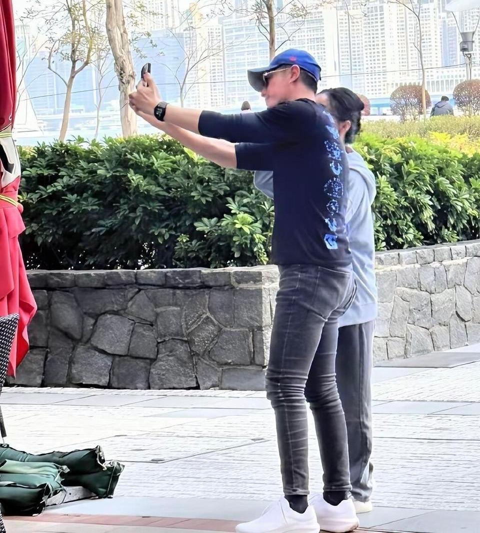 上半身穿着T恤衬衫脸上戴着墨镜,看着很酷,下半身穿着一条洗的发白还有破洞的紧身牛仔裤,被网友吐槽像“村口华哥。”