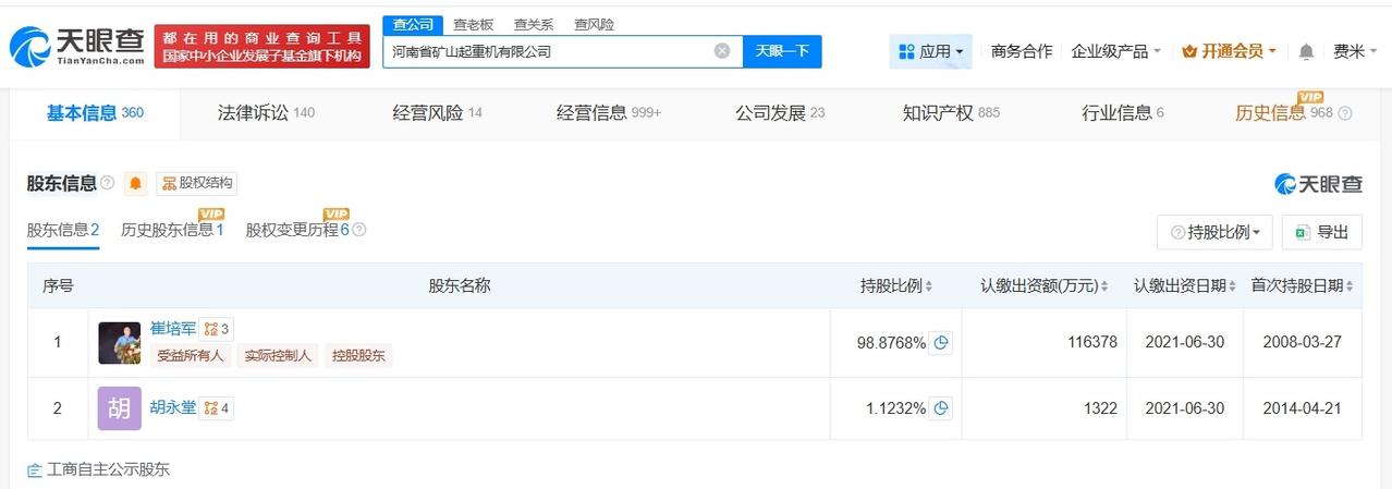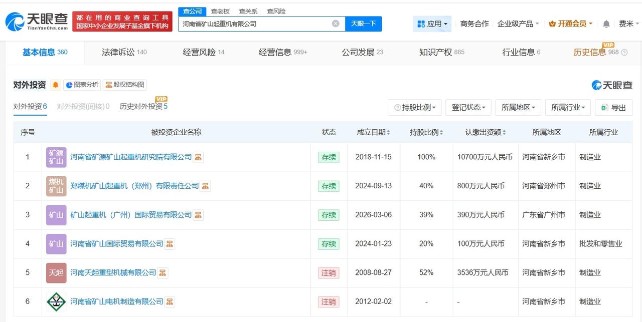 天眼查App显示,河南省矿山起重机有限公司成立于2002年9月,法定代表人为崔培军,注册资本约11.8亿人民币,经营范围包括特种设备制造、特种设备设计、电机制造等,由崔培军、胡永堂共同持股。对外投资信息显示,该公司对外投资6家企业,其中4家企业处于存续状态,包括河南省矿源矿山起重机研究院有限公司、郑煤机矿山起重机(郑州)有限责任公司等。