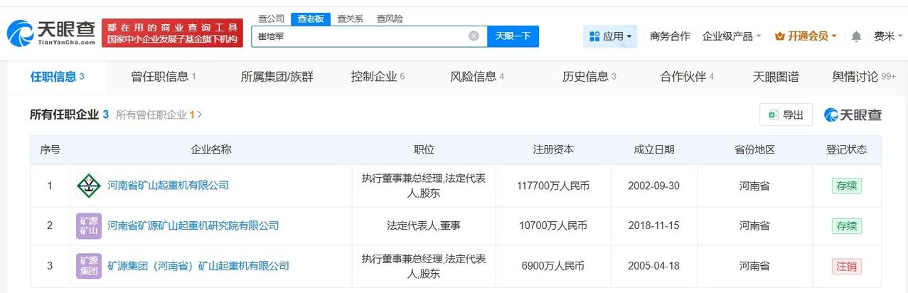 值得一提的是,崔培军名下关联3家企业,其中2家企业处于存续状态,分别是河南省矿山起重机有限公司、河南省矿源矿山起重机研究院有限公司,崔培军在上述企业担任执行董事兼总经理、法定代表人等职务。