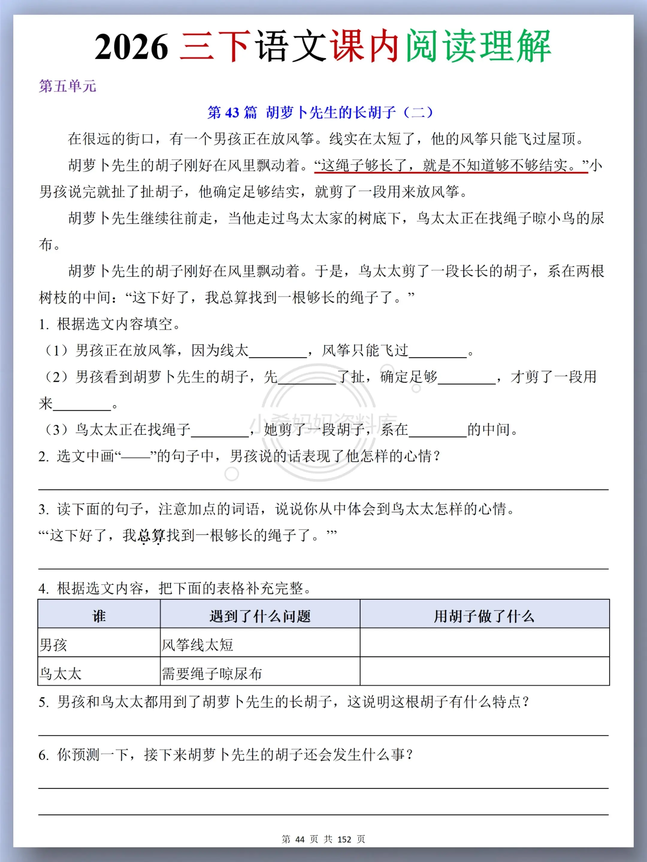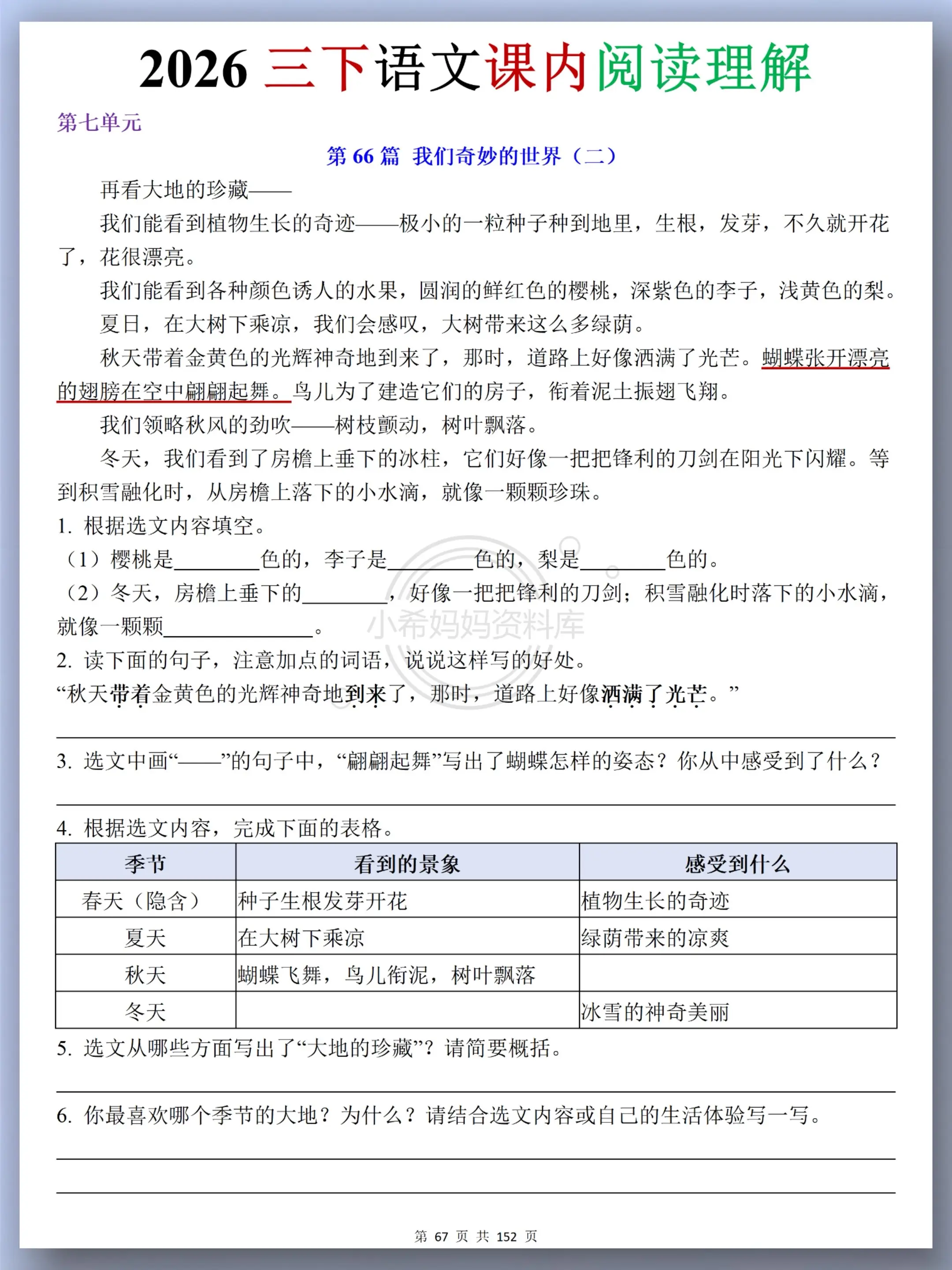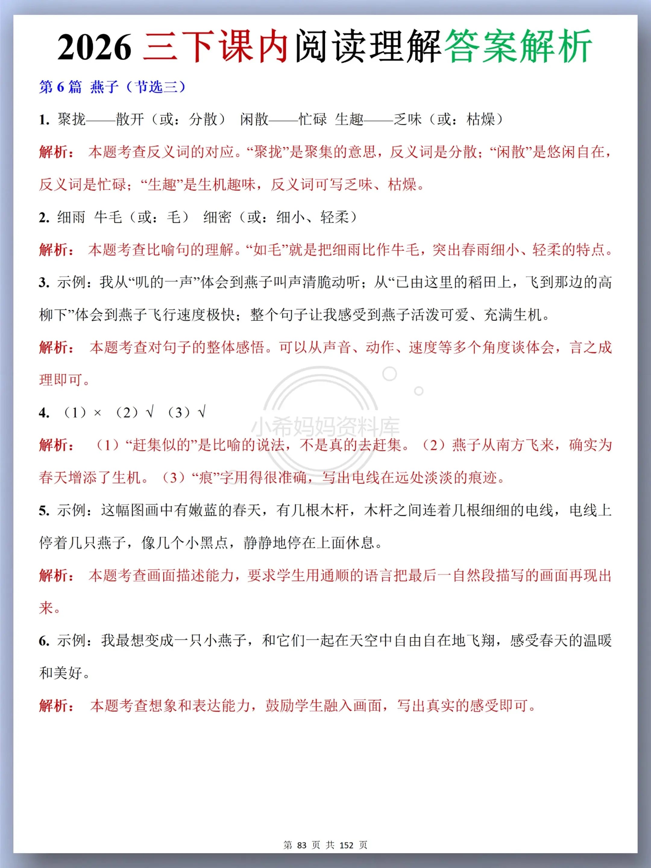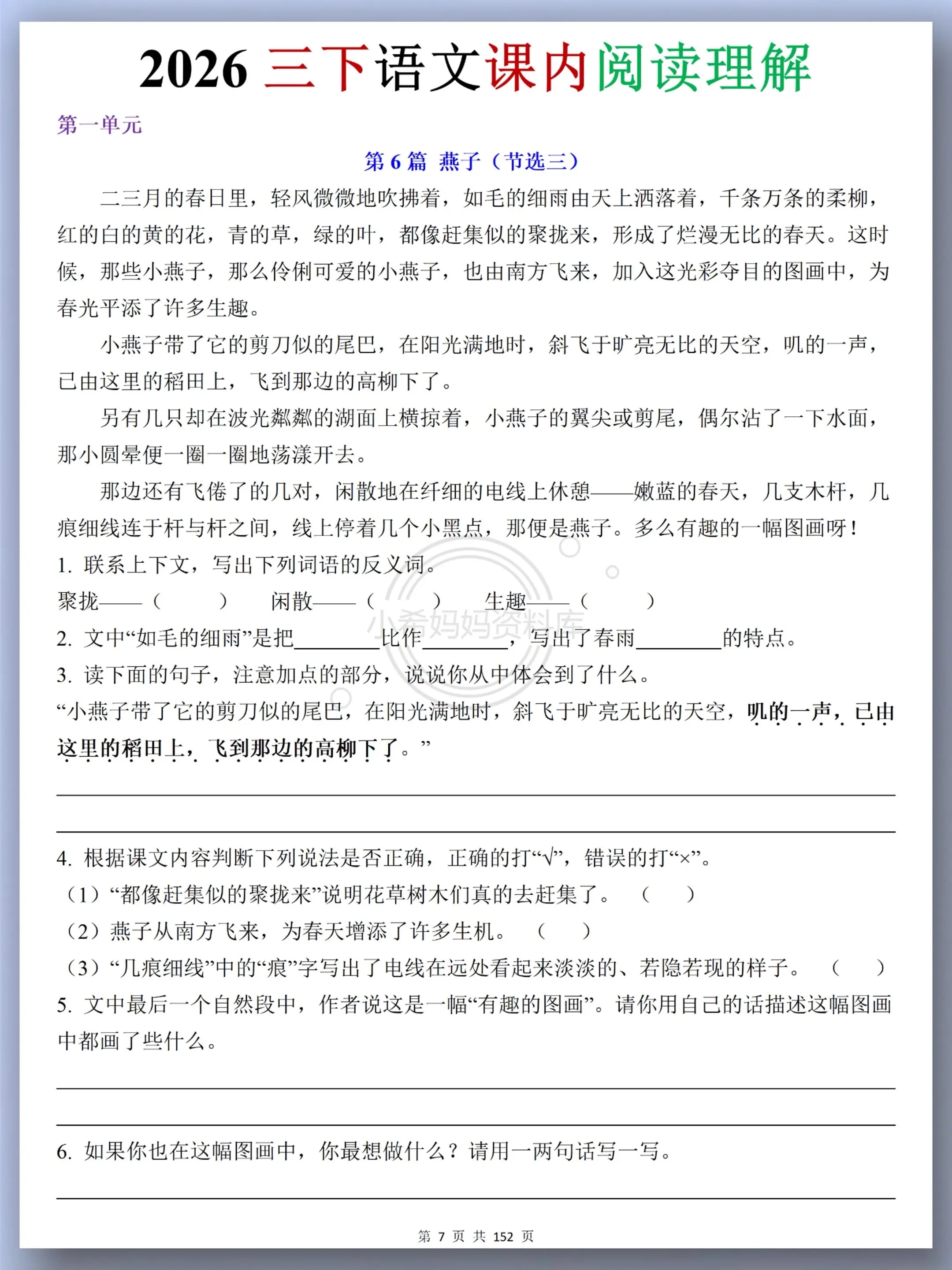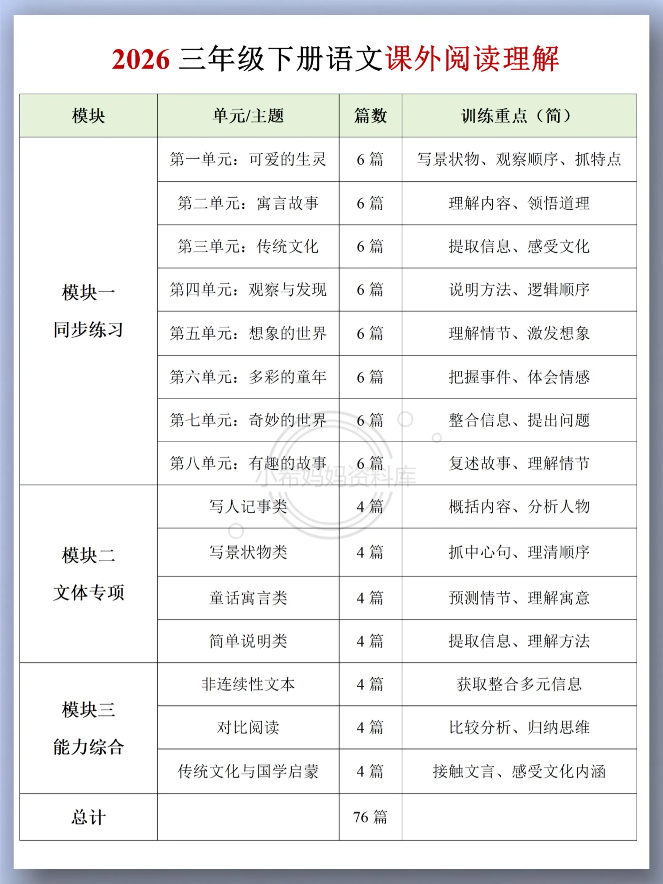 2026三下语文宝藏|课内阅读提分神器❗。三下课内阅读直接躺赢!这套资料绝了~ 2026最新同步,8单元75篇全覆盖,古诗、寓言、童话全包含!每篇都带逐题详解,基础、赏析、拓展题全拿捏,考点不跑偏~ 孩子自学能搞定,家长辅导不费妈,预习复习一站式通关,期末阅读稳拿高分!