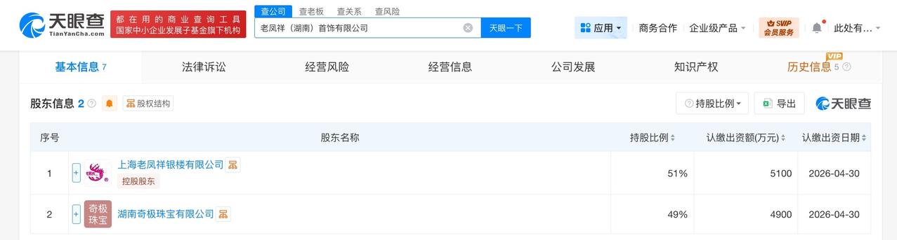 天眼查工商信息显示,近日,老凤祥(湖南)首饰有限公司成立,法定代表人为王晨,注册资本1亿人民币,经营范围包括珠宝首饰批发、珠宝首饰零售、金银制品销售、钟表销售等。股东信息显示,该公司由老凤祥(600612)旗下上海老凤祥银楼有限公司、湖南奇极珠宝有限公司共同持股。