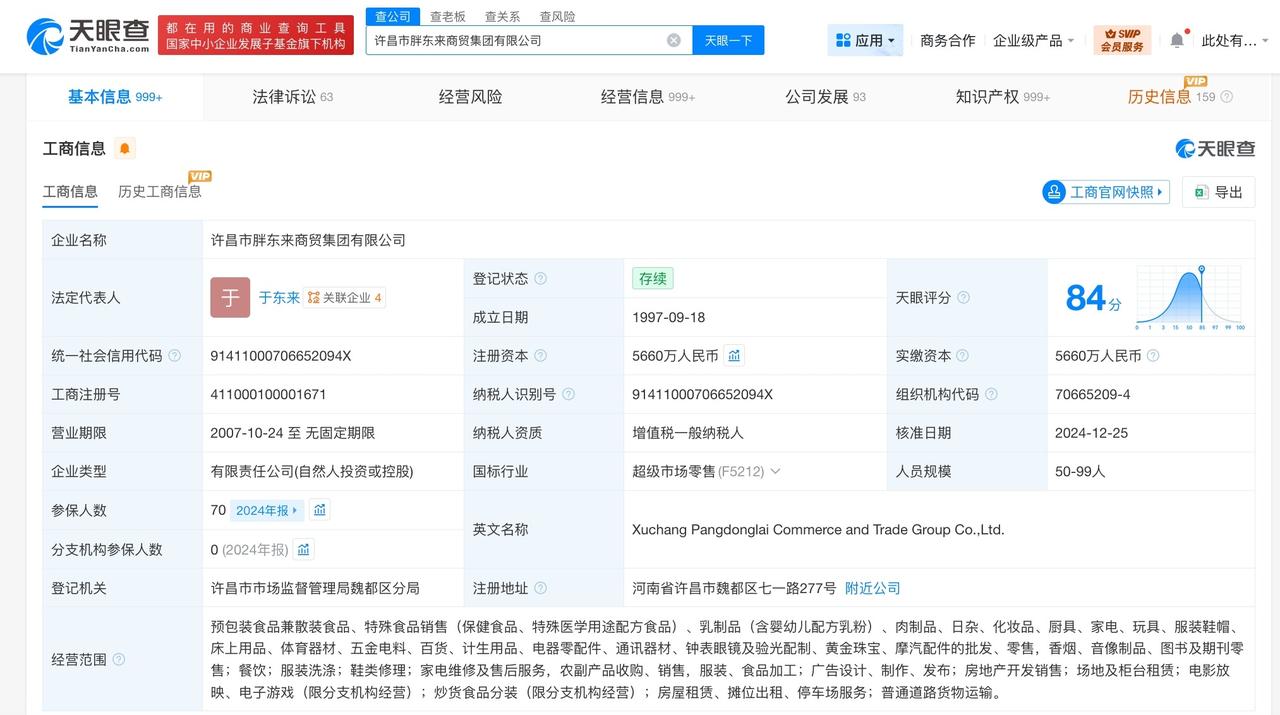 许昌市胖东来商贸集团有限公司成立于1997年9月,法定代表人为于东来,注册资本5660万人民币,经营范围含预包装食品兼散装食品、特殊食品销售、房地产开发销售等。股东信息显示,该公司由于东来、张春兰、于娟等共同持股。