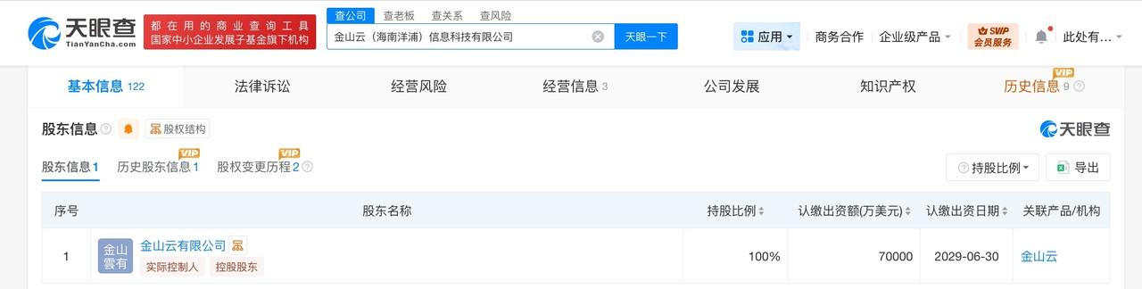 金山云海南洋浦信息科技公司增资至7亿美元 增幅约17%