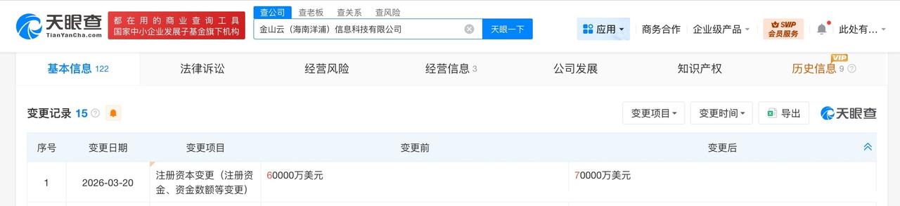 天眼查工商信息显示,近日,金山云(海南洋浦)信息科技有限公司发生工商变更,注册资本由6亿美元增至7亿美元,增幅约17%。